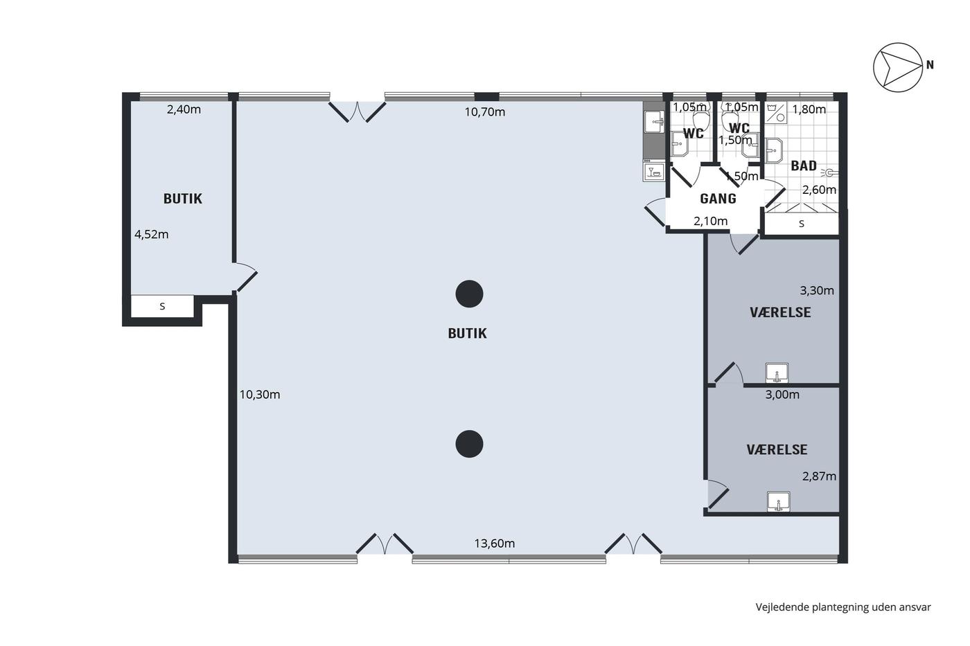 Lokalerne er istandsat og fremstår derfor utrolig flotte og anvendelige, og de egner sig perfekt som enten frisør eller klinik. Lige nu er lokalerne udlejet til en frisør, og her er god plads til både vaskestole, frisørstole, spejle og reoler med god plads til udstilling af diverse produkter. Rummets imponerende størrelse, kombineret med dets regulære udformning, giver nemlig et hav af indretningsmuligheder - samtidig er stilen lys og moderne, hvilket bidrager til en behagelig atmosfære. Udover det store og rummelige butikslokale venter et sideliggende butikslokale. Dertil kommer to lukkede rum, samt et badeværelse og to gæstetoiletter.