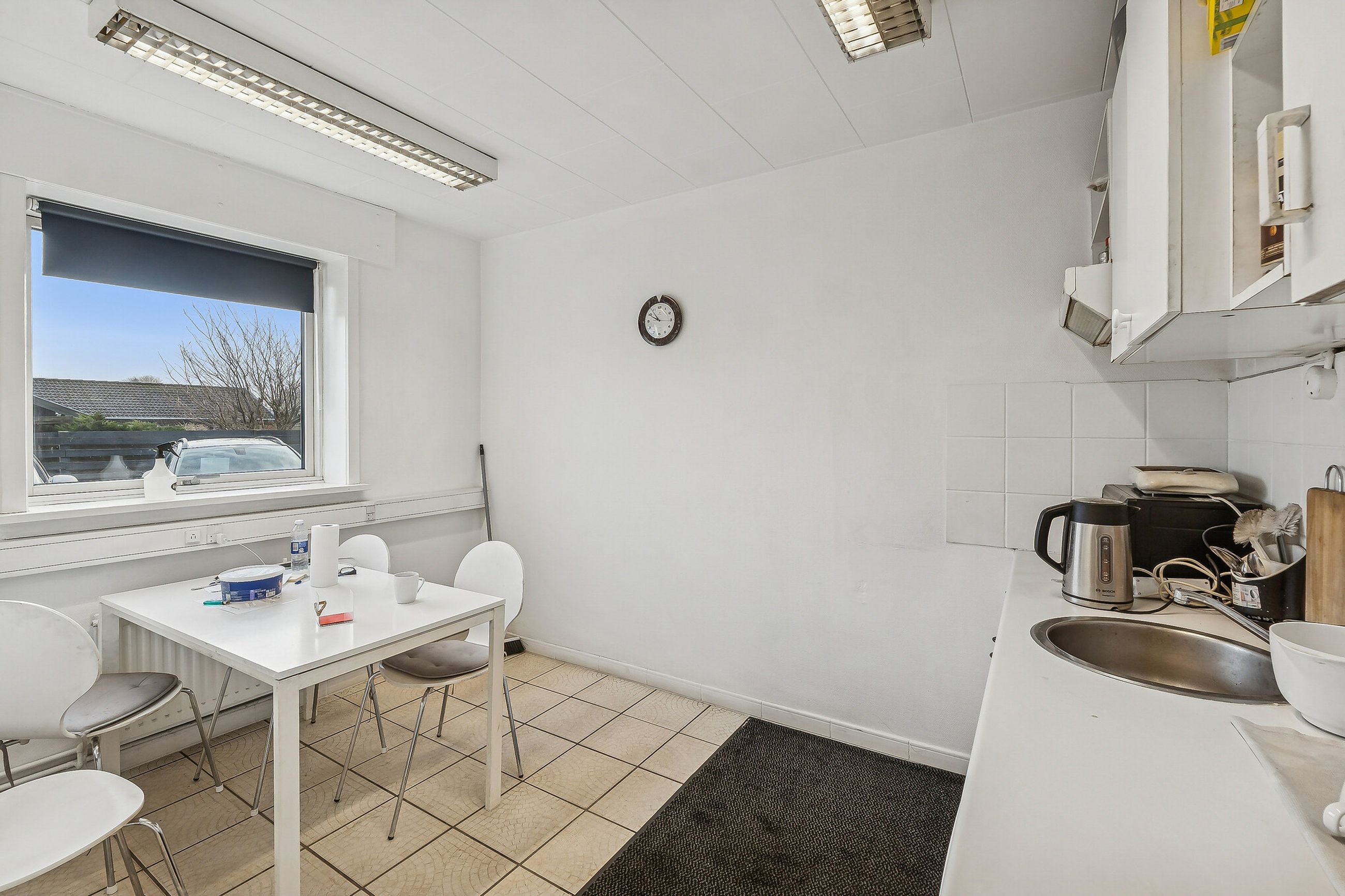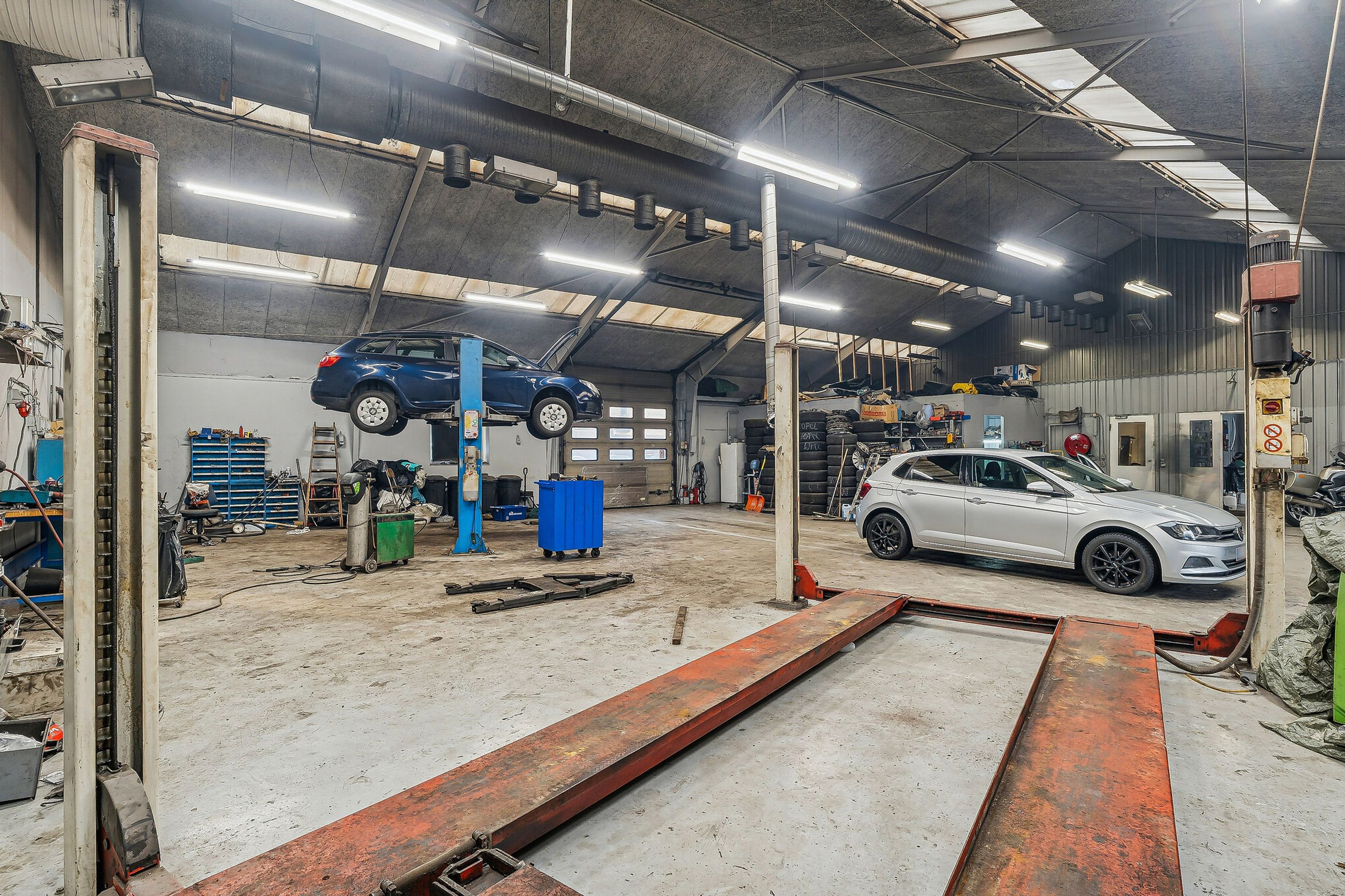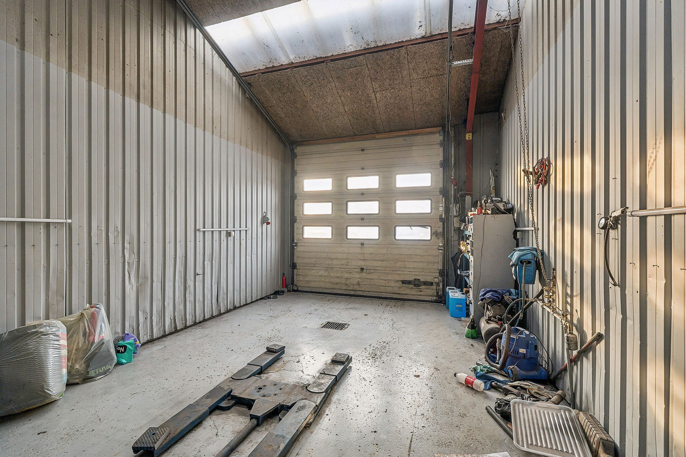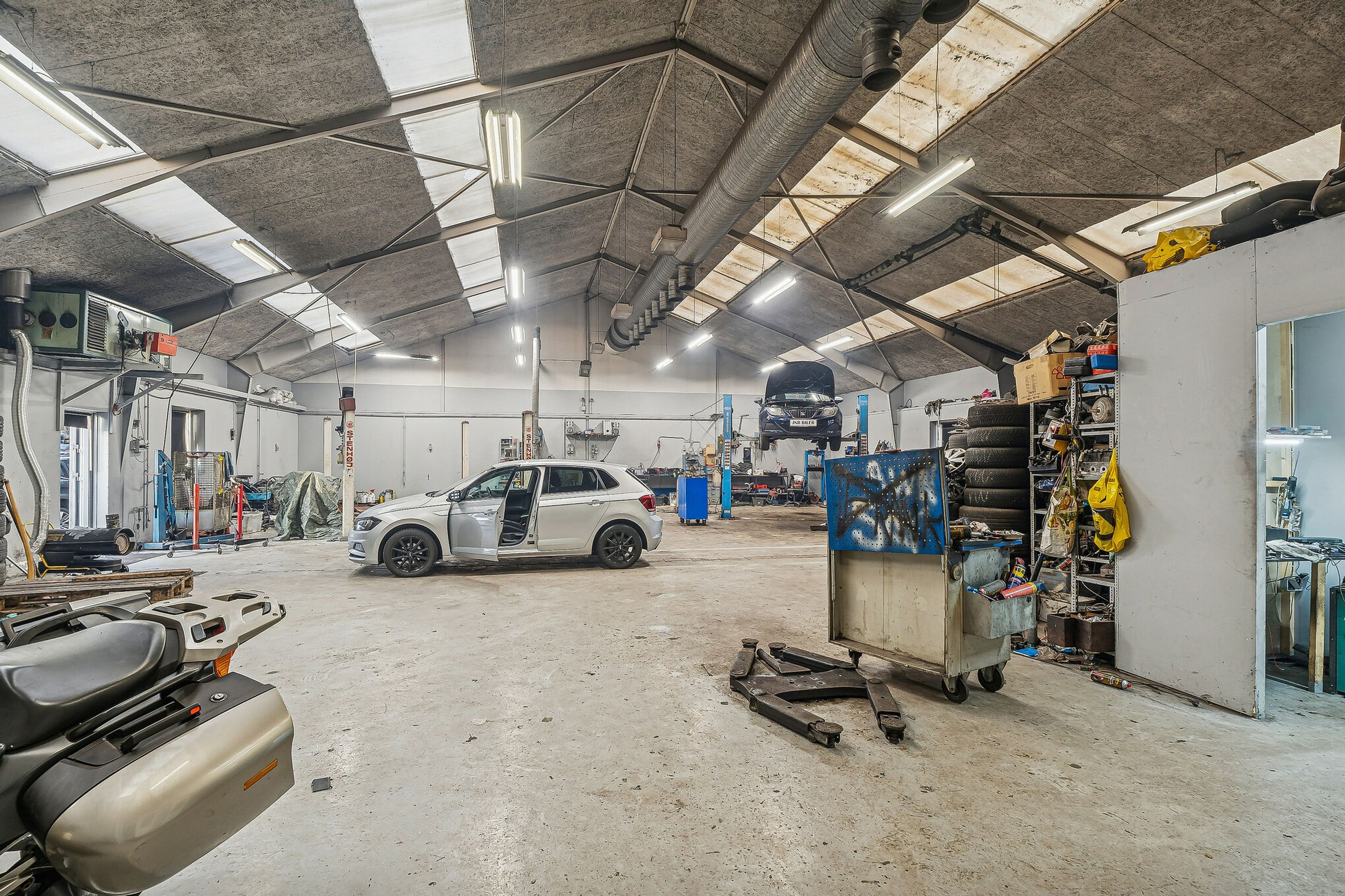 Indretningen er med et stort åbent værksted, hvor der er 4-6 meter til loftet og med port. Der er videre adgang til et mindre værksted med egen port, mandskabsrum, kontor samt frokoststue.