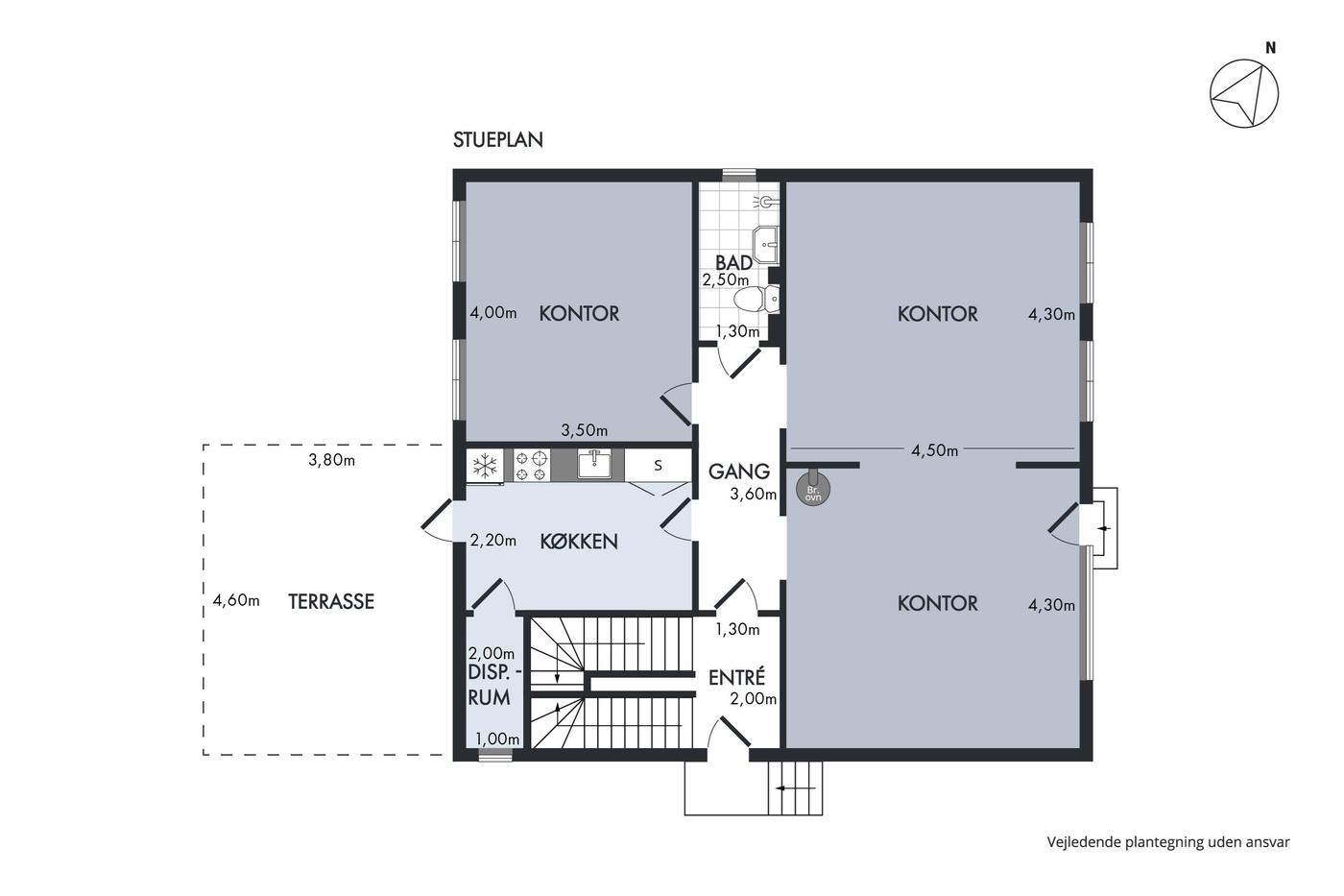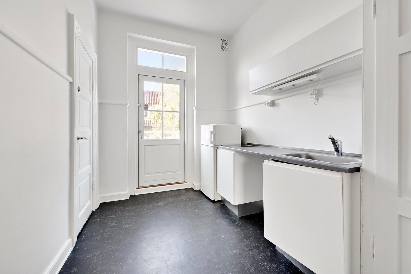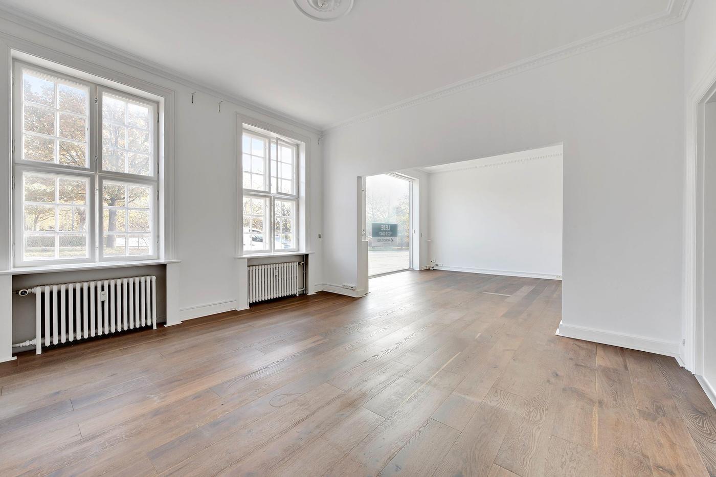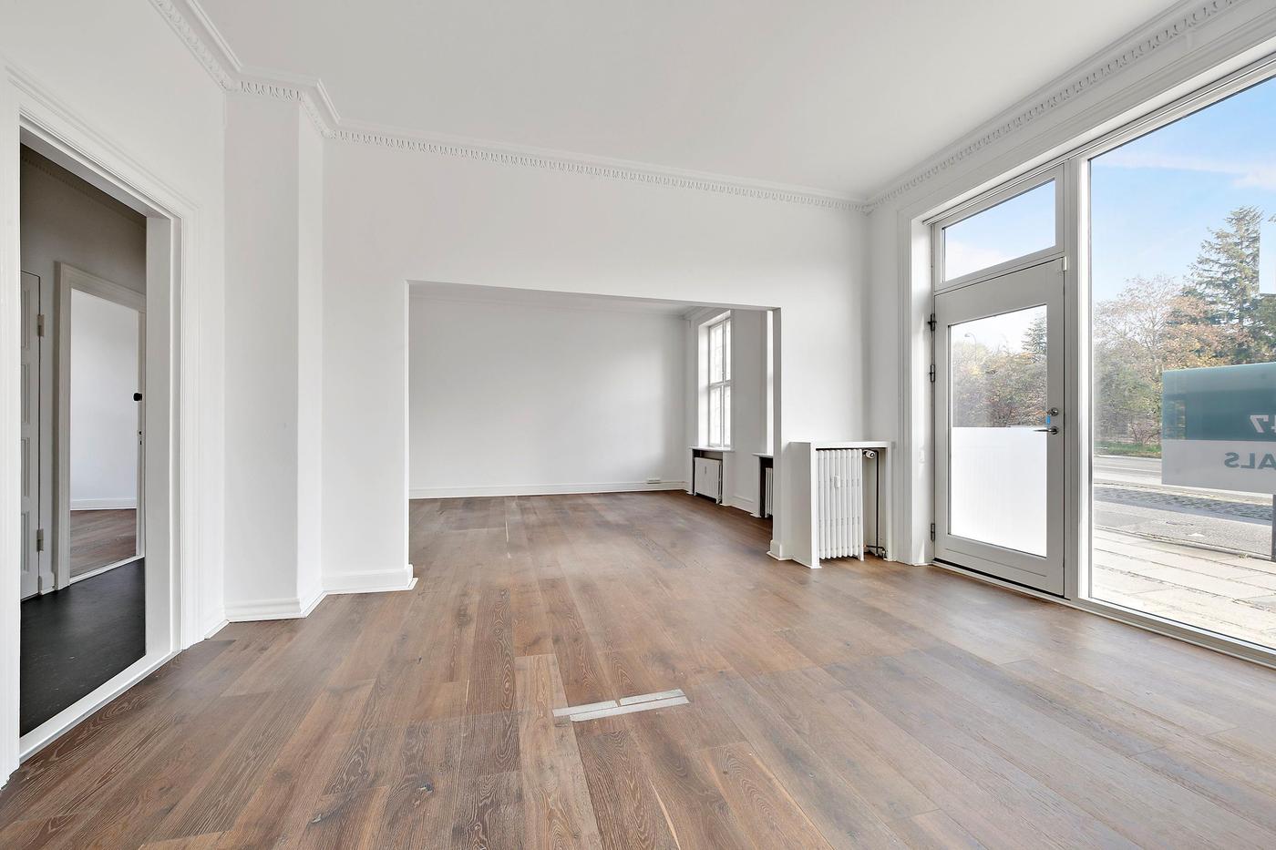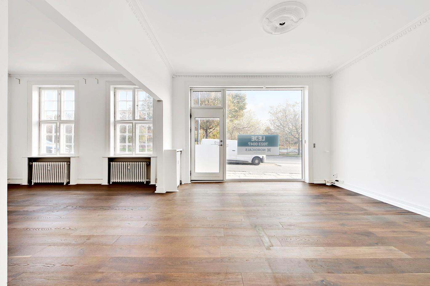 Den gode planløsning indeholder tre lokaler i stueplan, som alle byder på en diskret stuk i loftet. Her kan man f.eks. indrette flere kontorer, mens det også er muligt at etablere et mødelokale. På etagen finder man tilmed praktiske faciliteter, såsom et velholdt badeværelse, og der er opført et køkken med adgang til et disponibelt rum. Den store sydvestvendte terrasse er endnu et plus ved erhvervslejemålet, der inviterer til en fredelig kaffepause i solen.