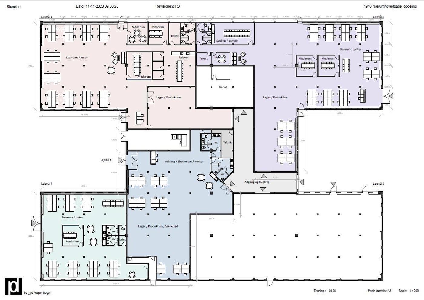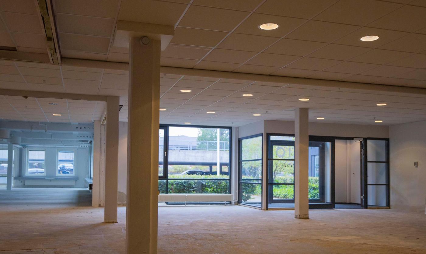 I denne ejendom, er der en sjælden mulighed for at kombinere behovet for kontor med lager og showroom. Du kan få det hele samlet på samme etage, og derved sørge for at samle både produktion, lager og kontor. Lejer har stor indflydelse på, hvordan arbejdsfordelingen skal være imellem de enkelte aktiviteter. Kontor og administration kan f.eks placeres helt naturlig langs facaderne, hvor de store vinduespartier sikrer et behageligt lysindfald. Det er muligt at køre direkte til døre og porte og transportere varer ind og ud på pallevogn. Skal du bruge større faciliteter end det, så lad os drøfte mulighederne for at få det tilpasset dine behov Loftshøjden bliver 2,83 meter efter nedtagning af nedsænkede lofter og 2,54 under drager. Det ledige areal er placeret i stueetagen og kan kombineres på utallige måder.