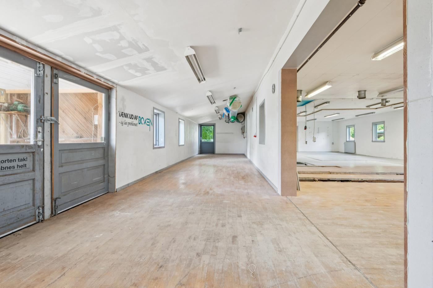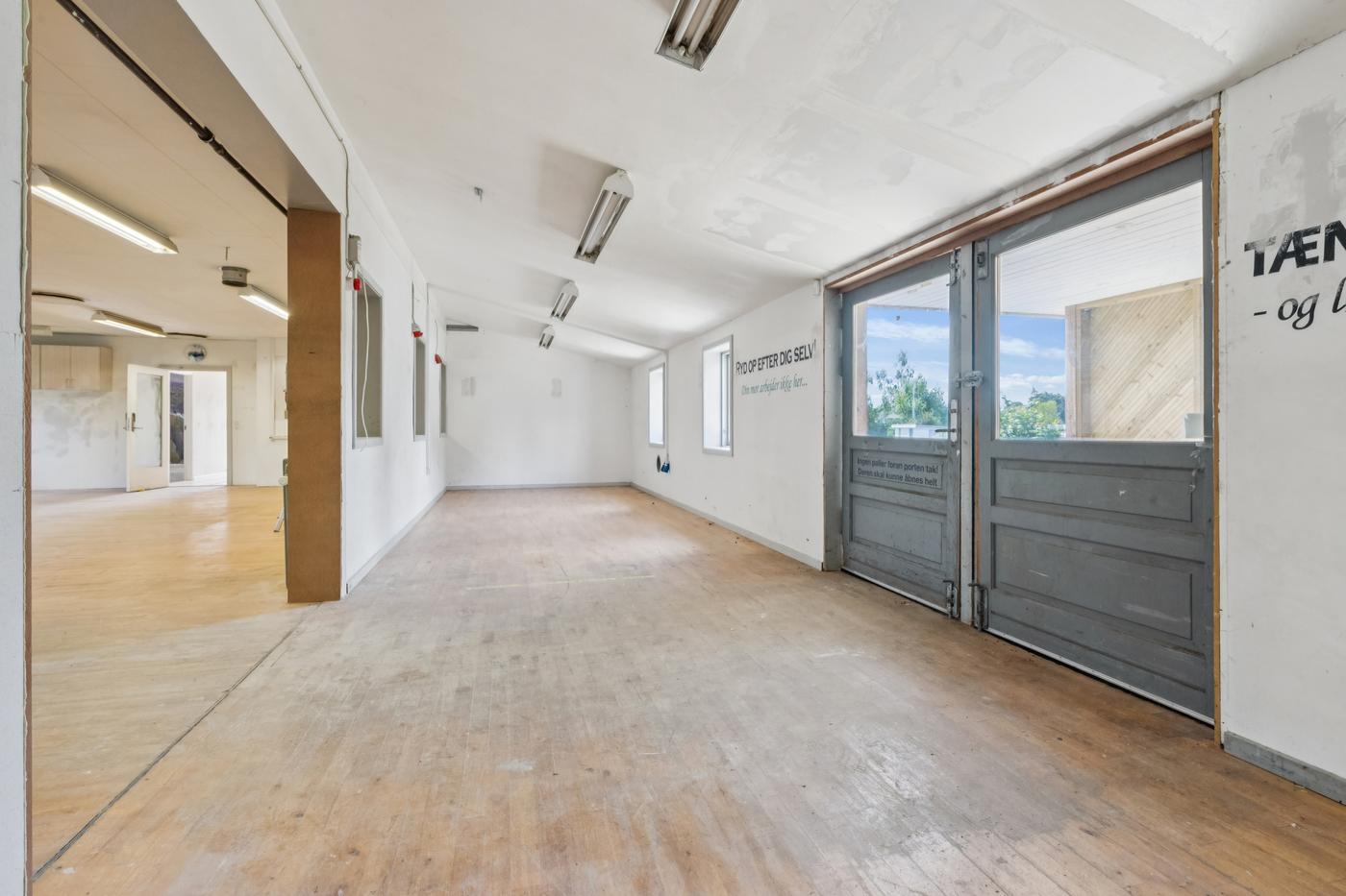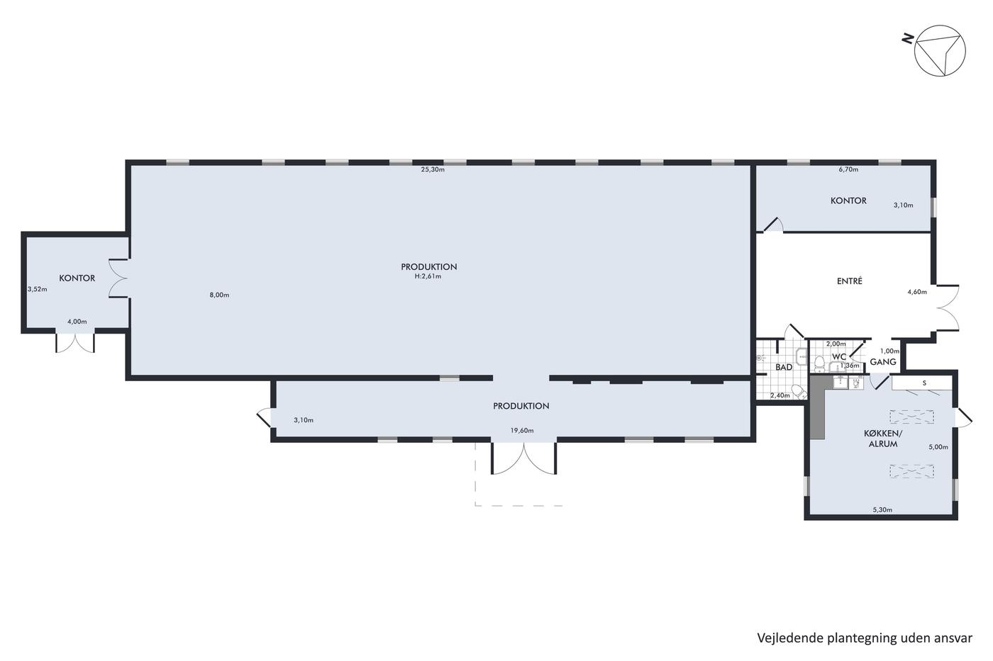 Ejendommen er indrettet med rummelige produktionshaller, flere kontorer, køkken/alrum samt bad og toilet. Planløsningen giver gode muligheder for både administration, let produktion, værkstedsdrift eller kombination af flere funktioner. Der er gode adgangsforhold samt plads til oplag og parkering på grunden.