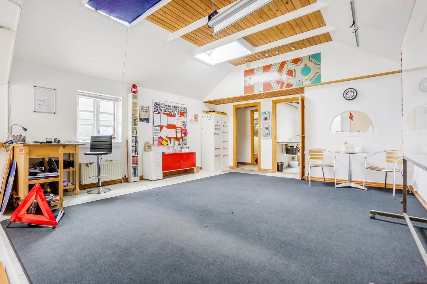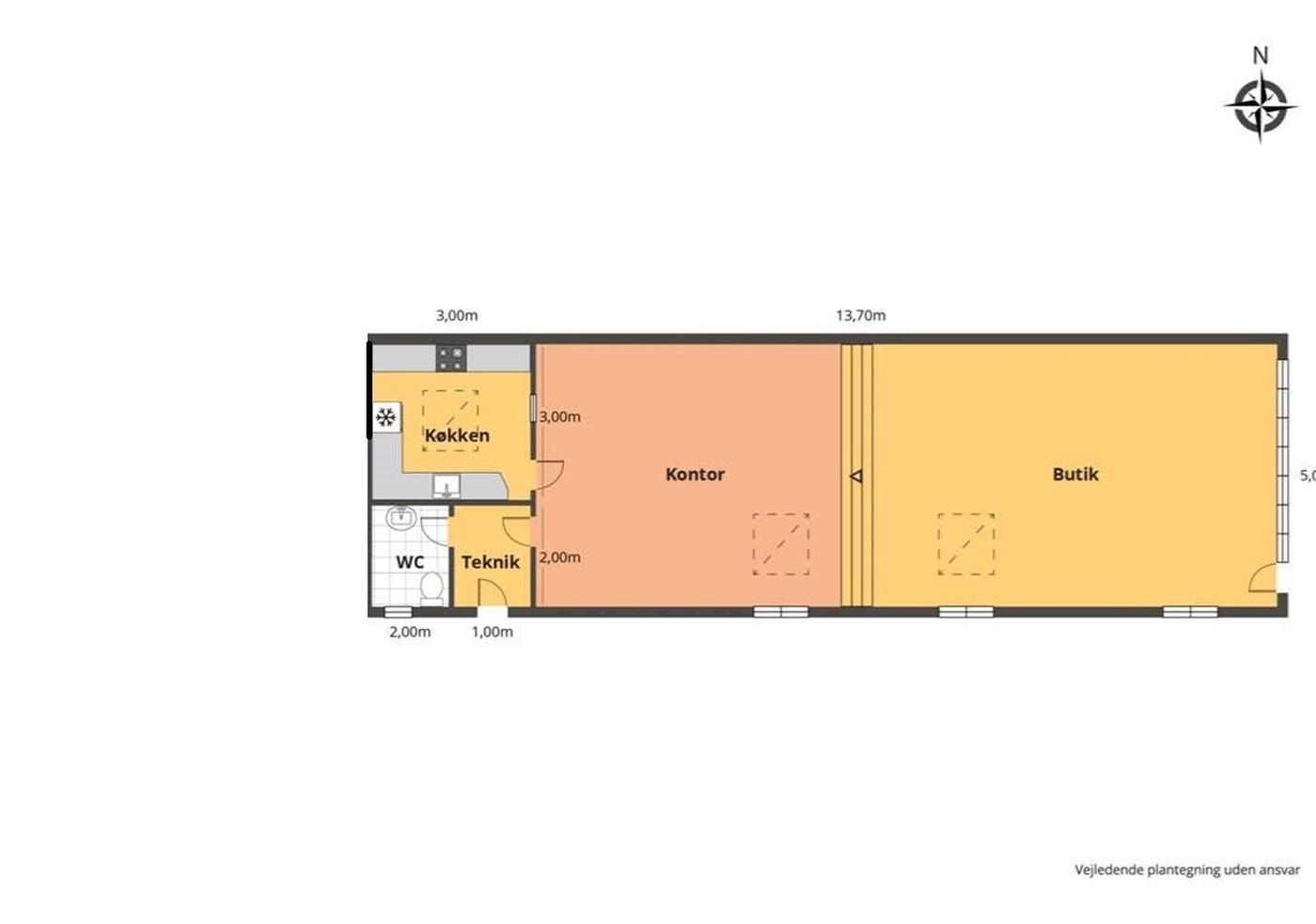 Lejemålet består af en separat bygning i pæn og velholdt stand med følgende planløsning: Stort ~lokale velegnet til undervisning, showroom, café mv., kontor, køkken og toilet.