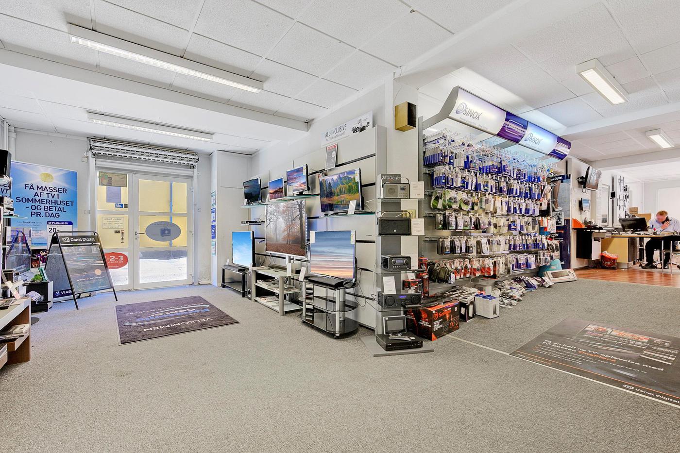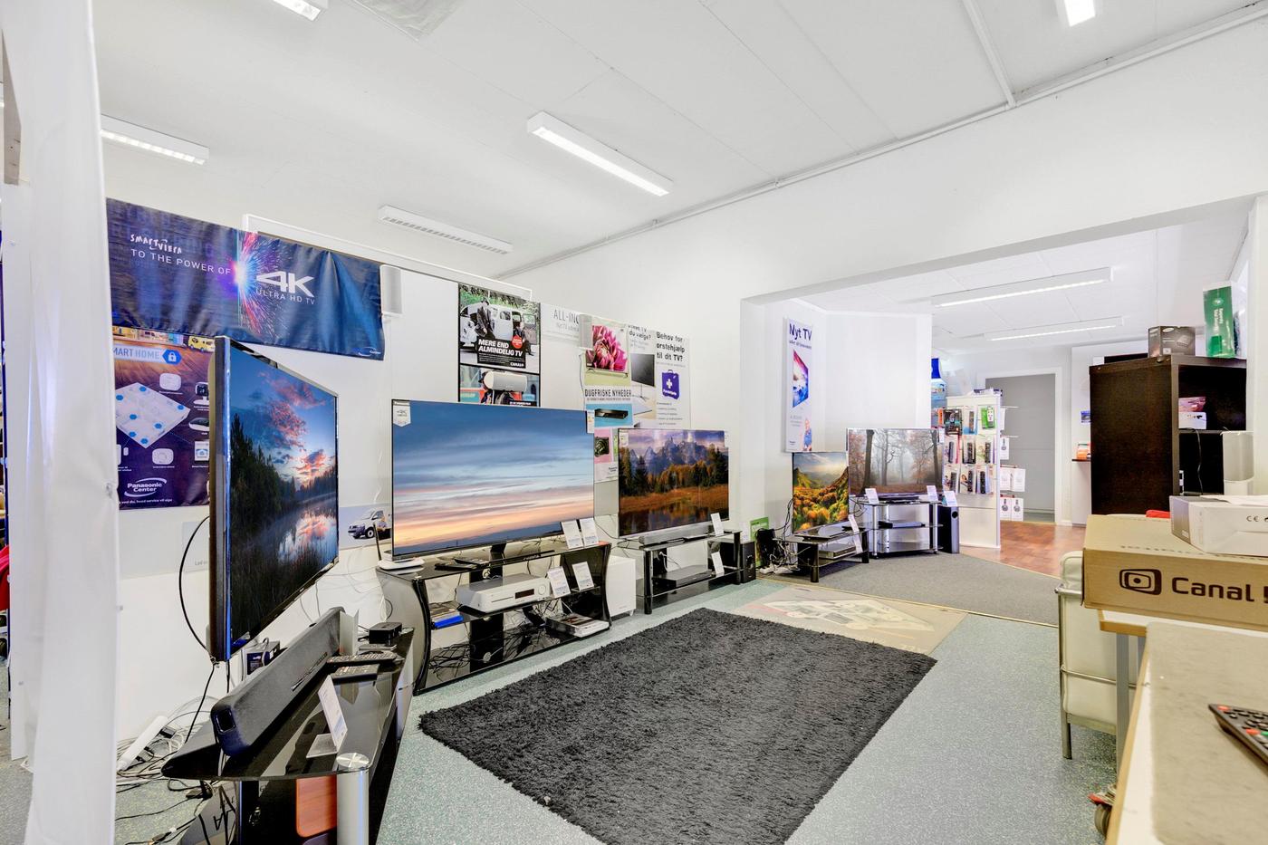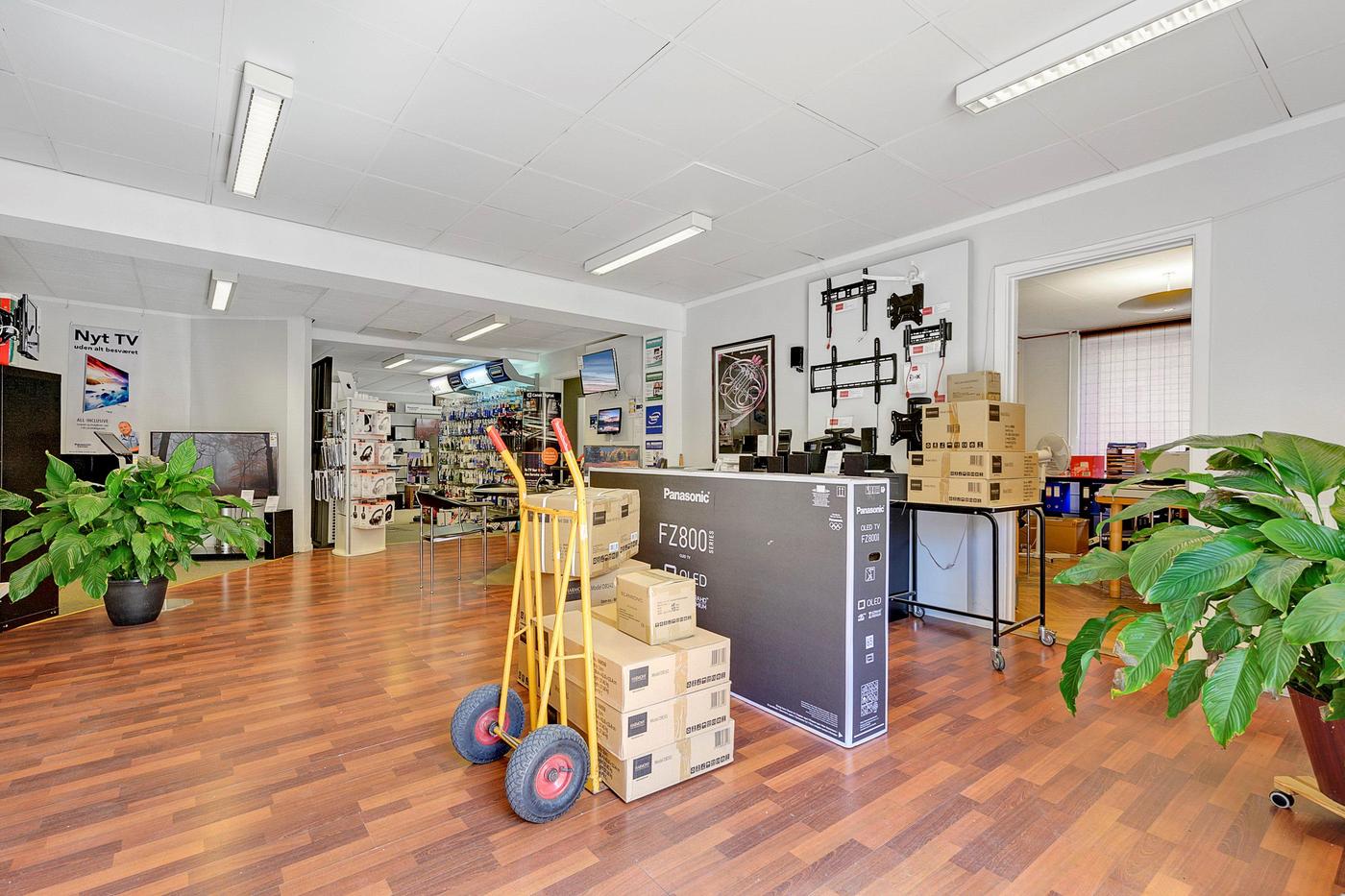 393 m2 er der at gøre godt med fordelt på én solid etage. Der er tale om et stort, sammenhængende butikslokale i åben forbindelse med et endnu større lagerområde, og derudover finder man garage, køkken, kontor og toiletter på matriklen. Overalt er der et godt flow med sammenhæng i alle rum, men hvis man tænker ud over den nuværende planløsning, kan man også sagtens åbne op og skabe en helt ny oplevelse. Erhvervslokalerene er udlejet til en veletablerer radio- og TV butik, og de er i ok stand med lyse indervægge og en gulmalet murstensfacade. Det er oplagt at blive ved med at holde butik eller værksted her, for placeringen midt i byen gør eksponeringen helt ideel.
