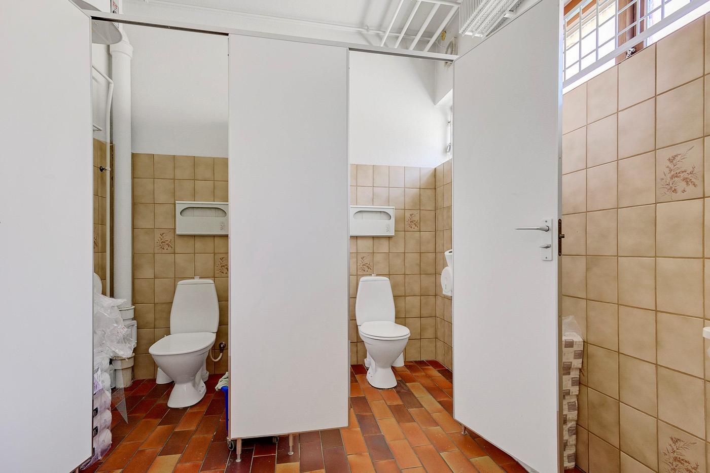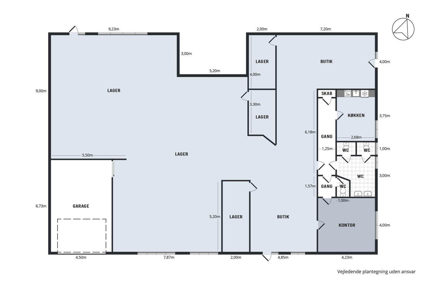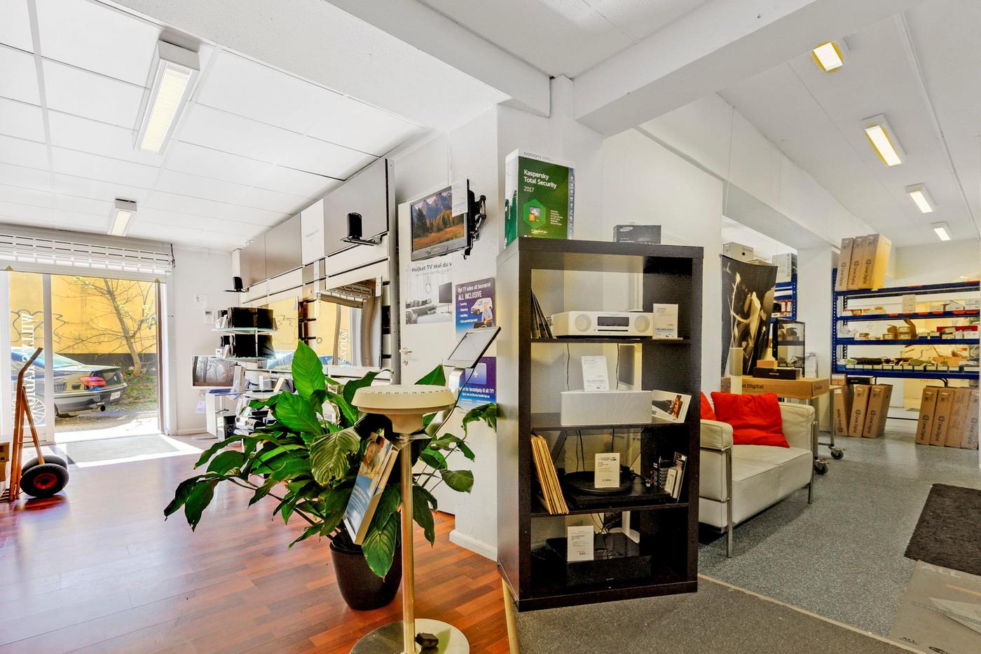 393 m2 er der at gøre godt med fordelt på én solid etage. Der er tale om et stort, sammenhængende butikslokale i åben forbindelse med et endnu større lagerområde, og derudover finder man garage, køkken, kontor og toiletter på matriklen. Overalt er der et godt flow med sammenhæng i alle rum, men hvis man tænker ud over den nuværende planløsning, kan man også sagtens åbne op og skabe en helt ny oplevelse. Erhvervslokalerene er udlejet til en veletablerer radio- og TV butik, og de er i ok stand med lyse indervægge og en gulmalet murstensfacade. Det er oplagt at blive ved med at holde butik eller værksted her, for placeringen midt i byen gør eksponeringen helt ideel.