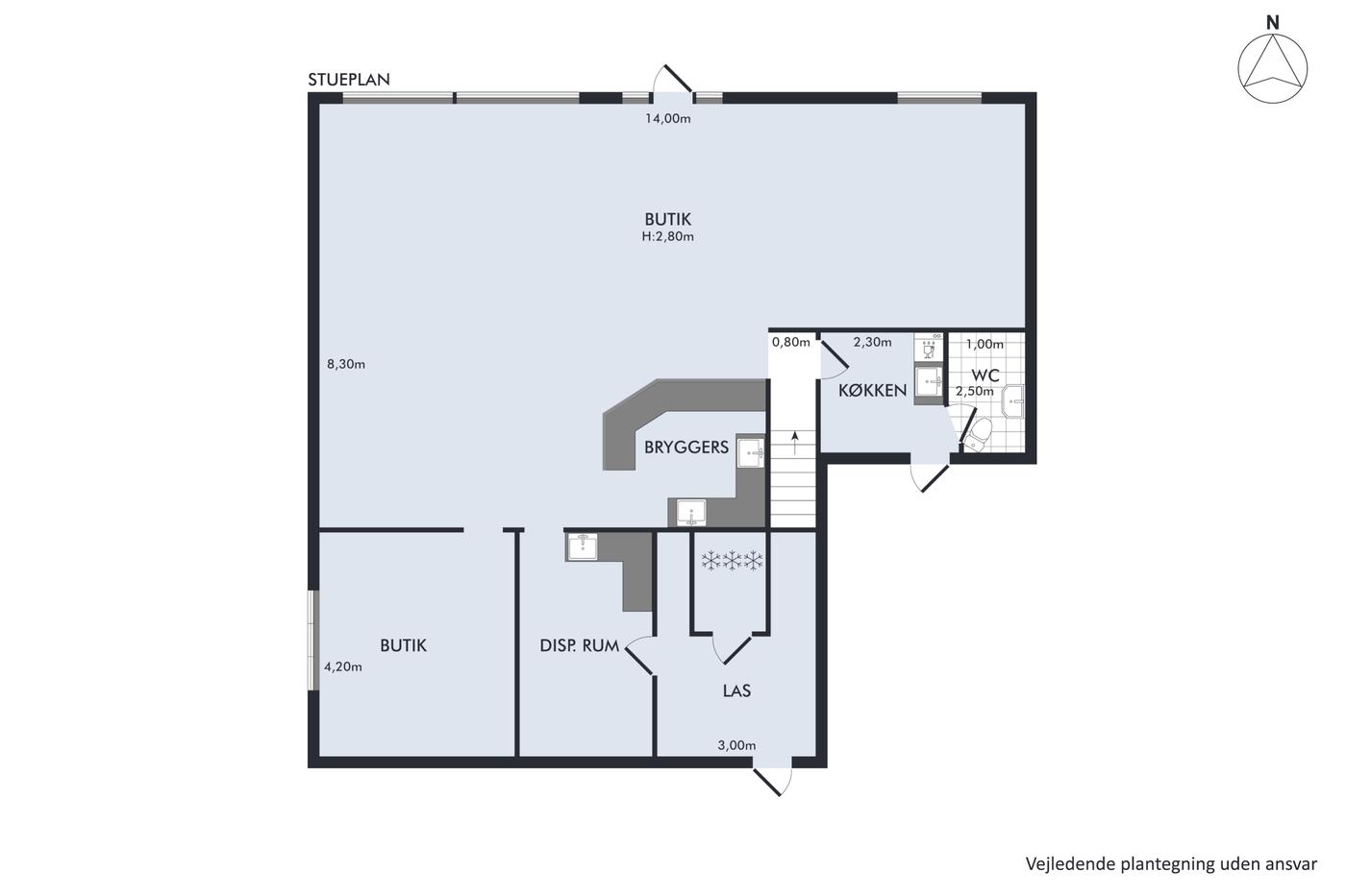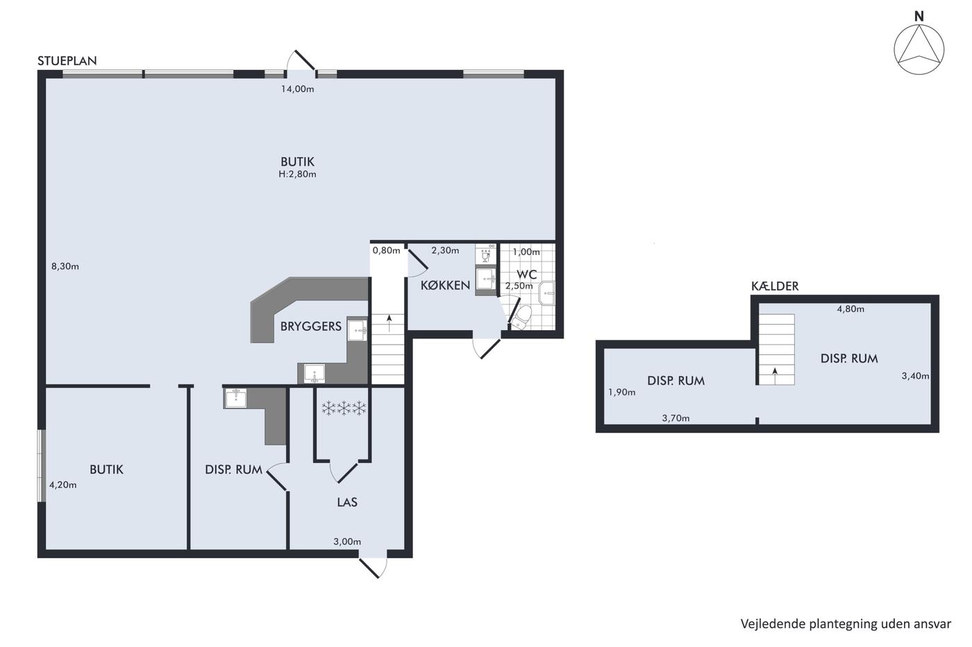Lejemålet består af ét stort butikslokale samt to mindre lokaler, der med fordel kan benyttes til kontor, butik eller lignende. Derudover findes et praktisk baglokale med køleboks samt en mindre, lavloftet kælder med gode opbevaringsmuligheder.