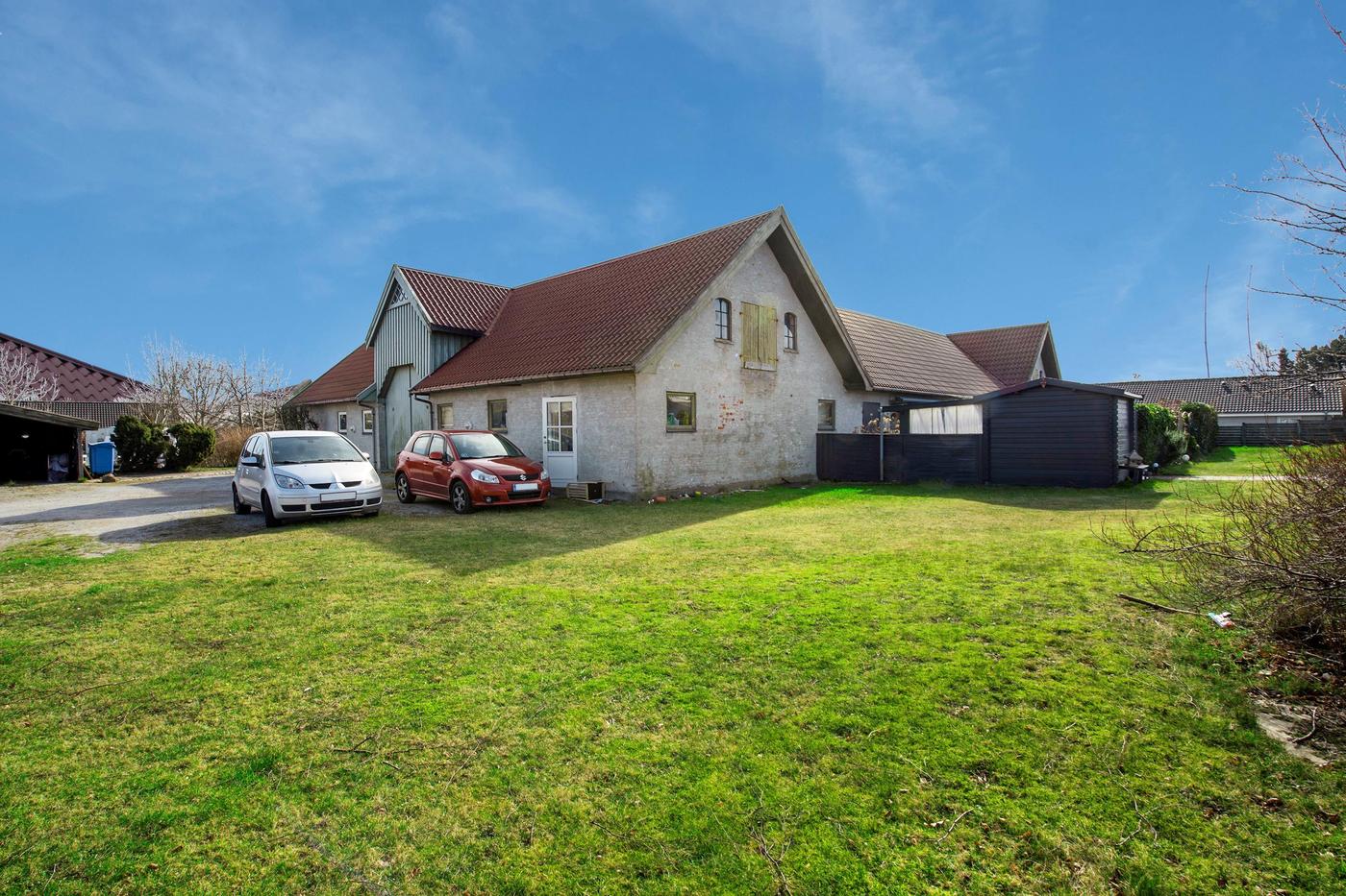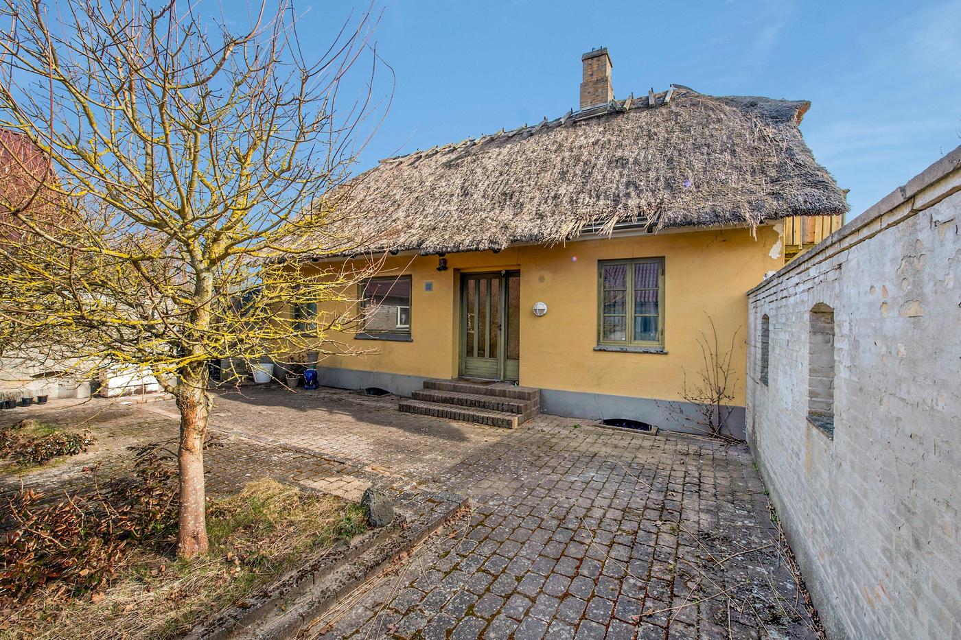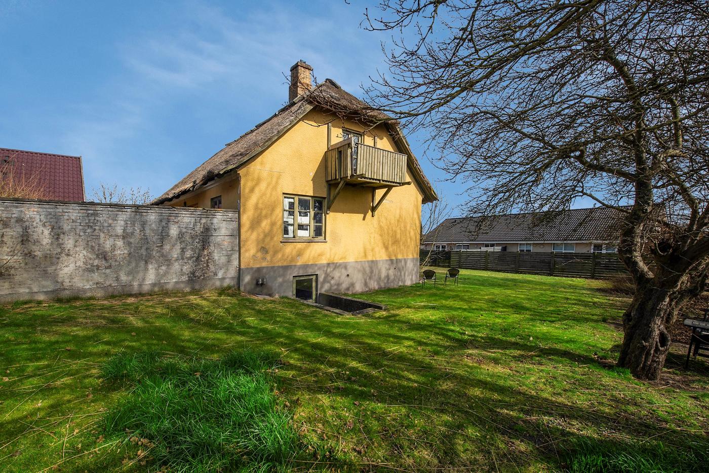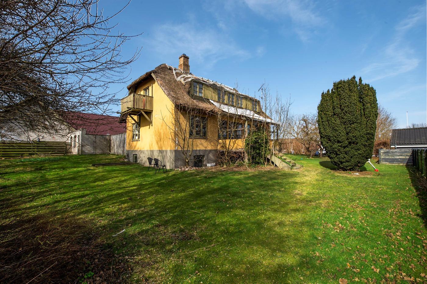 Ejendommen er en tidligere gård, hvor det stråtækte stuehus fra 1929 står omgivet af en hyggelig have med en græsplæne og gamle træer. Huset er klar til nedrivning, og man har i stedet mulighed for at bygge nyt; der er allerede indlagt og betalt for ekstra vandstik. Med denne ejendom overtager man også en allerede eksisterende bygning med seks lejere, og da grunden er stor, hører der både små private udearealer til boligerne og flere fælles områder, blandt andet med parkering.
