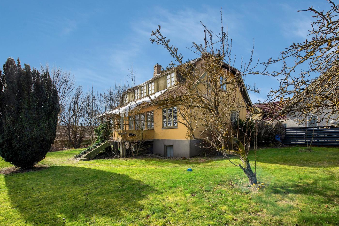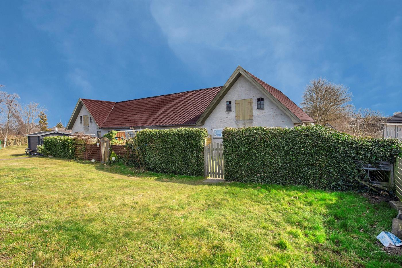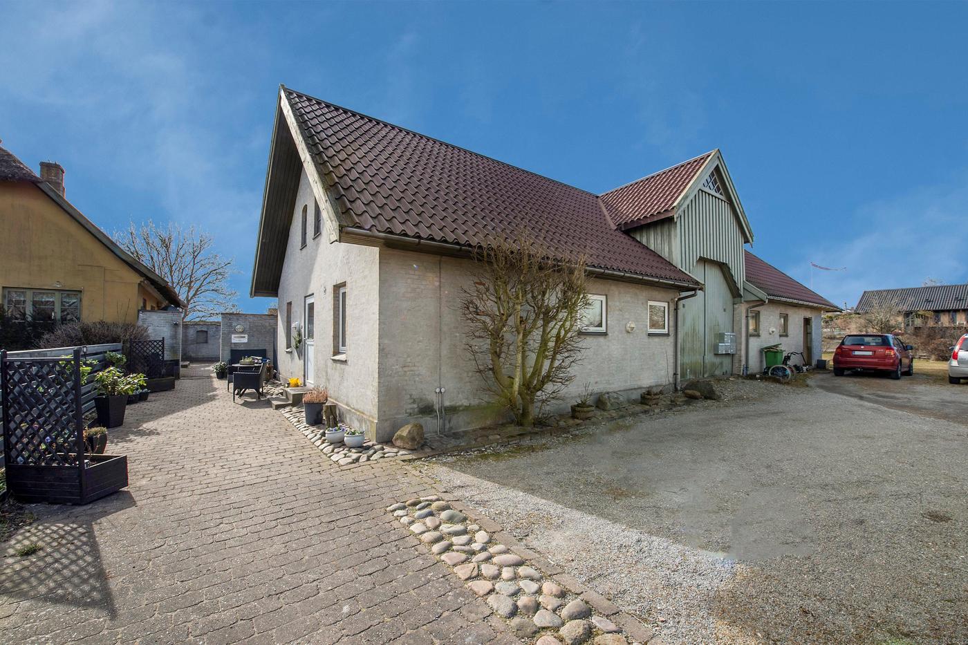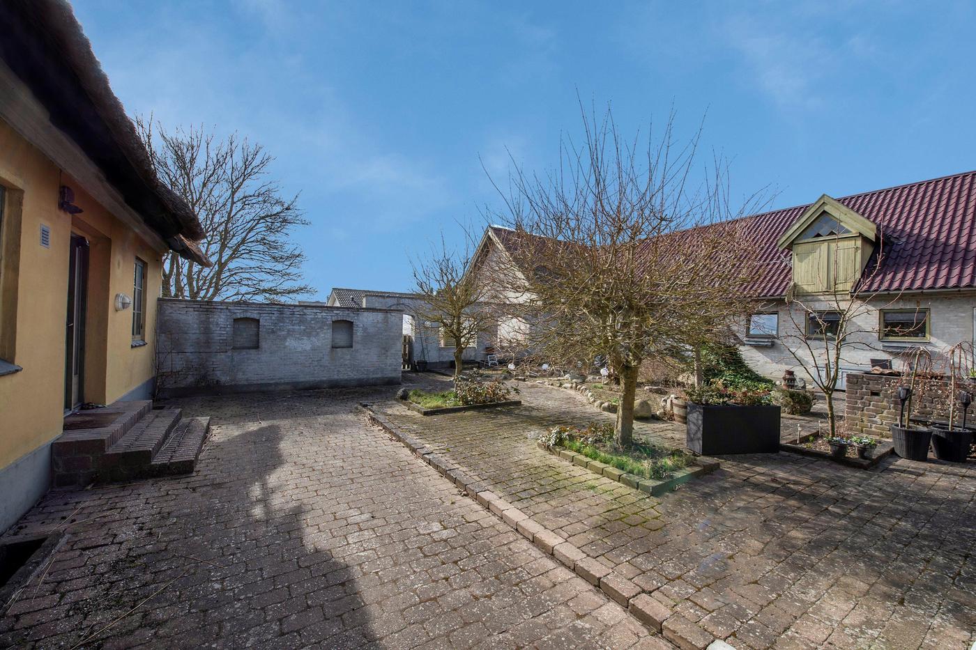 Ejendommen er en tidligere gård, hvor det stråtækte stuehus fra 1929 står omgivet af en hyggelig have med en græsplæne og gamle træer. Huset er klar til nedrivning, og man har i stedet mulighed for at bygge nyt; der er allerede indlagt og betalt for ekstra vandstik. Med denne ejendom overtager man også en allerede eksisterende bygning med seks lejere, og da grunden er stor, hører der både små private udearealer til boligerne og flere fælles områder, blandt andet med parkering.