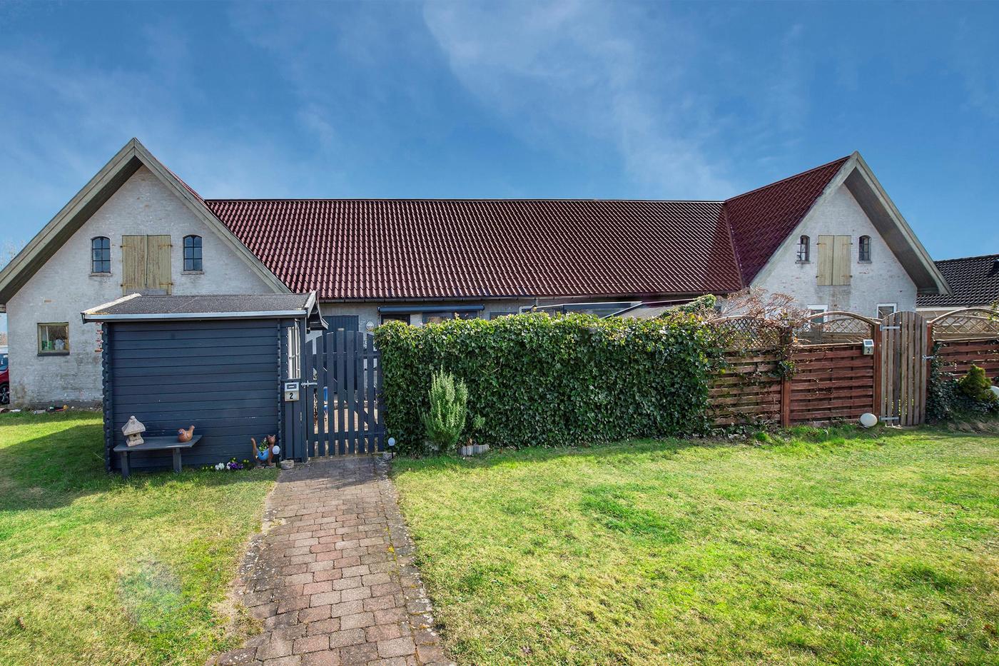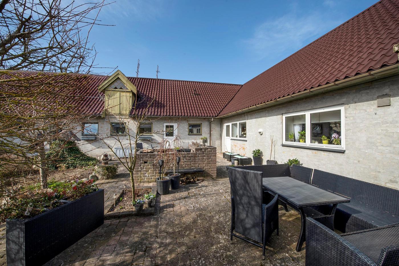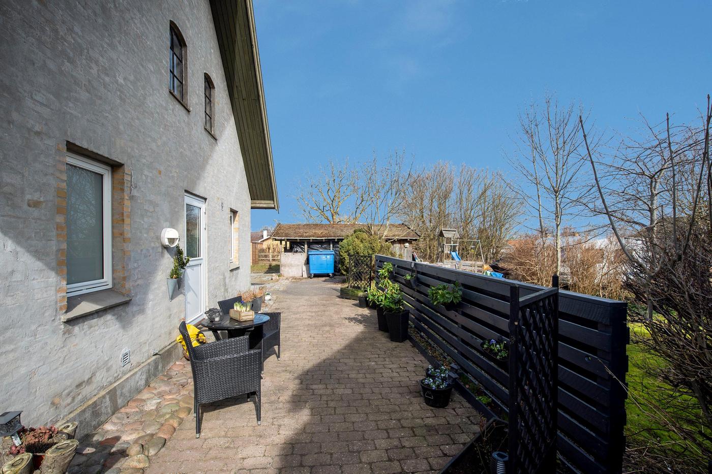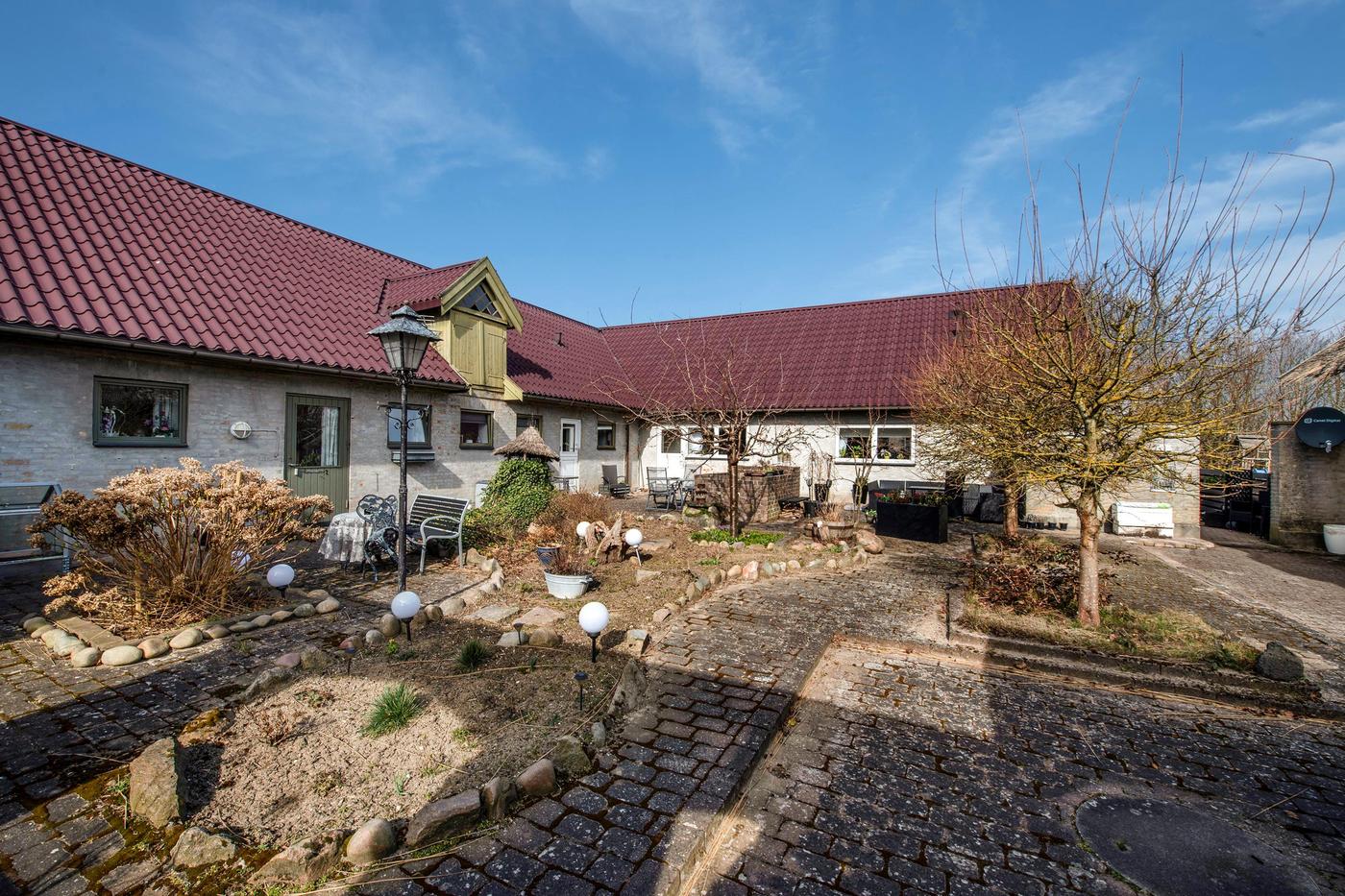 Ejendommen er en tidligere gård, hvor det stråtækte stuehus fra 1929 står omgivet af en hyggelig have med en græsplæne og gamle træer. Huset er klar til nedrivning, og man har i stedet mulighed for at bygge nyt; der er allerede indlagt og betalt for ekstra vandstik. Med denne ejendom overtager man også en allerede eksisterende bygning med seks lejere, og da grunden er stor, hører der både små private udearealer til boligerne og flere fælles områder, blandt andet med parkering.