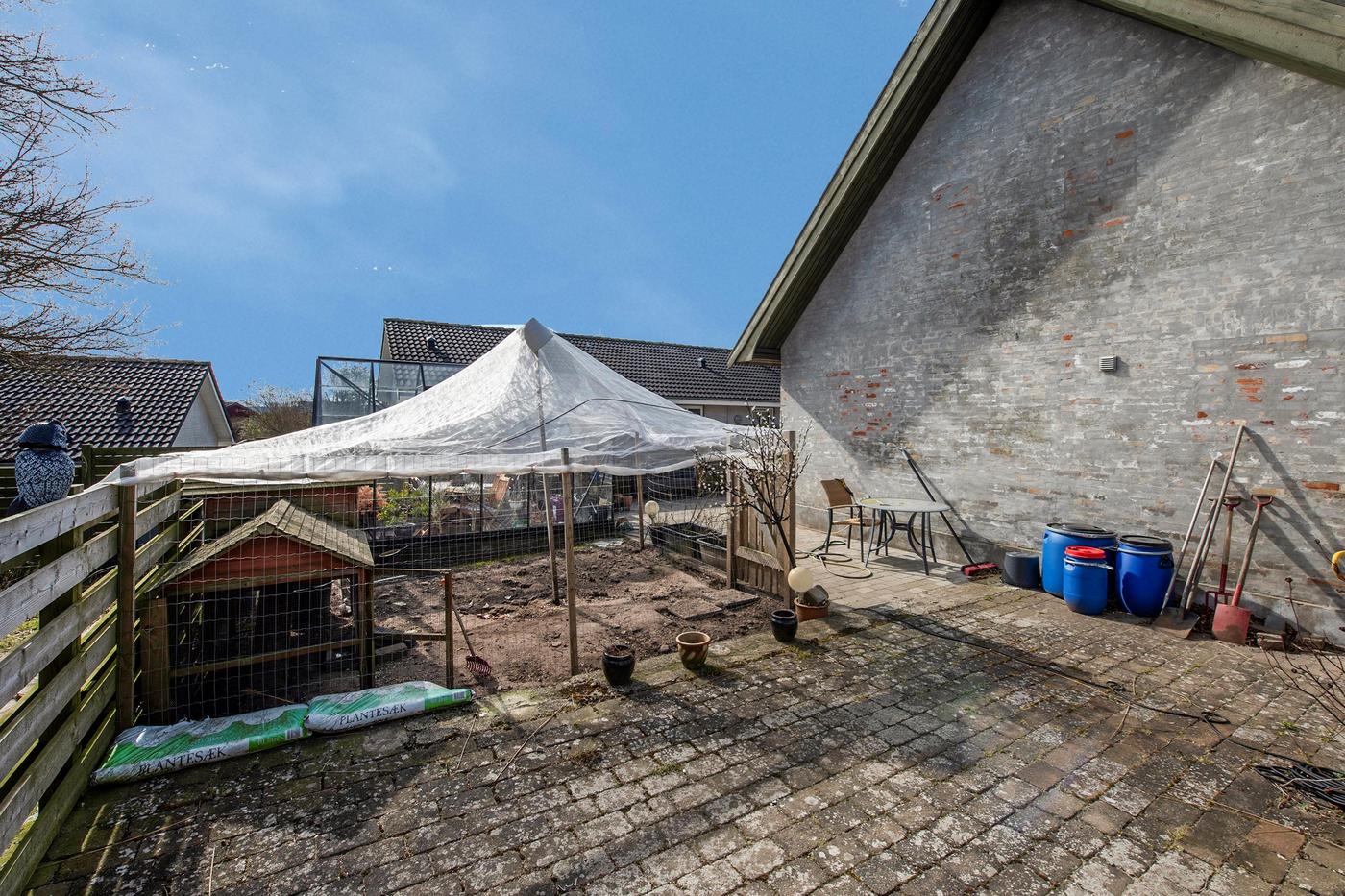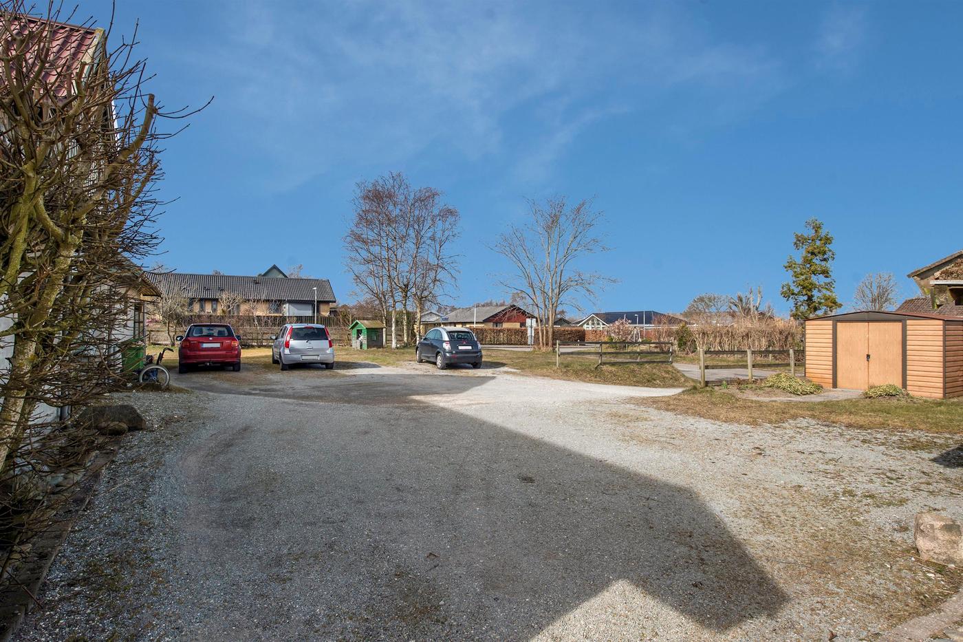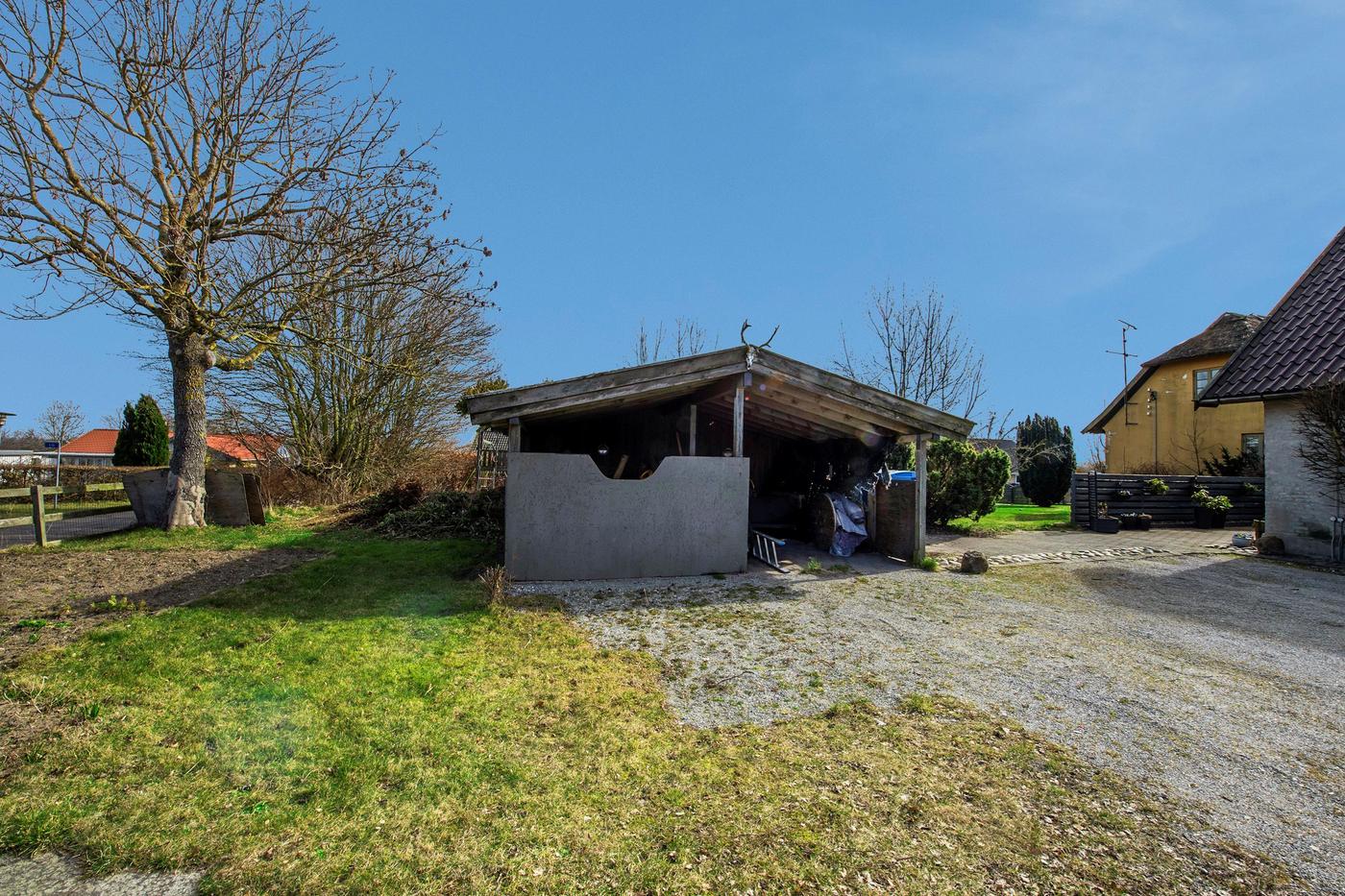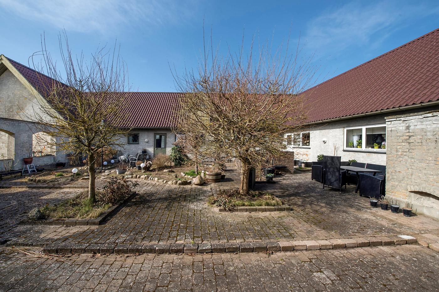 Ejendommen er en tidligere gård, hvor det stråtækte stuehus fra 1929 står omgivet af en hyggelig have med en græsplæne og gamle træer. Huset er klar til nedrivning, og man har i stedet mulighed for at bygge nyt; der er allerede indlagt og betalt for ekstra vandstik. Med denne ejendom overtager man også en allerede eksisterende bygning med seks lejere, og da grunden er stor, hører der både små private udearealer til boligerne og flere fælles områder, blandt andet med parkering.