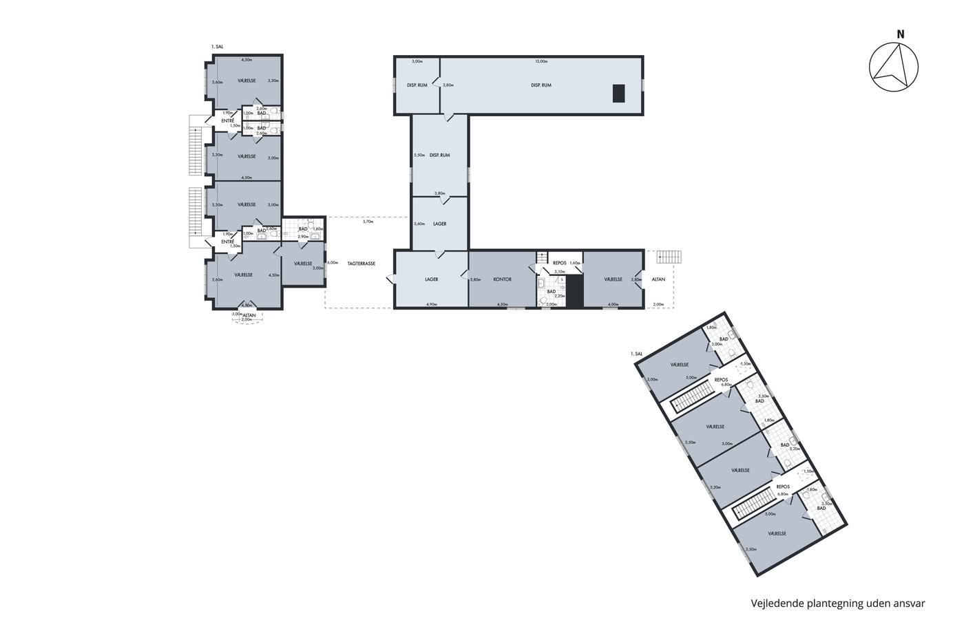 fordelt på de to bygninger. Hotellets faciliteter omfatter i alt 18 overnatningsværelser,