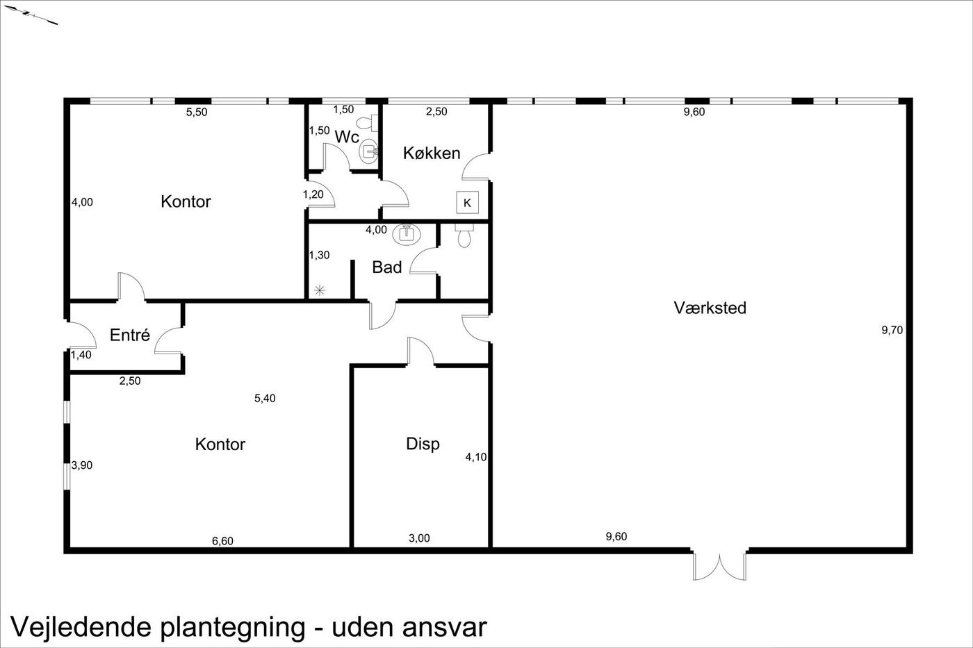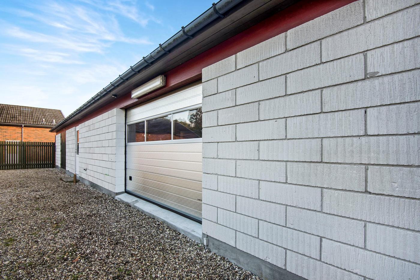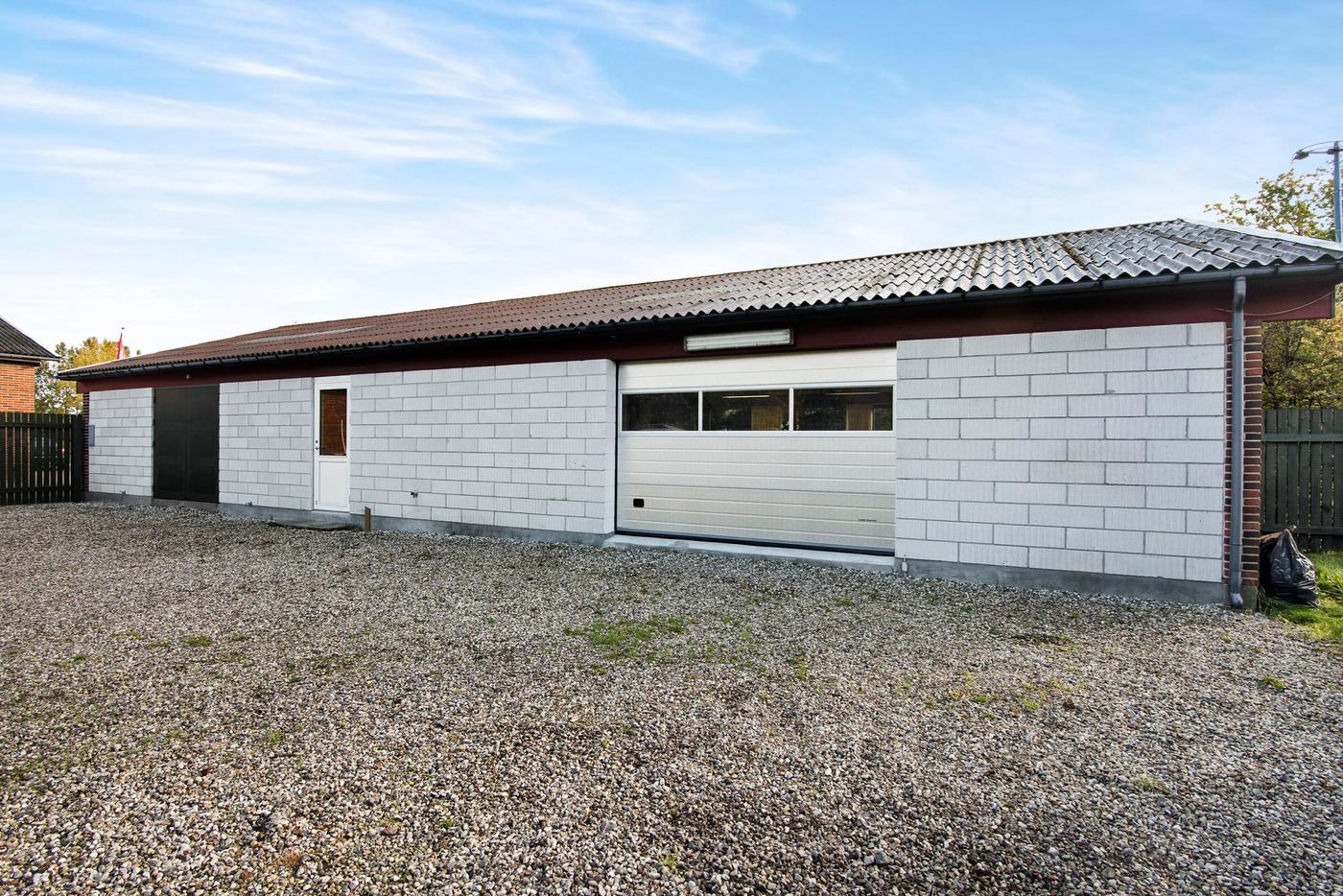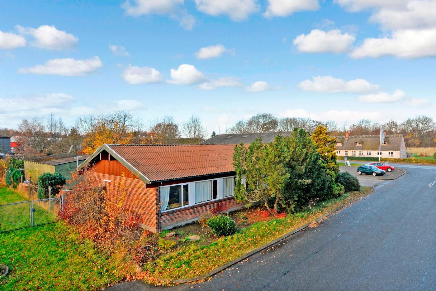 Ejendommen er bygget i henholdsvis gasbeton og røde mursten. Den rummer i alt 202 kvadratmeter, som byder velkommen med et rummeligt indgangsparti, der til venstre glider ud i et lagerlokale og til højre det store værksted med højt til loftet, ovenlysvinduer, et langstrakt vinduesparti mod nord og en bred, elektrisk port mod syd. Værkstedet har i sig selv et areal på næsten 100 kvadratmeter. Mellem værkstedet og kontoret, som også nyder godt af egen indgang, ligger et toilet, et flisebadeværelse med separat bruseniche samt et personalerum med et mindre køkken, vask og spiseplads.