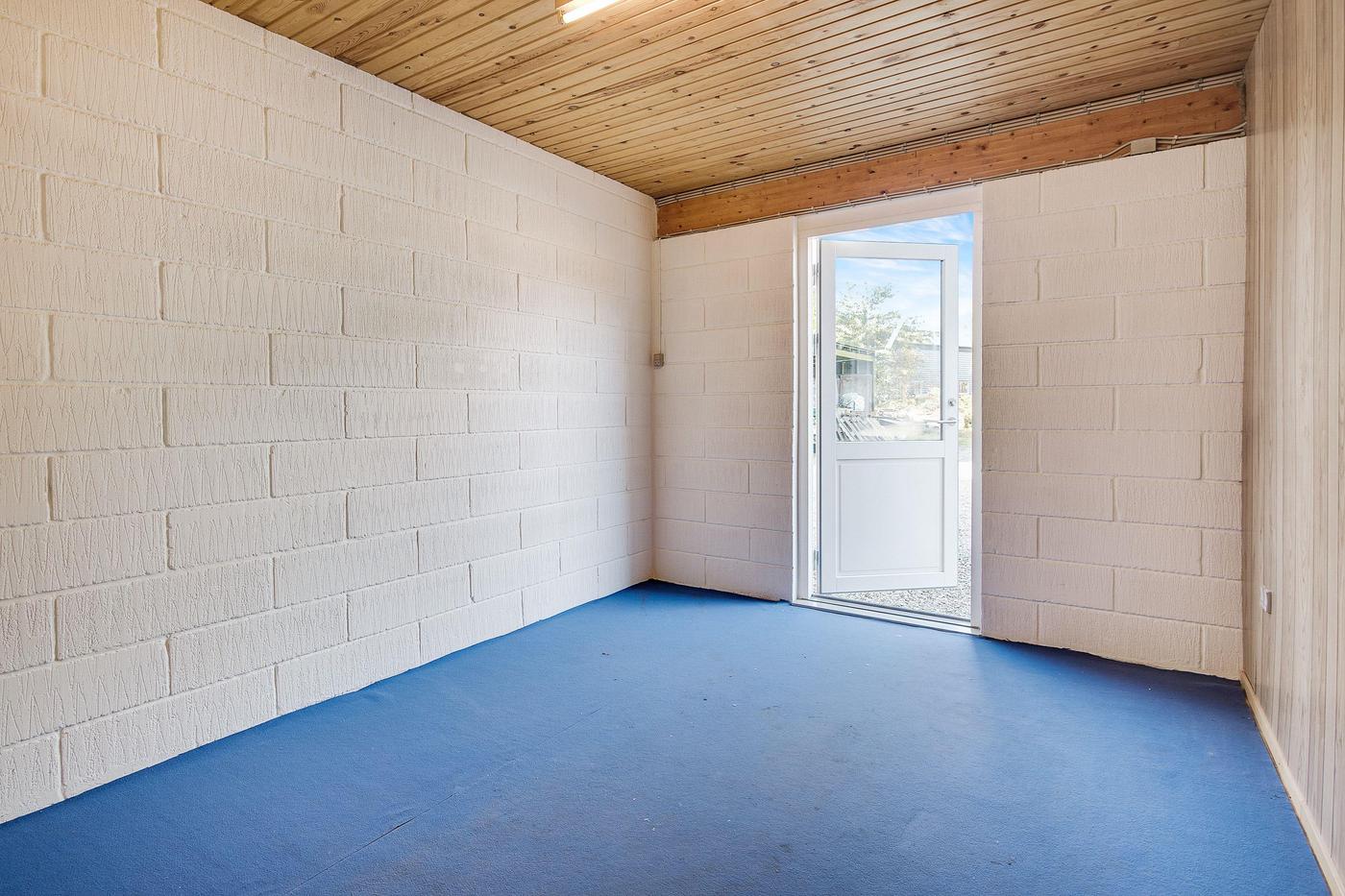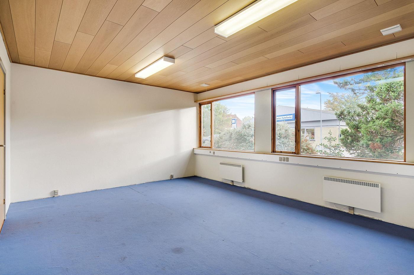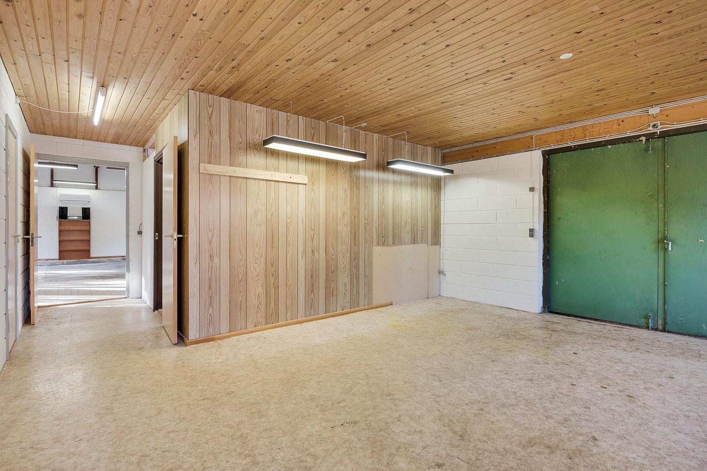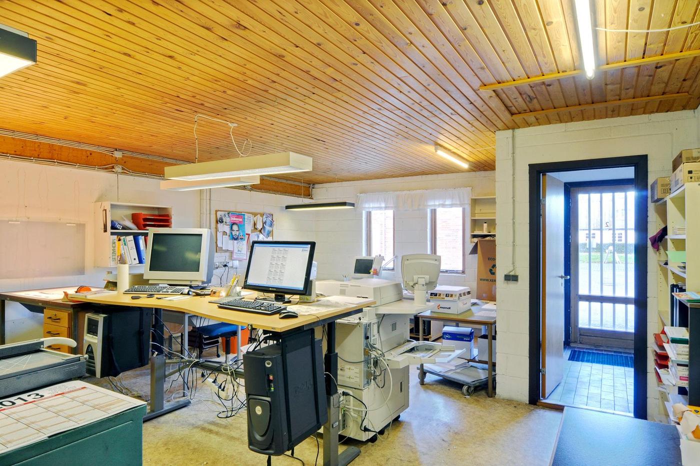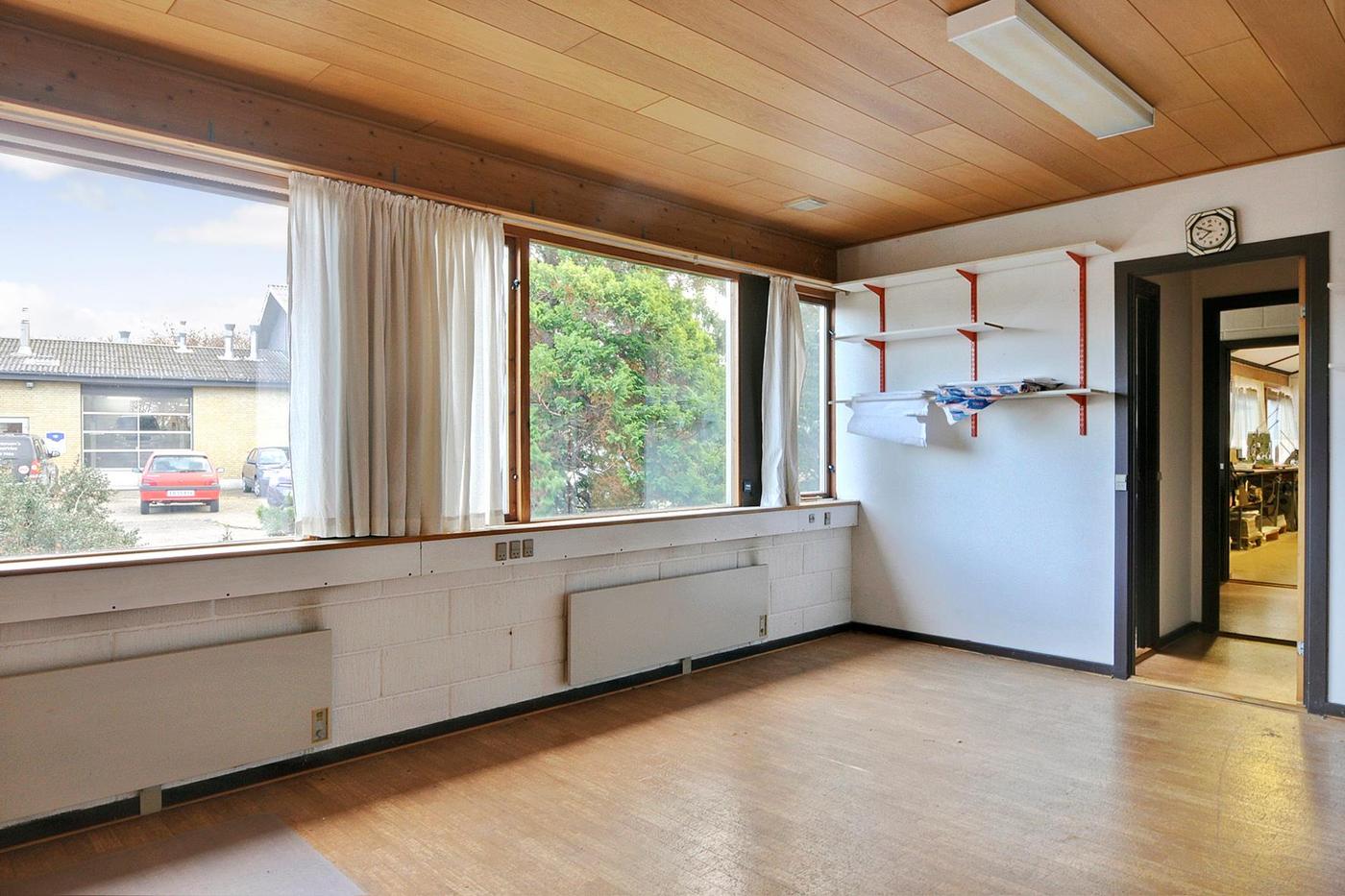 Ejendommen er bygget i henholdsvis gasbeton og røde mursten. Den rummer i alt 202 kvadratmeter, som byder velkommen med et rummeligt indgangsparti, der til venstre glider ud i et lagerlokale og til højre det store værksted med højt til loftet, ovenlysvinduer, et langstrakt vinduesparti mod nord og en bred, elektrisk port mod syd. Værkstedet har i sig selv et areal på næsten 100 kvadratmeter. Mellem værkstedet og kontoret, som også nyder godt af egen indgang, ligger et toilet, et flisebadeværelse med separat bruseniche samt et personalerum med et mindre køkken, vask og spiseplads.