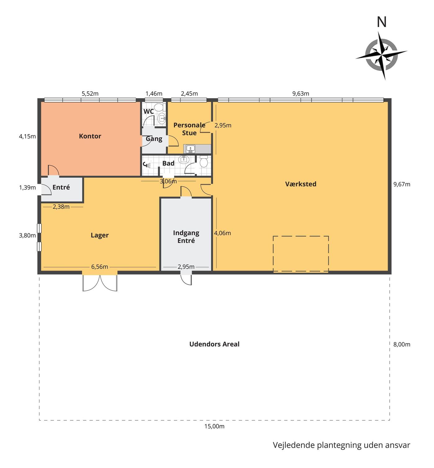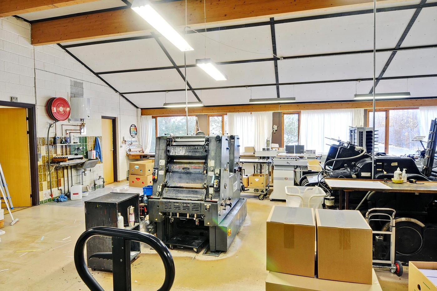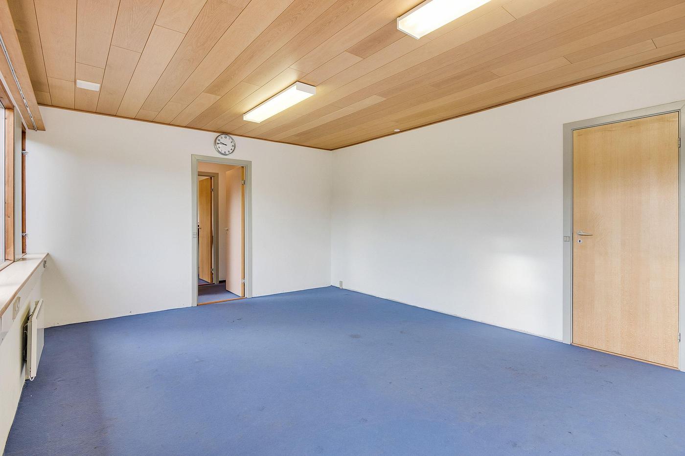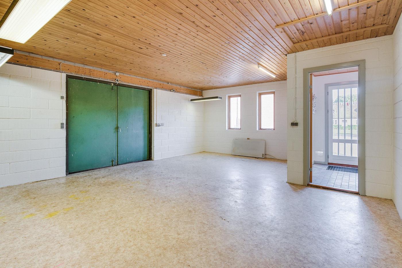 Ejendommen er bygget i henholdsvis gasbeton og røde mursten. Den rummer i alt 202 kvadratmeter, som byder velkommen med et rummeligt indgangsparti, der til venstre glider ud i et lagerlokale og til højre det store værksted med højt til loftet, ovenlysvinduer, et langstrakt vinduesparti mod nord og en bred, elektrisk port mod syd. Værkstedet har i sig selv et areal på næsten 100 kvadratmeter. Mellem værkstedet og kontoret, som også nyder godt af egen indgang, ligger et toilet, et flisebadeværelse med separat bruseniche samt et personalerum med et mindre køkken, vask og spiseplads.