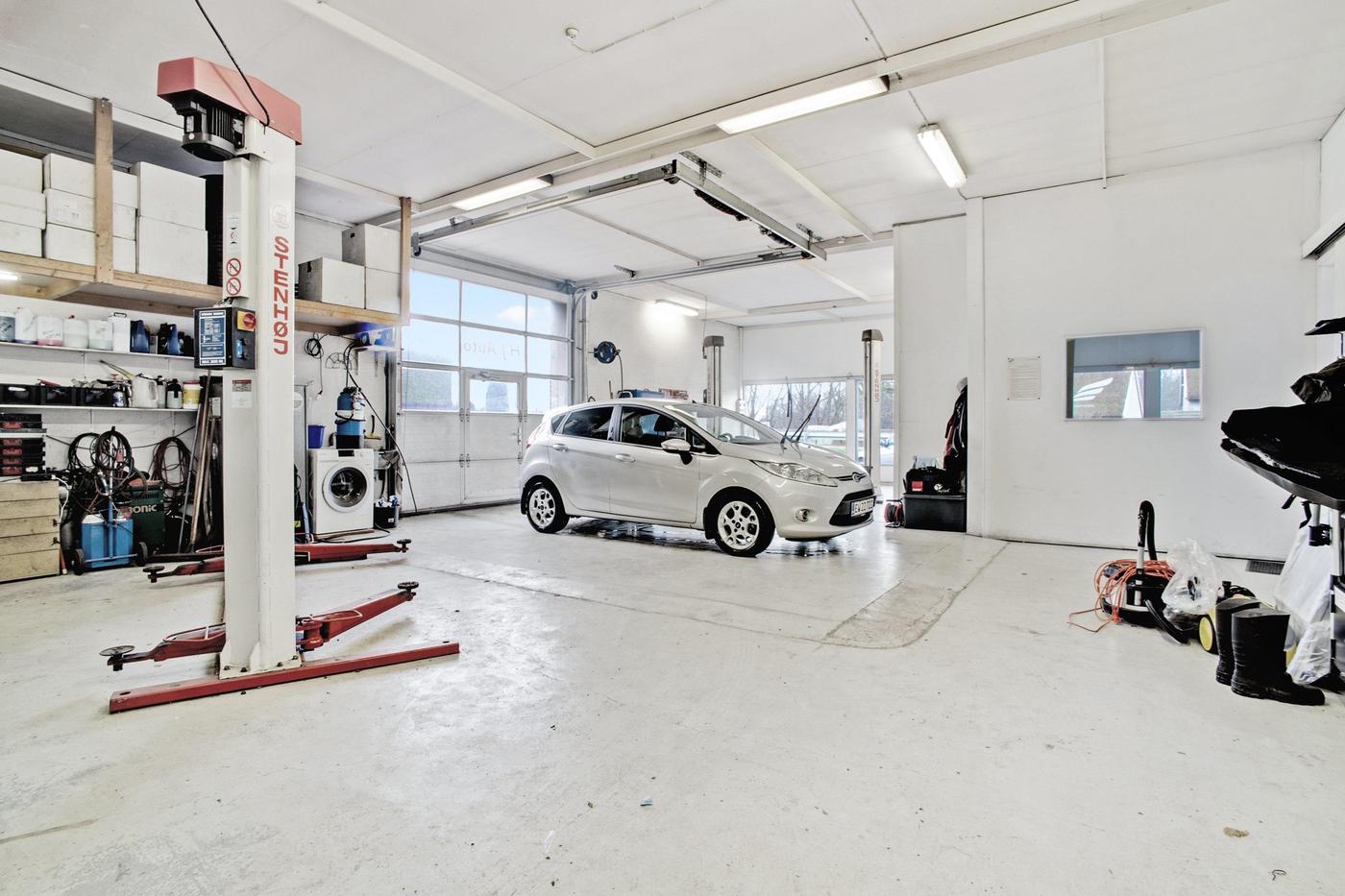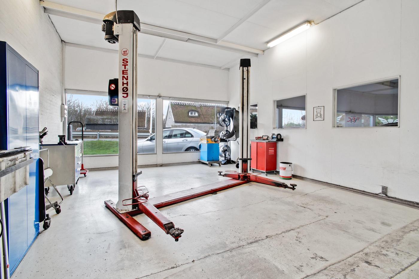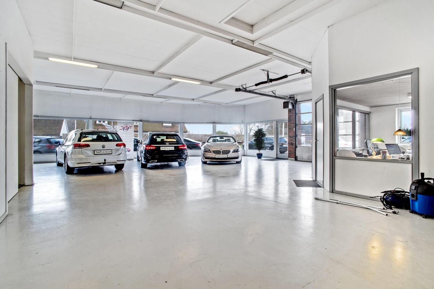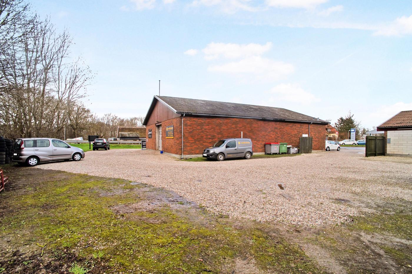 Der er 2 gode og reelle bygninger på grunden. Begge bygninger er udlejede. Den ene bygning er på hele 295 kvadratmeter og anvendes i forbindelse med autovirksomhed, den indeholder et stort flot showroom, et værksted, kontor samt personale faciliteter, i det hele taget en rigtig pæn og godt indrettet bygning. Den anden ejendom anvendes til butik, lager og kontor. Ejendommen er opført i henholdsvis gasbeton og røde mursten. Den rummer i alt 202 kvadratmeter, som byder velkommen med et rummeligt indgangsparti, der til venstre glider ud i et lagerlokale og til højre det store værksted med højt til loftet, ovenlysvinduer, et langstrakt vinduesparti mod øst og en bred, elektrisk port mod syd. Værkstedet har i sig selv et areal på næsten 100 kvadratmeter. Mellem værkstedet og kontoret, som også nyder godt af egen indgang, ligger et toilet, et flisebadeværelse med separat bruseniche samt et personalerum med et mindre køkken, vask og spiseplads.