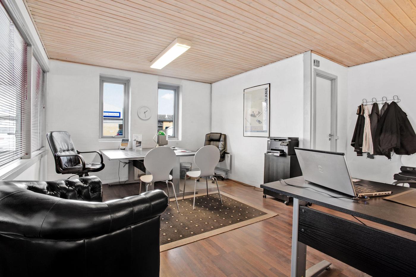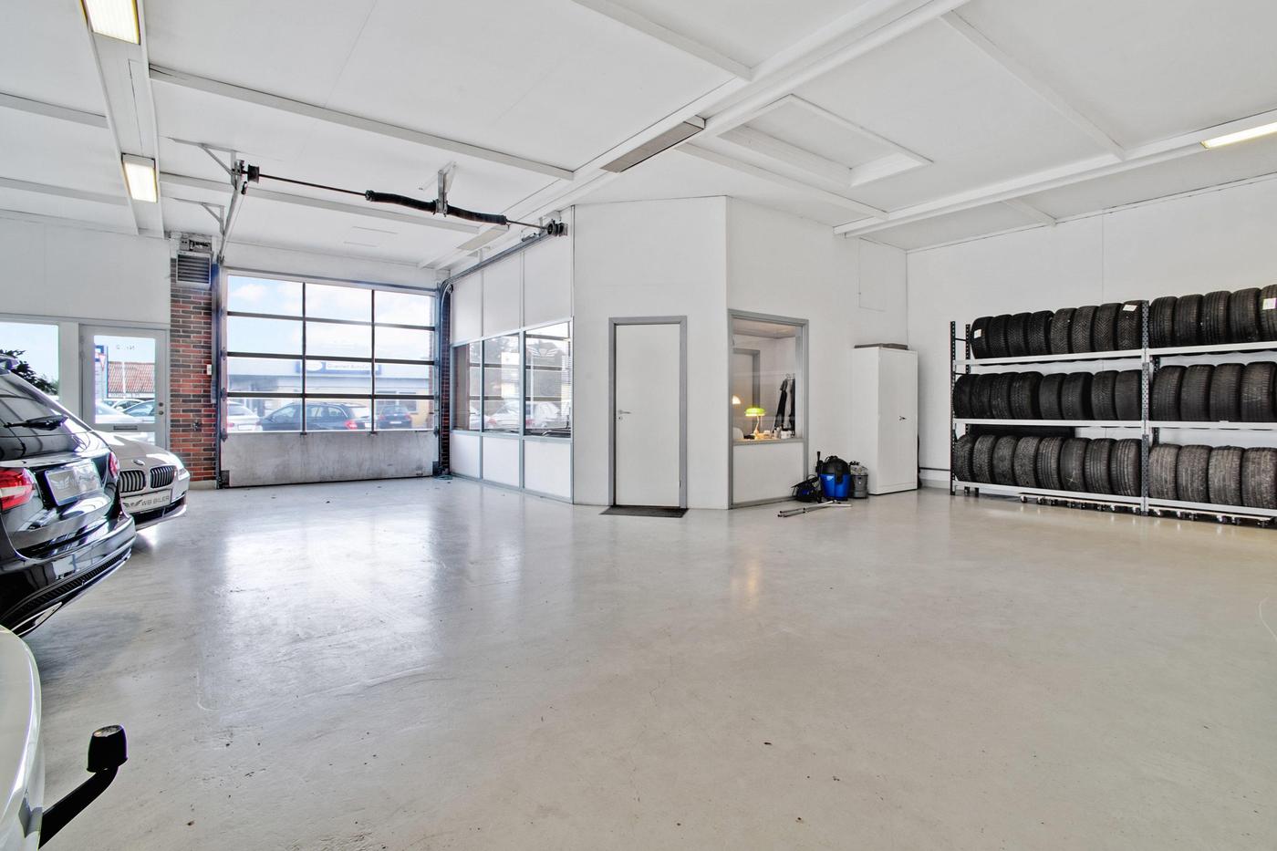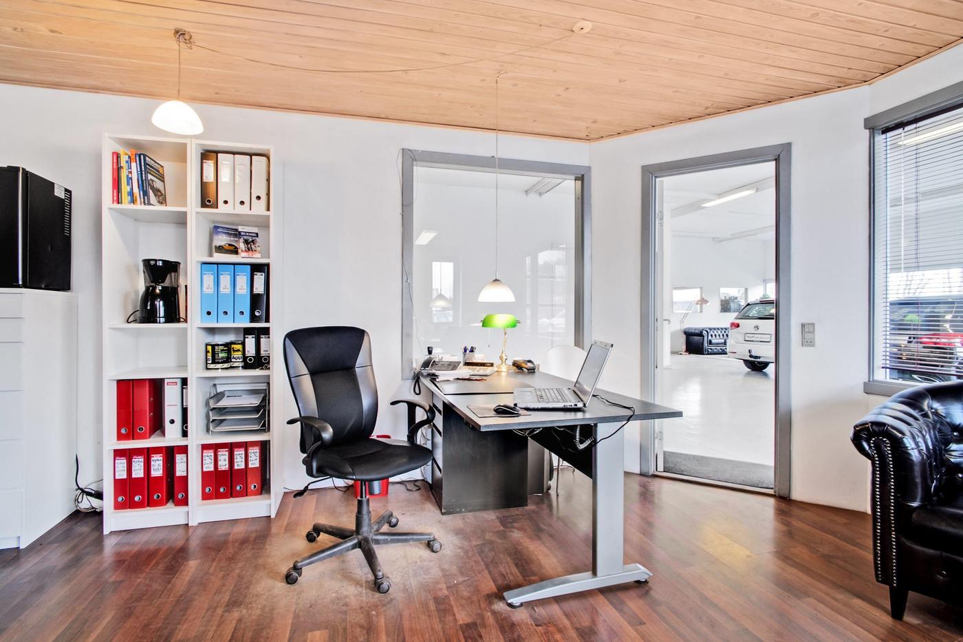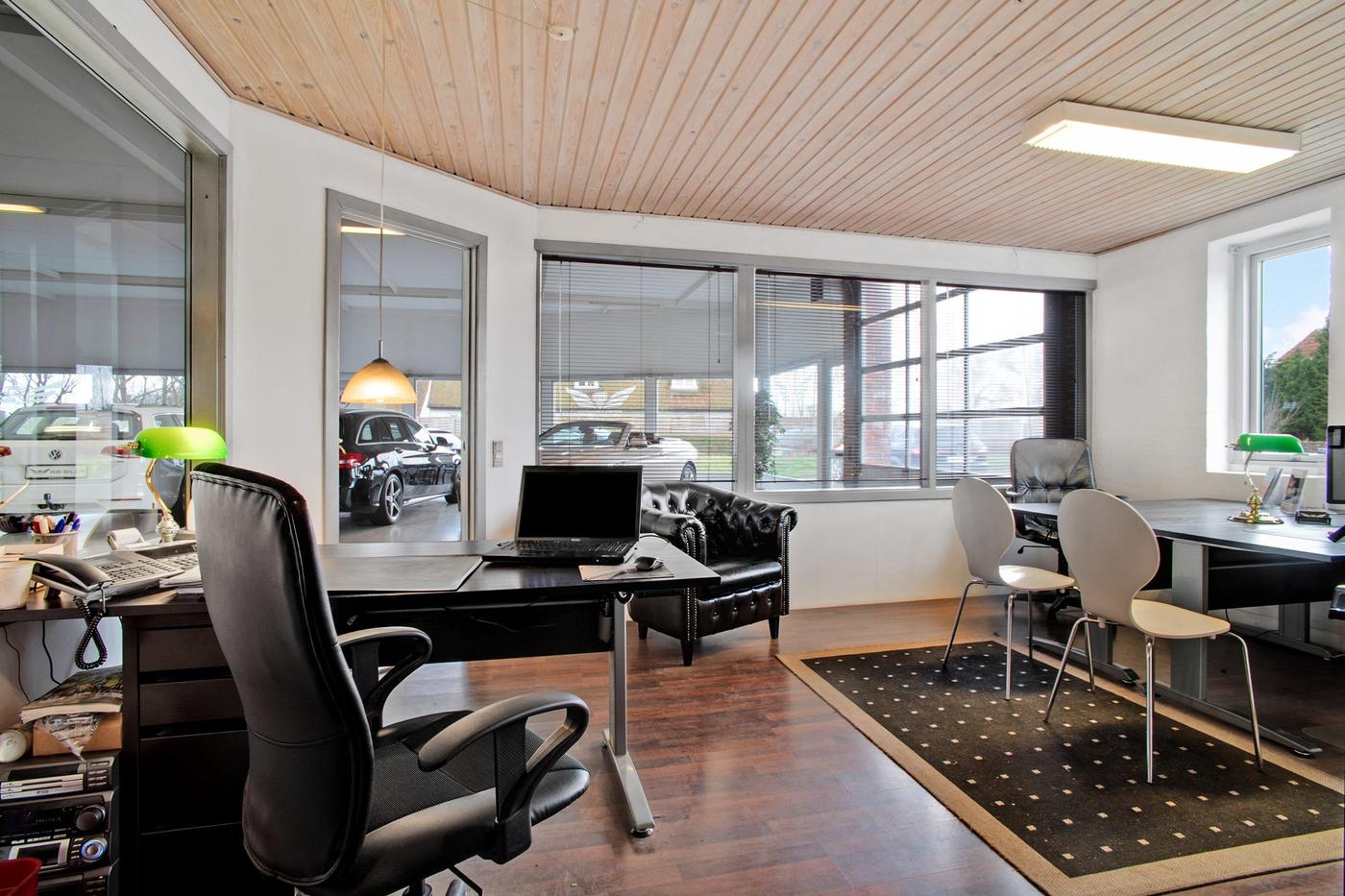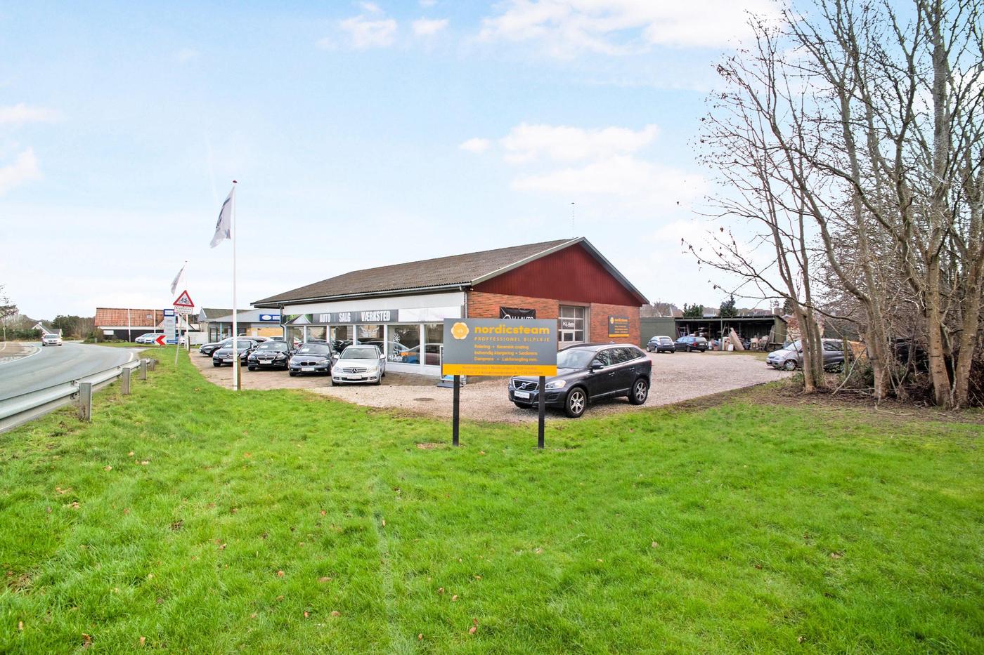 Der er 2 gode og reelle bygninger på grunden. Begge bygninger er udlejede. Den ene bygning er på hele 295 kvadratmeter og anvendes i forbindelse med autovirksomhed, den indeholder et stort flot showroom, et værksted, kontor samt personale faciliteter, i det hele taget en rigtig pæn og godt indrettet bygning. Den anden ejendom anvendes til butik, lager og kontor. Ejendommen er opført i henholdsvis gasbeton og røde mursten. Den rummer i alt 202 kvadratmeter, som byder velkommen med et rummeligt indgangsparti, der til venstre glider ud i et lagerlokale og til højre det store værksted med højt til loftet, ovenlysvinduer, et langstrakt vinduesparti mod øst og en bred, elektrisk port mod syd. Værkstedet har i sig selv et areal på næsten 100 kvadratmeter. Mellem værkstedet og kontoret, som også nyder godt af egen indgang, ligger et toilet, et flisebadeværelse med separat bruseniche samt et personalerum med et mindre køkken, vask og spiseplads.