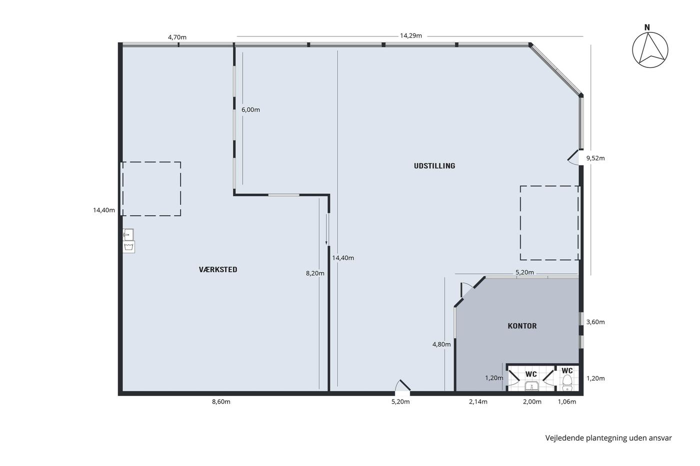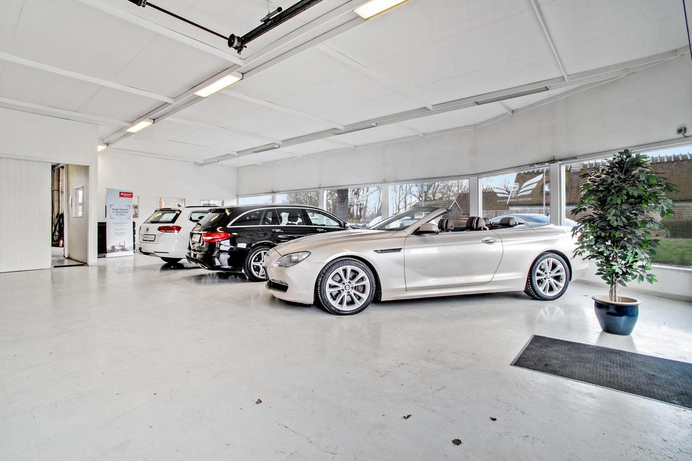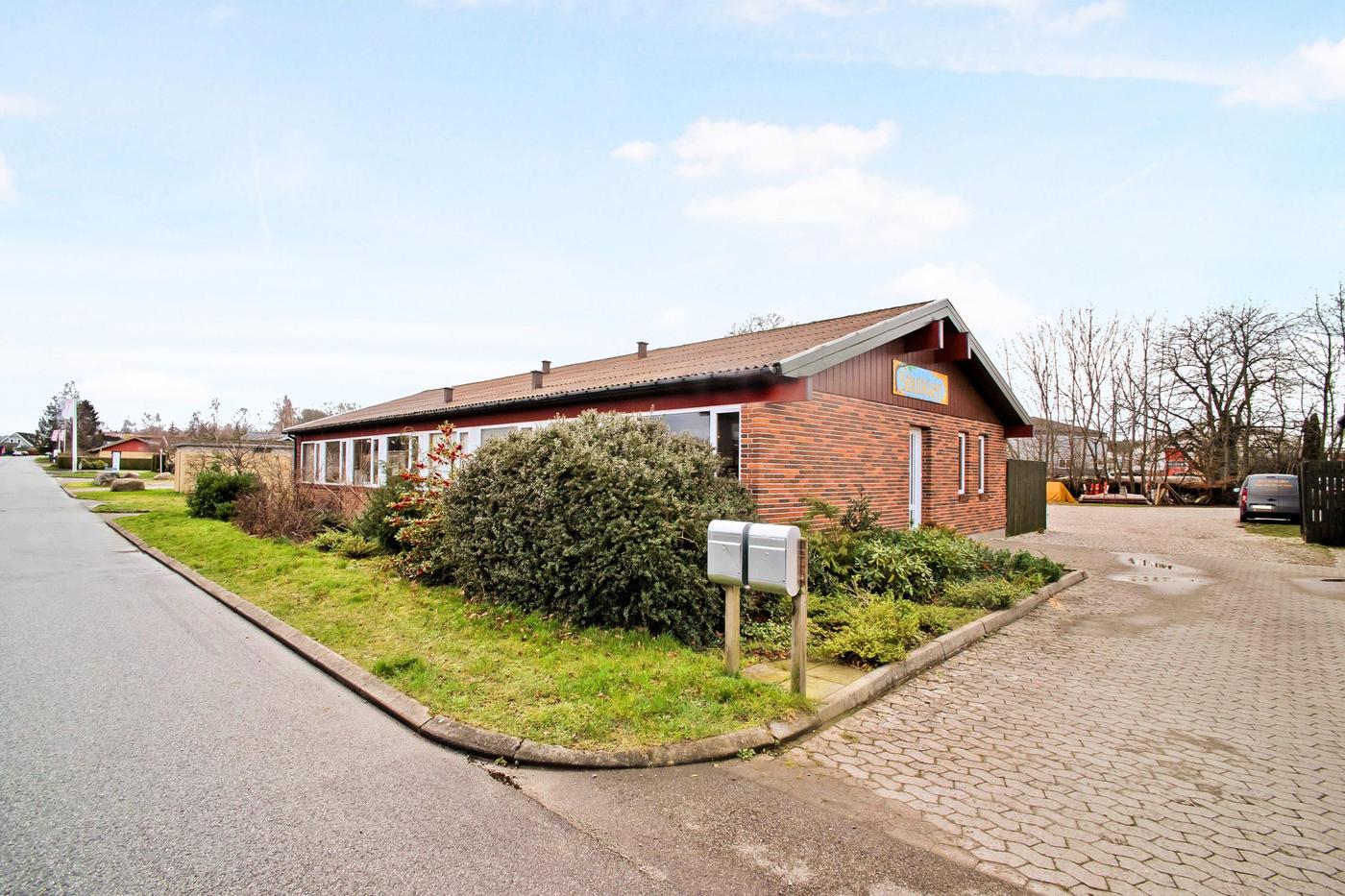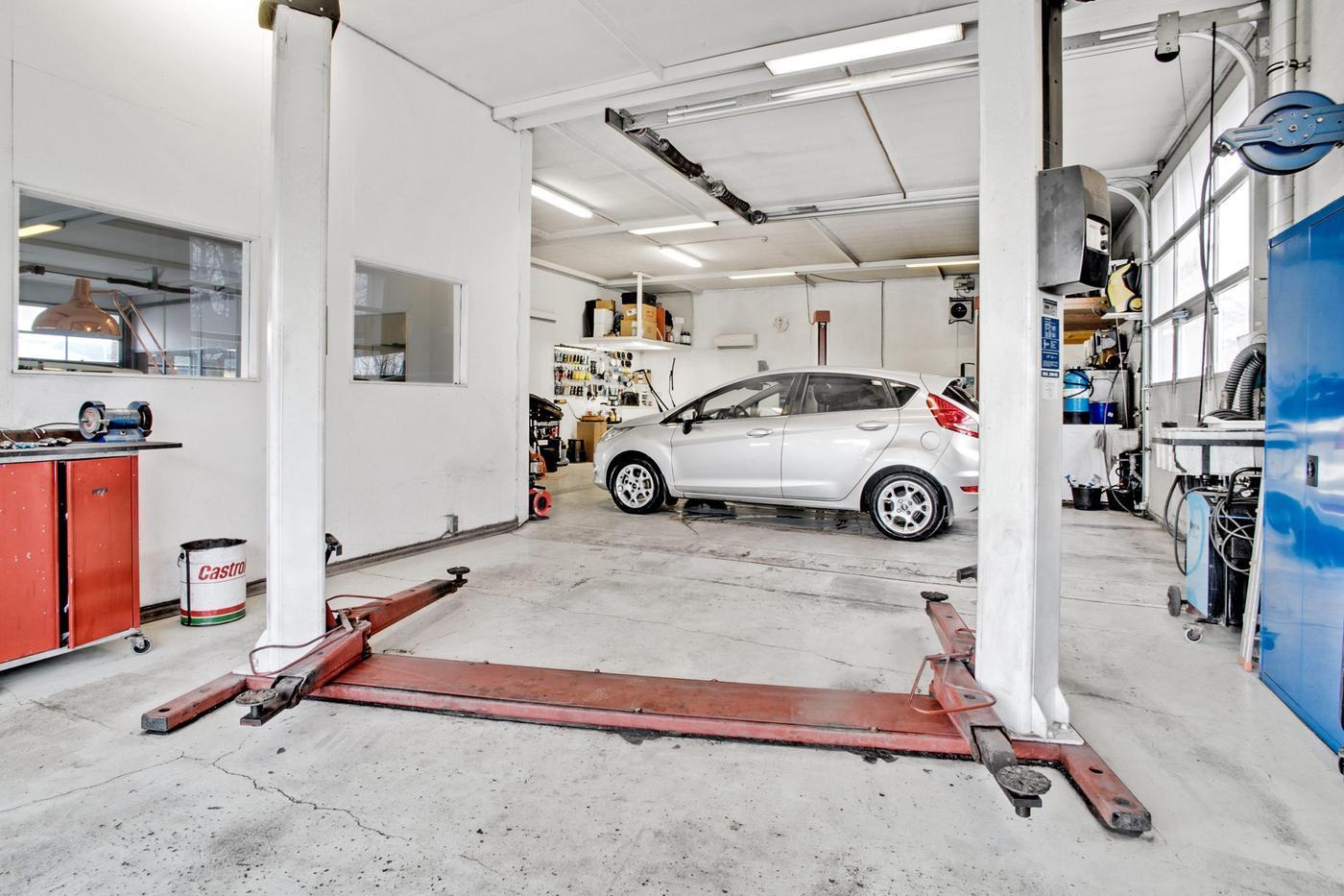 Der er 2 gode og reelle bygninger på grunden. Begge bygninger er udlejede. Den ene bygning er på hele 295 kvadratmeter og anvendes i forbindelse med autovirksomhed, den indeholder et stort flot showroom, et værksted, kontor samt personale faciliteter, i det hele taget en rigtig pæn og godt indrettet bygning. Den anden ejendom anvendes til butik, lager og kontor. Ejendommen er opført i henholdsvis gasbeton og røde mursten. Den rummer i alt 202 kvadratmeter, som byder velkommen med et rummeligt indgangsparti, der til venstre glider ud i et lagerlokale og til højre det store værksted med højt til loftet, ovenlysvinduer, et langstrakt vinduesparti mod øst og en bred, elektrisk port mod syd. Værkstedet har i sig selv et areal på næsten 100 kvadratmeter. Mellem værkstedet og kontoret, som også nyder godt af egen indgang, ligger et toilet, et flisebadeværelse med separat bruseniche samt et personalerum med et mindre køkken, vask og spiseplads.