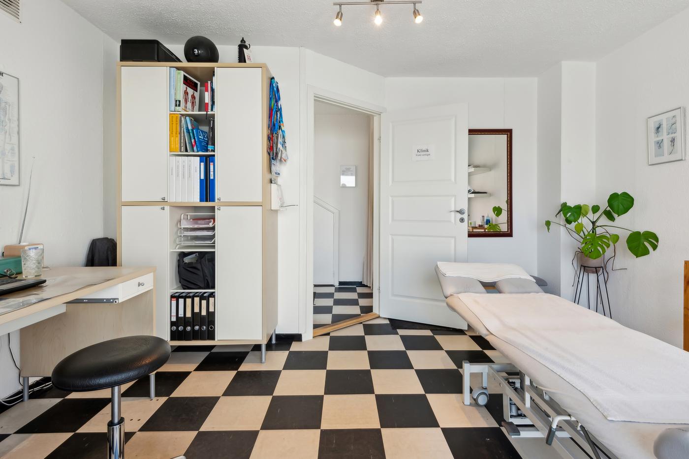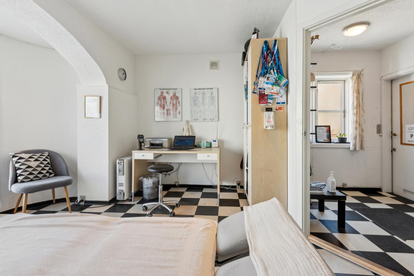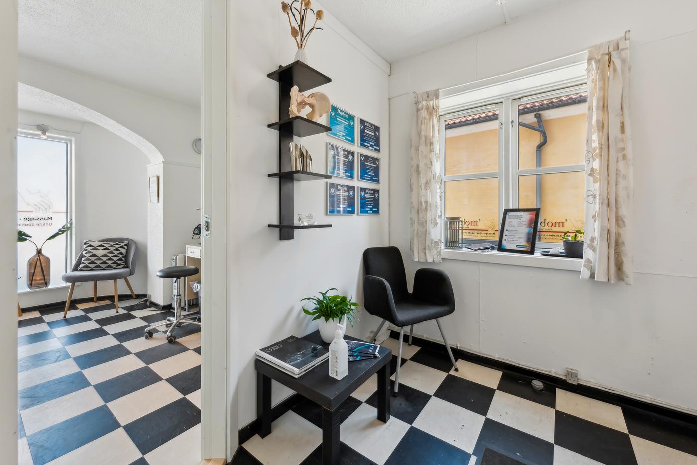 Lejemålet fremstår lyst og velholdt med klassiske detaljer og et funktionelt indrettet rum med behandlings- eller udstillingsplads, lille venteområde og adgang til toilet. Den nuværende indretning inkluderer blandt andet en behandlingsplads og mindre kontorhjørne, men planløsningen kan let tilpasses en ny lejers behov.
