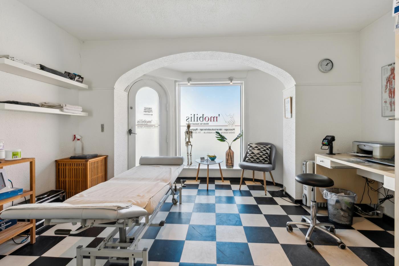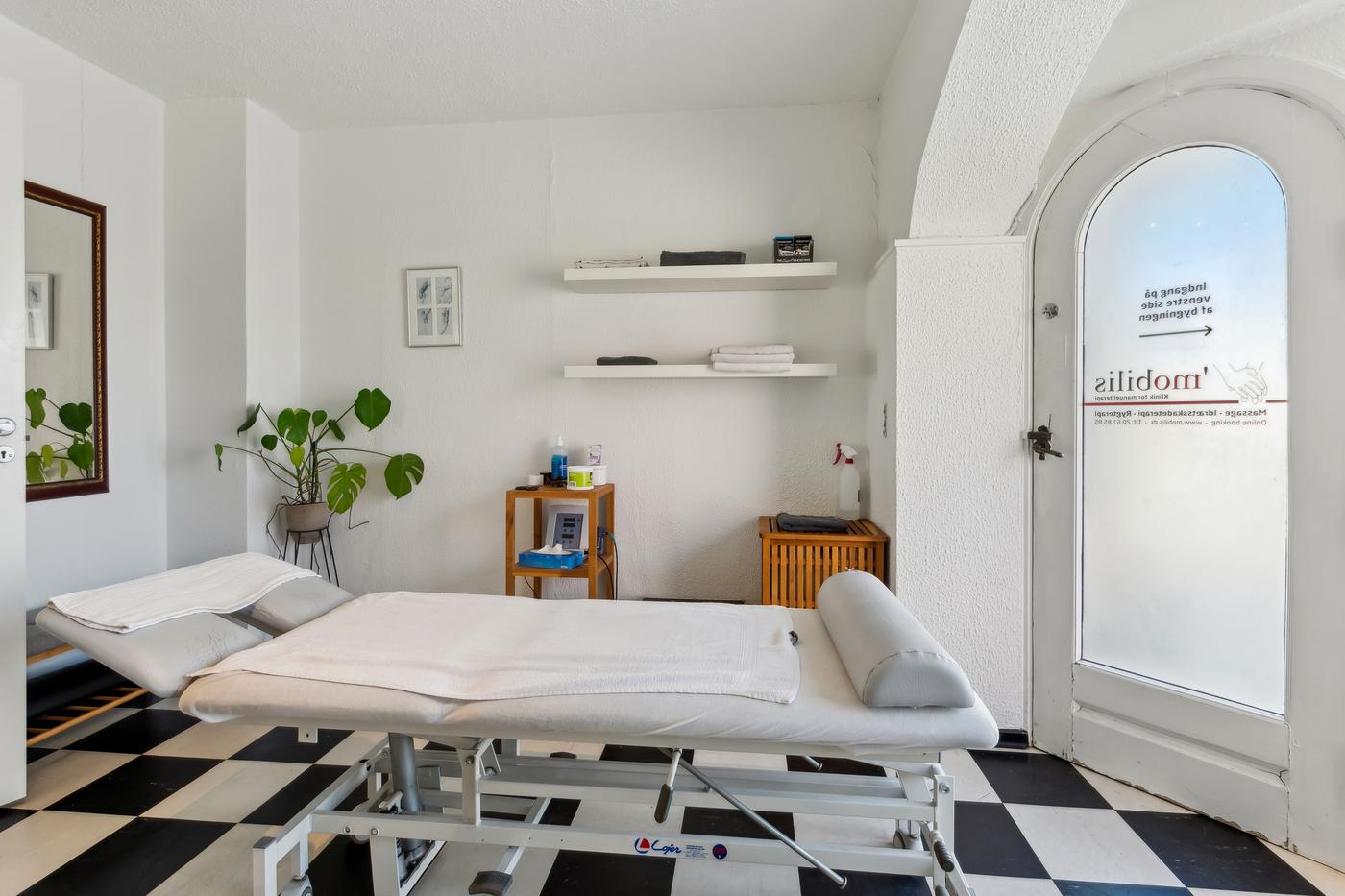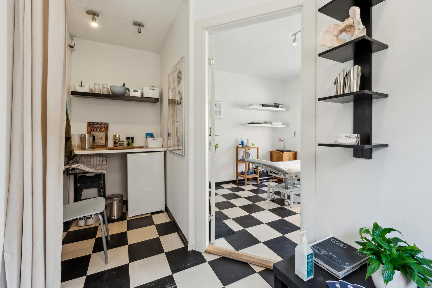 Lejemålet fremstår lyst og velholdt med klassiske detaljer og et funktionelt indrettet rum med behandlings- eller udstillingsplads, lille venteområde og adgang til toilet. Den nuværende indretning inkluderer blandt andet en behandlingsplads og mindre kontorhjørne, men planløsningen kan let tilpasses en ny lejers behov.