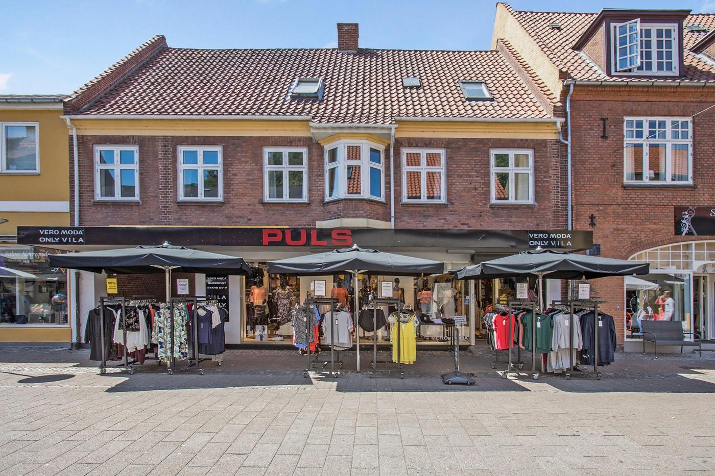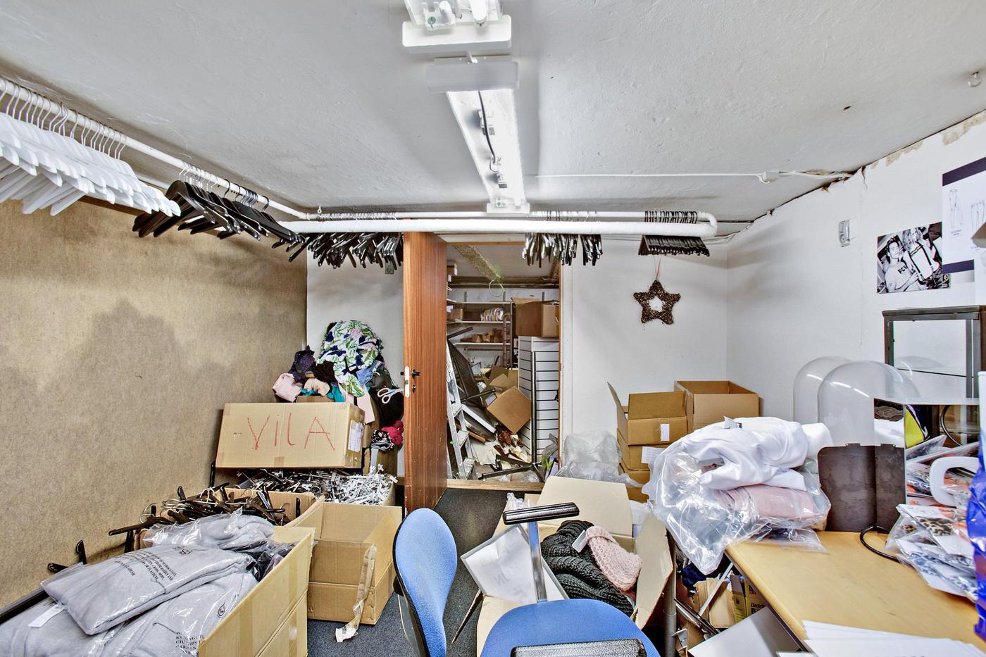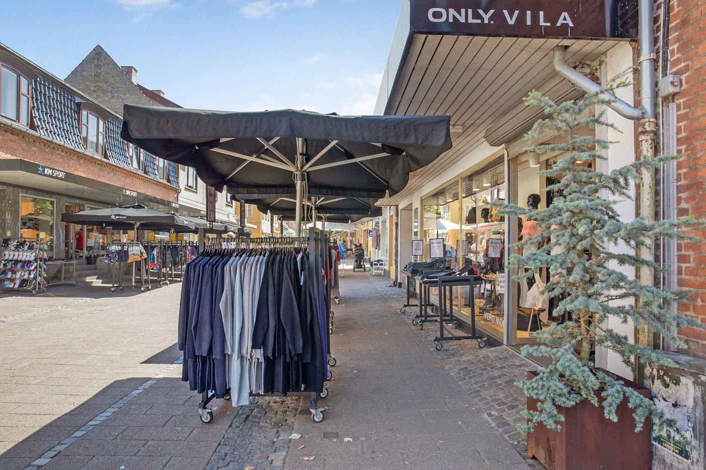 Erhvervslokalet har en stor og bred glasfacade ud mod gågaden, hvor der også er plads til at have varer stående. I øjeblikket benyttes lokalet som tøjforretning, hvorfor det er indrettet med prøverum, skoreoler og stor betjeningsdisk. I kælderen finder man et lagerrum med kontorplads og et personaletoilet.