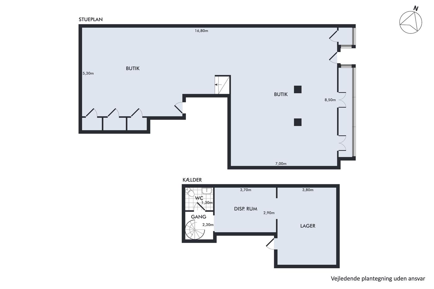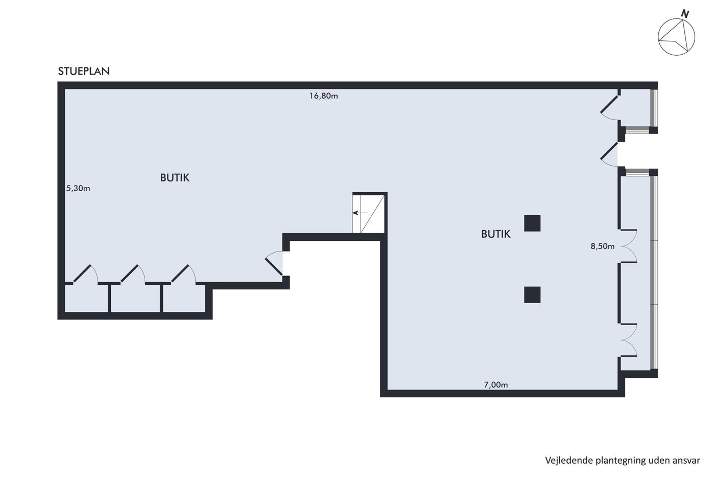 Der er god plads til vareudstilling, og for enden af rummet ligger der tre pæne prøverum, og der er også rummeligt nok til at indrette en komfortabel venteplads overfor. Der er i det hele taget rigtigt mange muligheder med sådan en god og åben planløsning, og det bliver kun bedre af, at du får direkte adgang til lagerrum, toilet og et oplagt pauserum i kælderen.