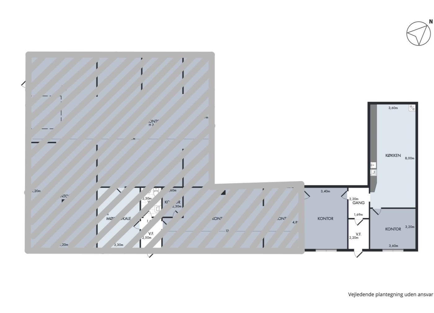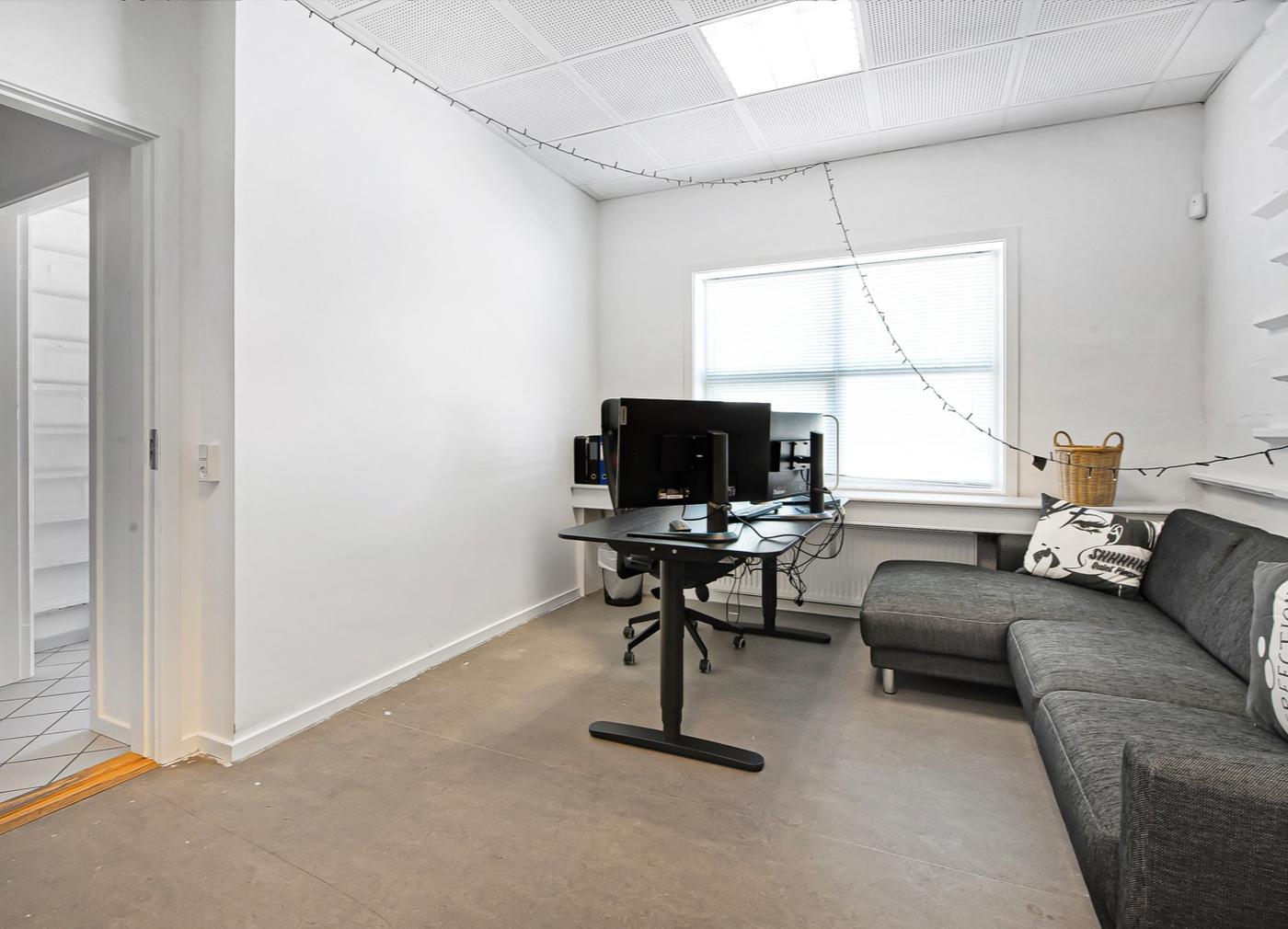 Du får 85 meget brugbare m2 med egen indgang, 2 gode kontorer med masser af lys og et større lokale evt. til møderum eller hvad nu behovet er. Her har der tidligere været etableret et køkken - så det også nemt kan genetableres.