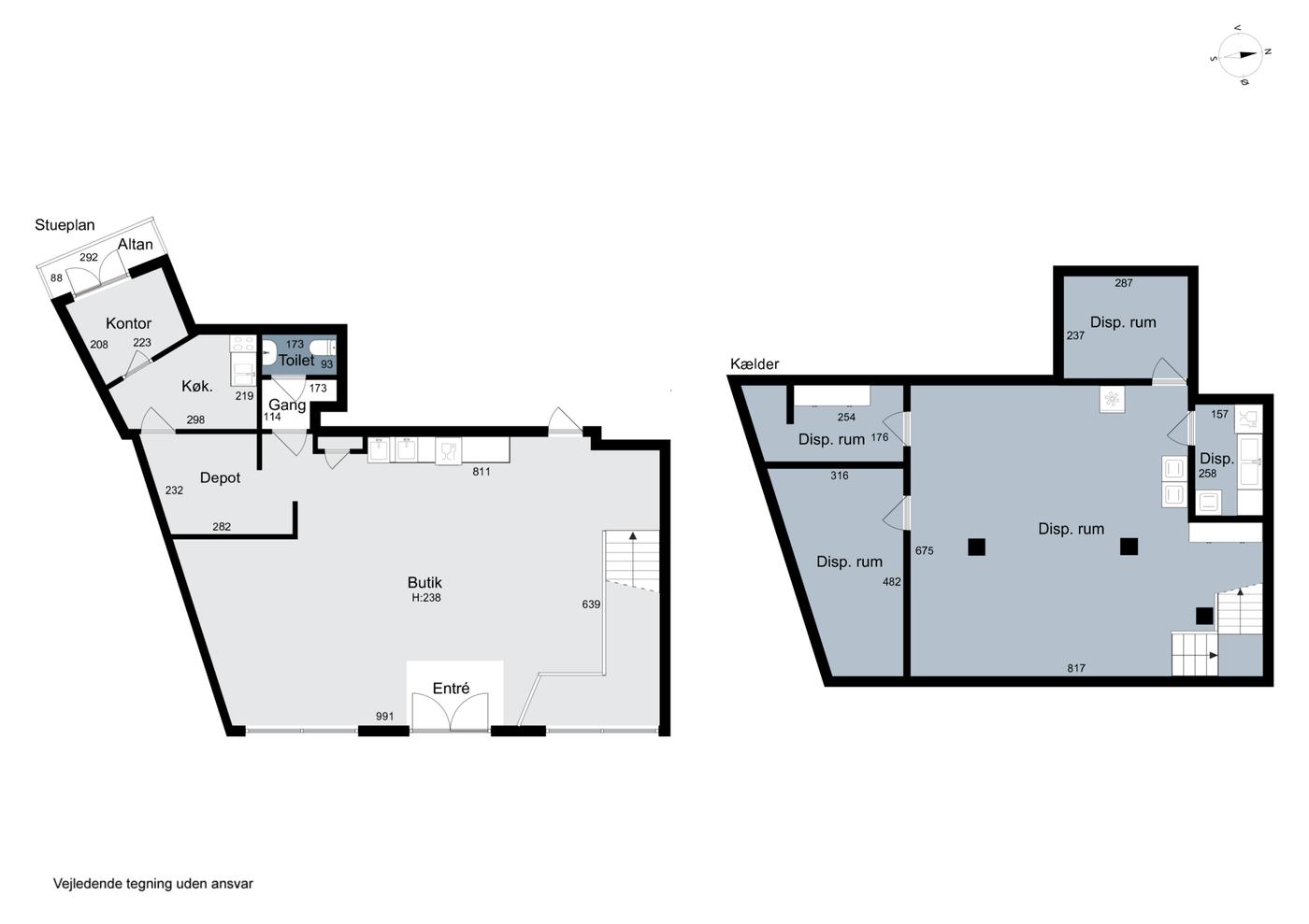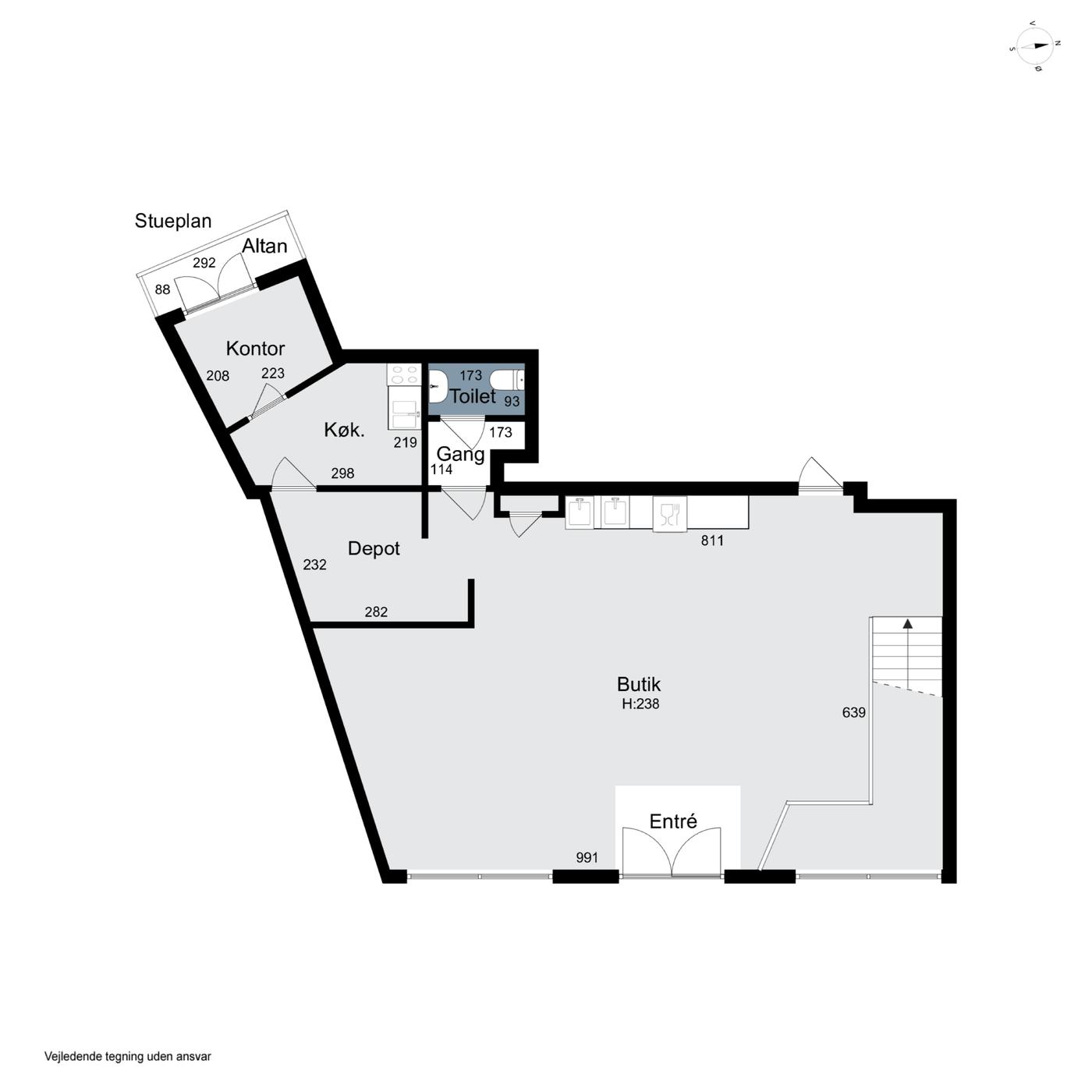 Stueplan er indrettet som et regulært butikslokale med god loftshøjde og fleksible indretningsmuligheder, hvilket gør lejemålet velegnet til detail, showroom eller specialbutik. Bagarealerne rummer personalefaciliteter samt disponibelt areal til lager eller klargøring.
