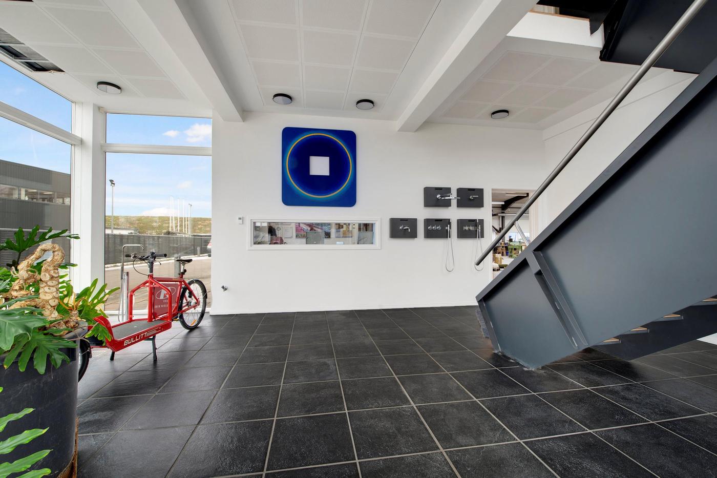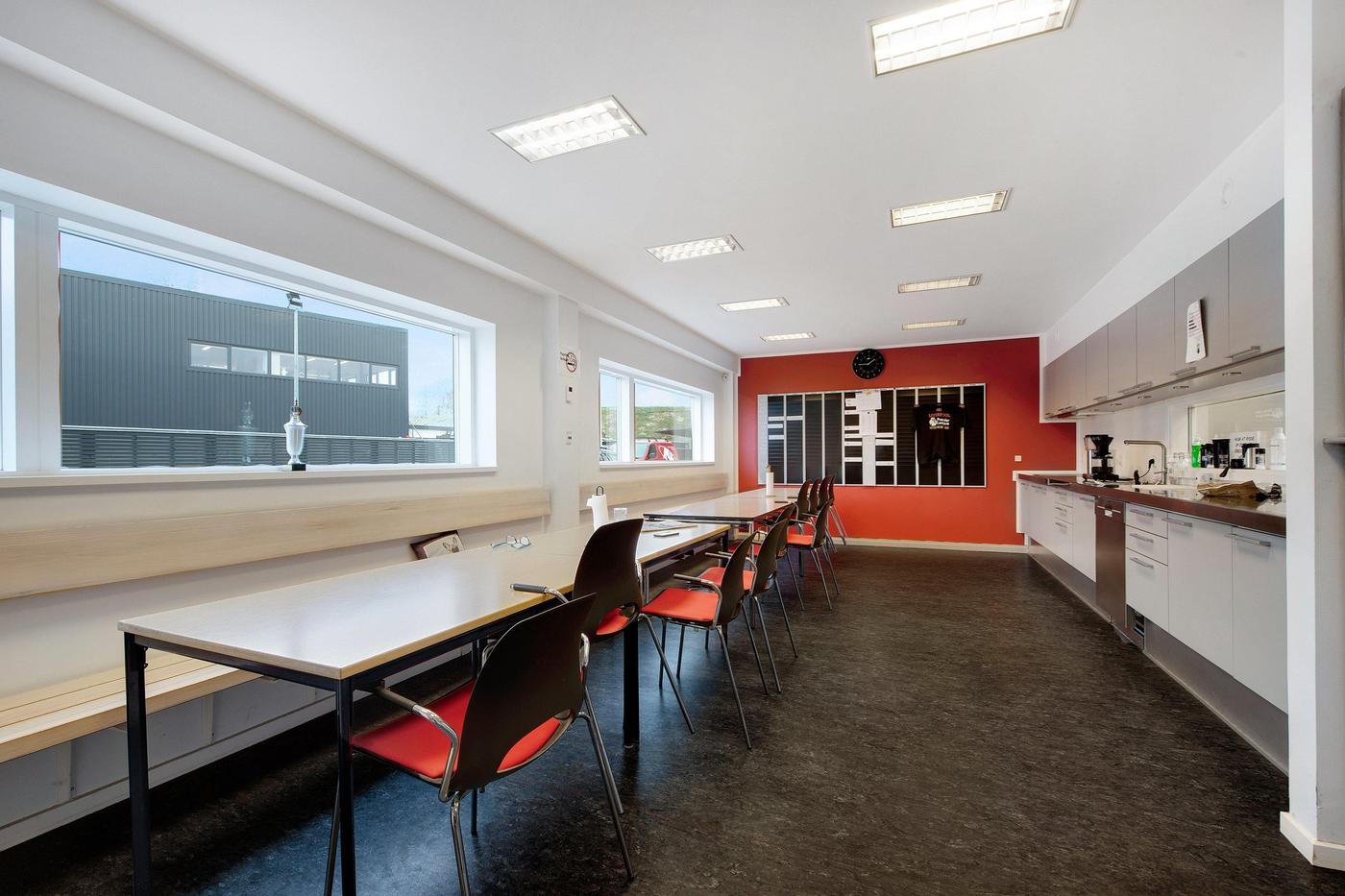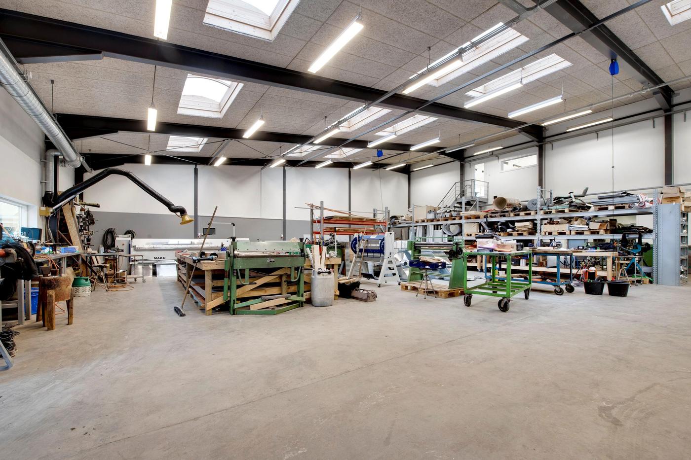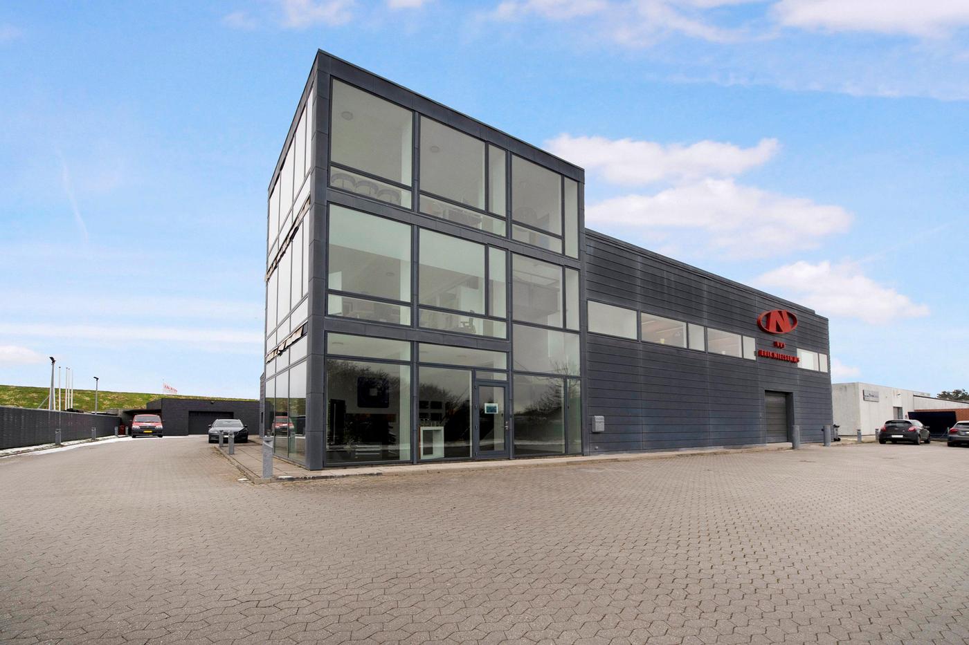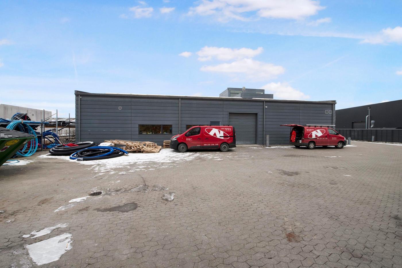 Den store, flotte brugerejendom er opført i 2005, hvilket sikrer jer stilrene og kvalitetsbevidste materialer. Bygningens store glasfacader giver jer ydermere et lyst arbejdsmiljø, hvor medarbejderne kan nyde en fin udsigt ud over området. Omkring bygningen kan I glæde jer over befæstede udearealer, og her er der desuden gode parkeringsforhold til biler og cykler. Bygningen er fordelt i tre etager, der giver jer en ideel kombination af lager og kontorlandskaber. Her er der i stueplan et stort værksted, der egner sig godt til lagerrum eller produktion. Her er der også et køkken med kantine, mens etagen også rummer mindre kontorer og værksteder samt et bad og to toiletter. Med bygningens store porte, er der her gode muligheder for varelevering. På første sal venter et stort, åbent kontorlandskab, som kan rumme en masse borde og stole. På etagen er også et køkken, et selvstændigt kontor, depotrum, kopirum og to toiletter. På anden sal får I glæde af et stort mødelokale, og heroppe har I direkte udgang til et stort, vestvendt terrassemiljø, hvor frokostpausen kan nydes i de varme måneder.