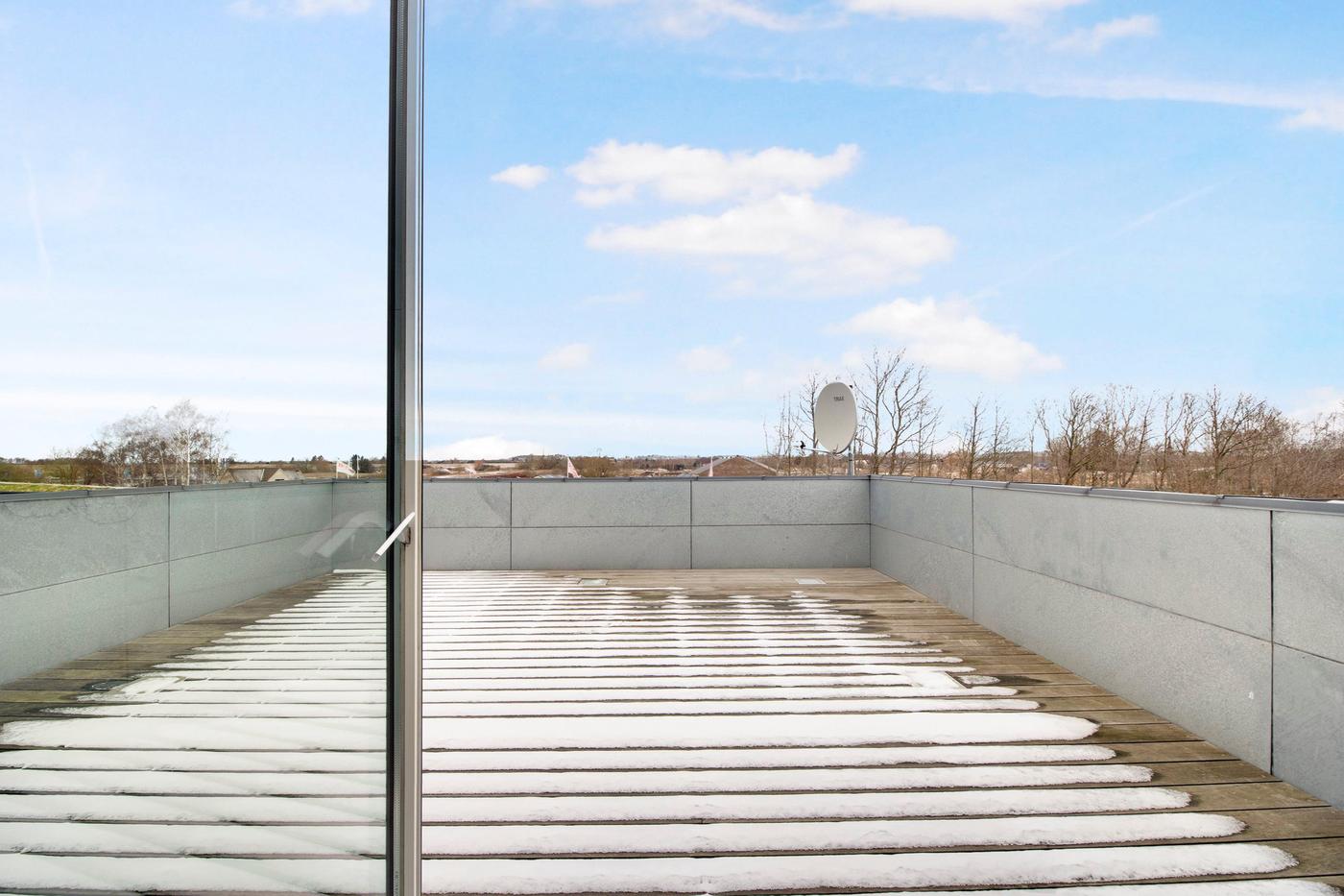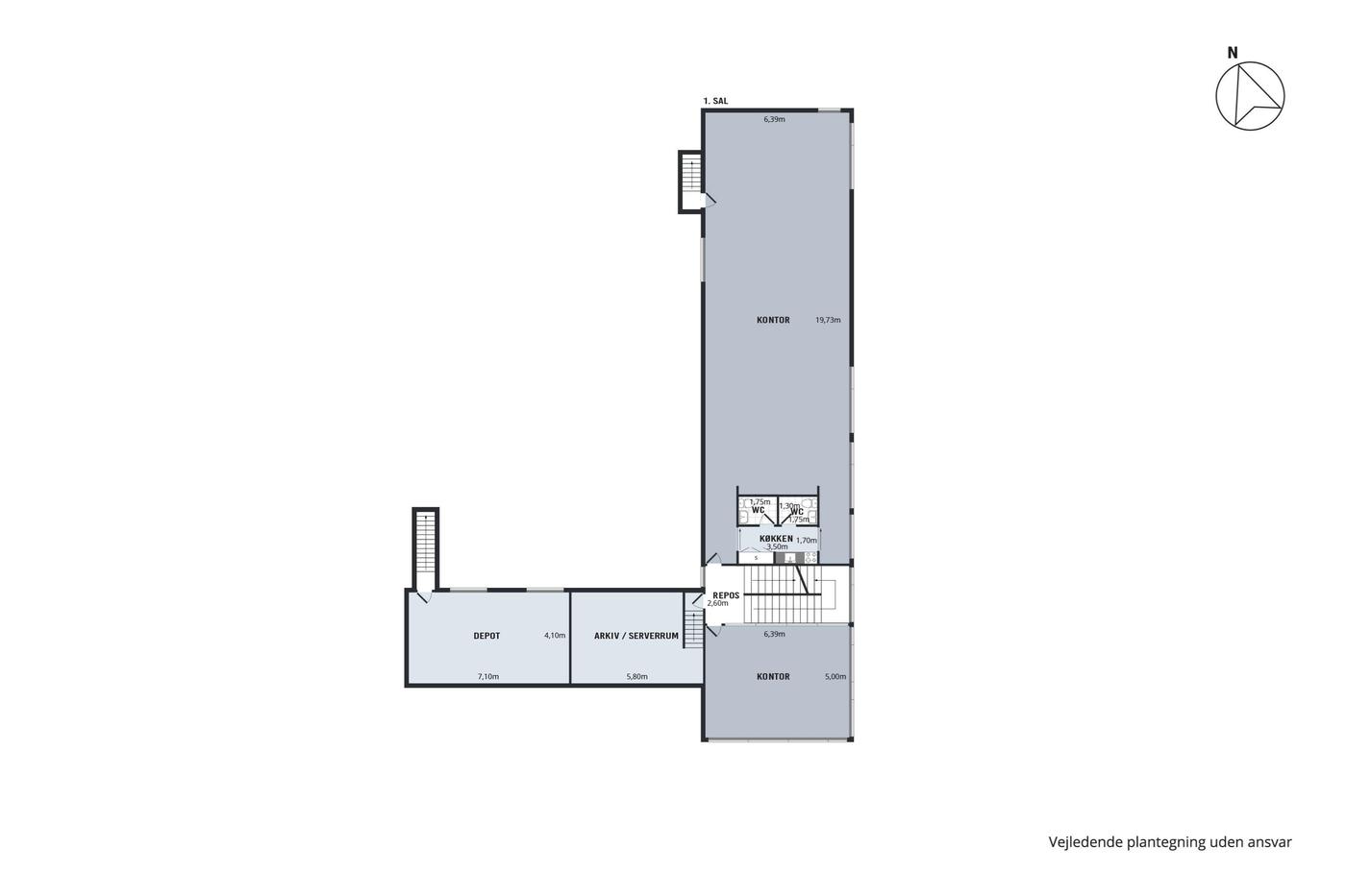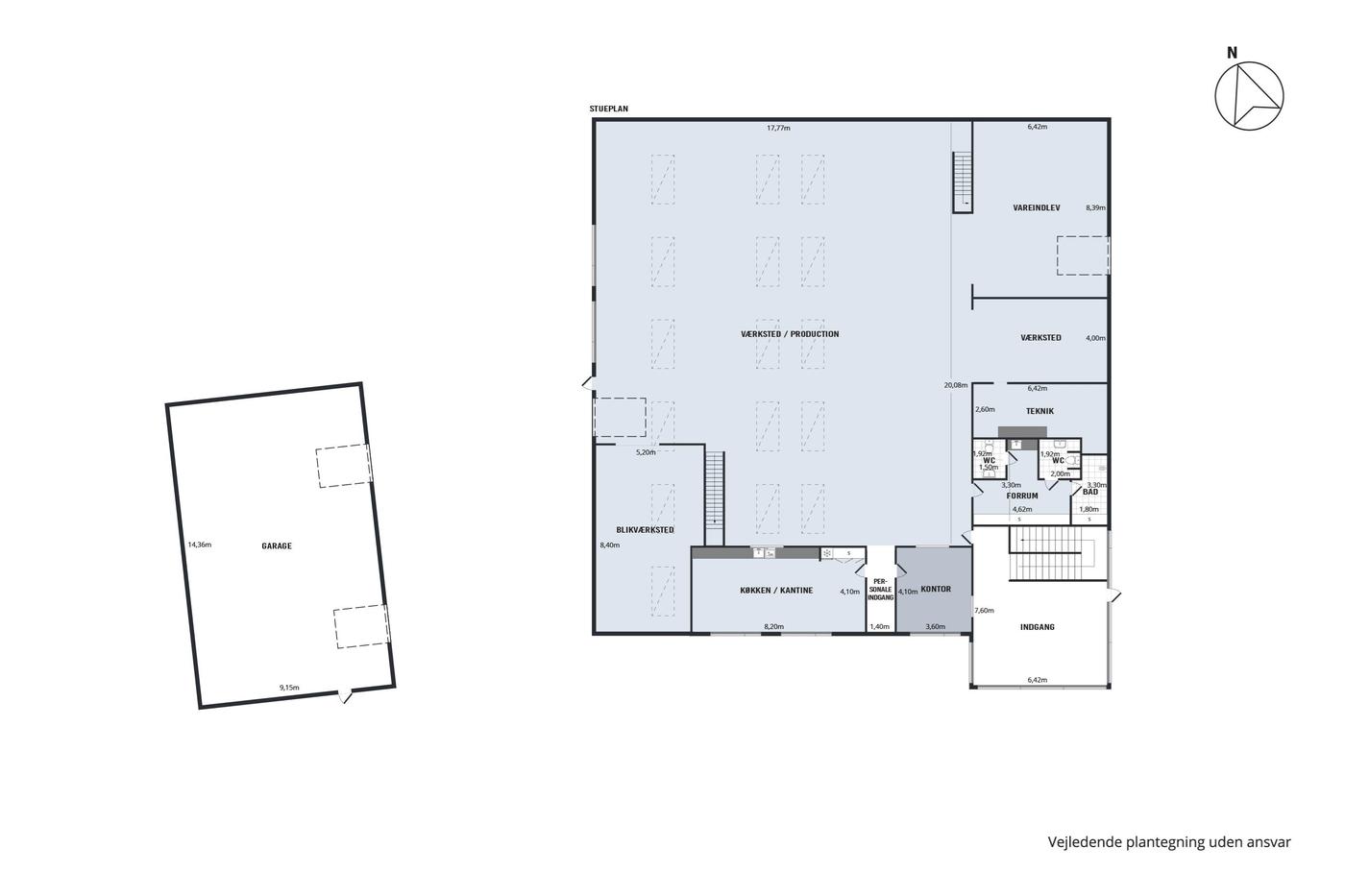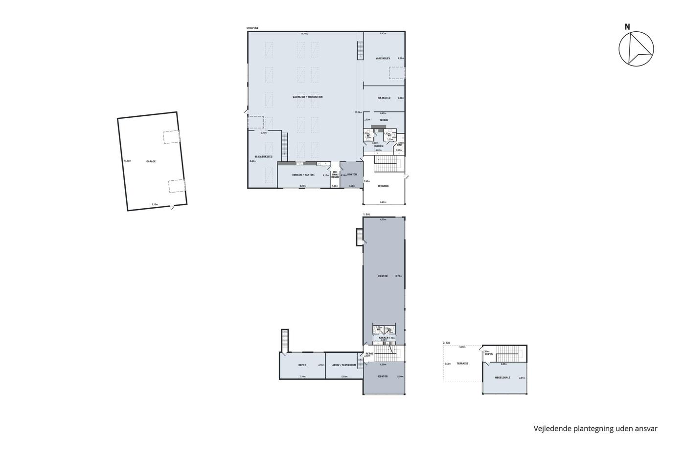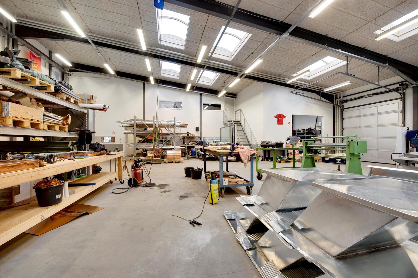 Den store, flotte brugerejendom er opført i 2005, hvilket sikrer jer stilrene og kvalitetsbevidste materialer. Bygningens store glasfacader giver jer ydermere et lyst arbejdsmiljø, hvor medarbejderne kan nyde en fin udsigt ud over området. Omkring bygningen kan I glæde jer over befæstede udearealer, og her er der desuden gode parkeringsforhold til biler og cykler. Bygningen er fordelt i tre etager, der giver jer en ideel kombination af lager og kontorlandskaber. Her er der i stueplan et stort værksted, der egner sig godt til lagerrum eller produktion. Her er der også et køkken med kantine, mens etagen også rummer mindre kontorer og værksteder samt et bad og to toiletter. Med bygningens store porte, er der her gode muligheder for varelevering. På første sal venter et stort, åbent kontorlandskab, som kan rumme en masse borde og stole. På etagen er også et køkken, et selvstændigt kontor, depotrum, kopirum og to toiletter. På anden sal får I glæde af et stort mødelokale, og heroppe har I direkte udgang til et stort, vestvendt terrassemiljø, hvor frokostpausen kan nydes i de varme måneder.