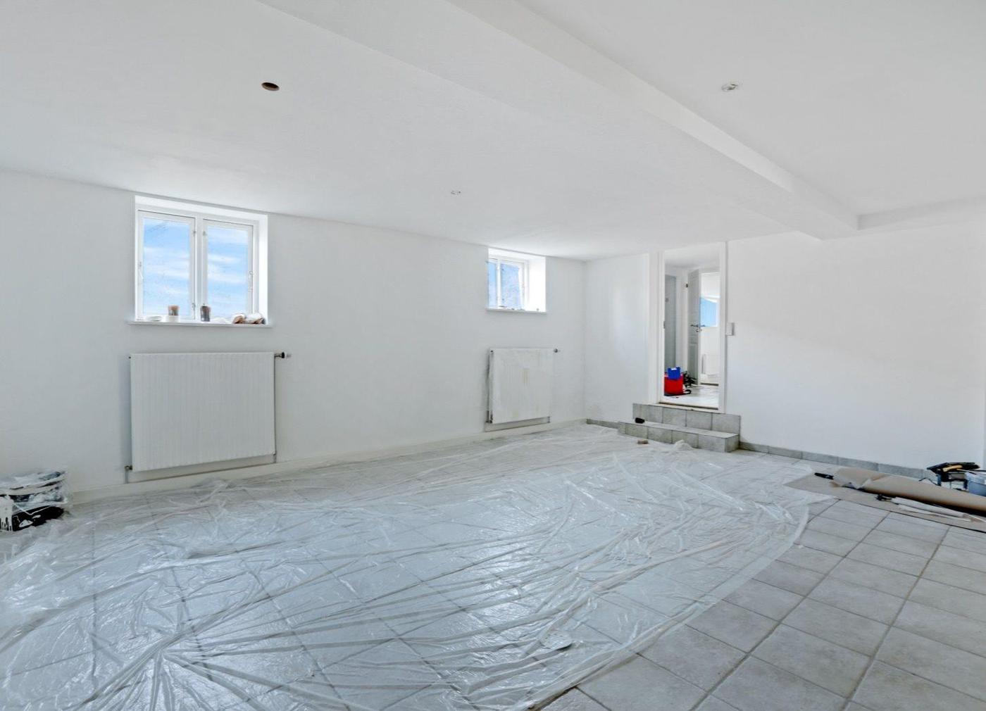 Ja, lokalerne råder i alt over 146 m2, og de placerer sig i den lyse og høje kælderetage i den elegante villaejendom, der præsenterer sig selv smukt med en hvidpudset facade, et mørkt tegltag og hvide karme om vinduerne. Fra vejen fører den stenbelagte indkørsel hen til parkeringsområdet bag ejendommen, og herfra er der adgang til lokalerne via hoveddøren.