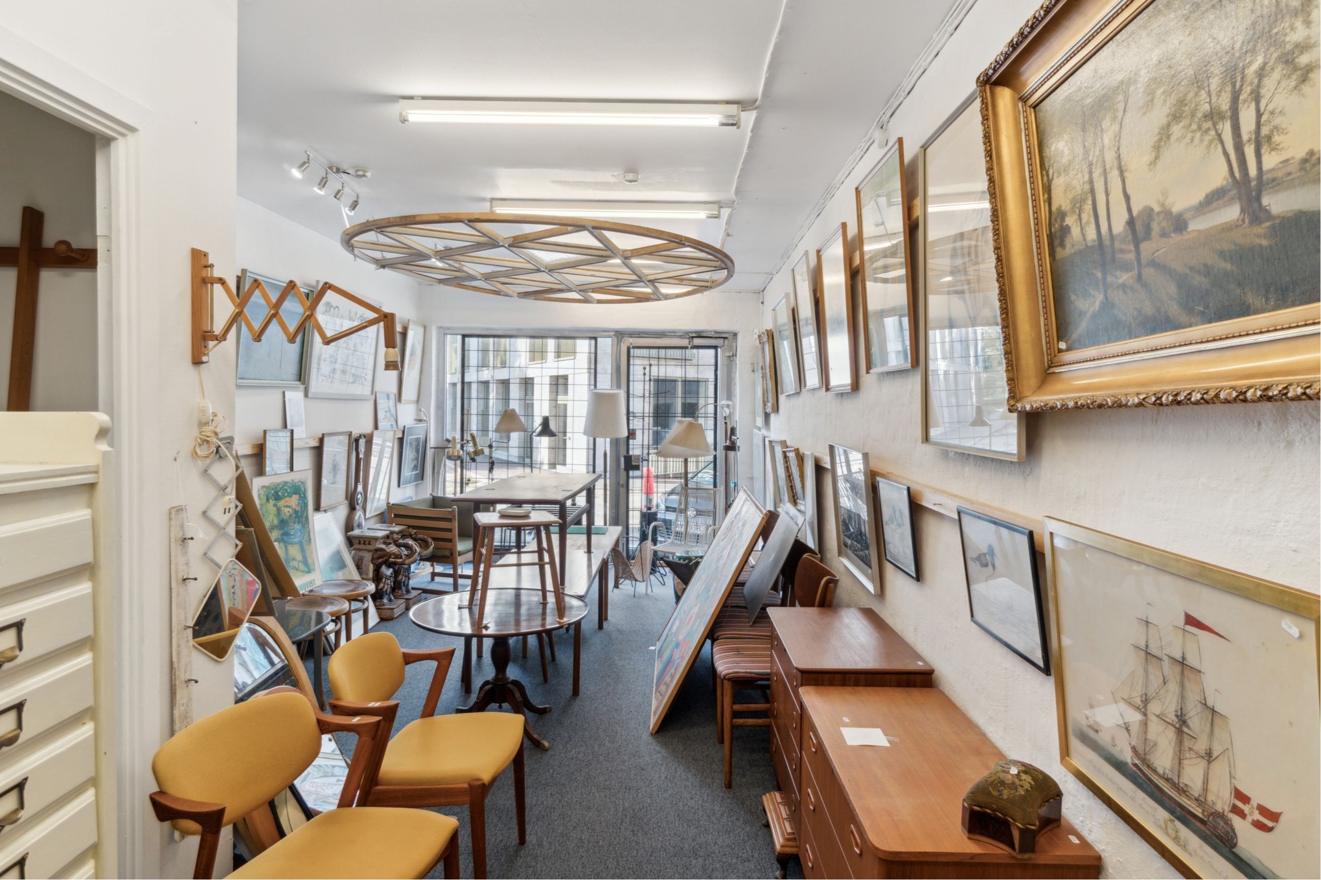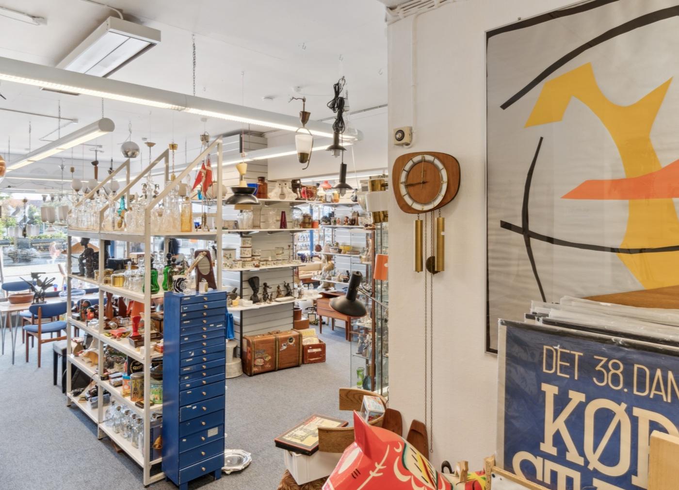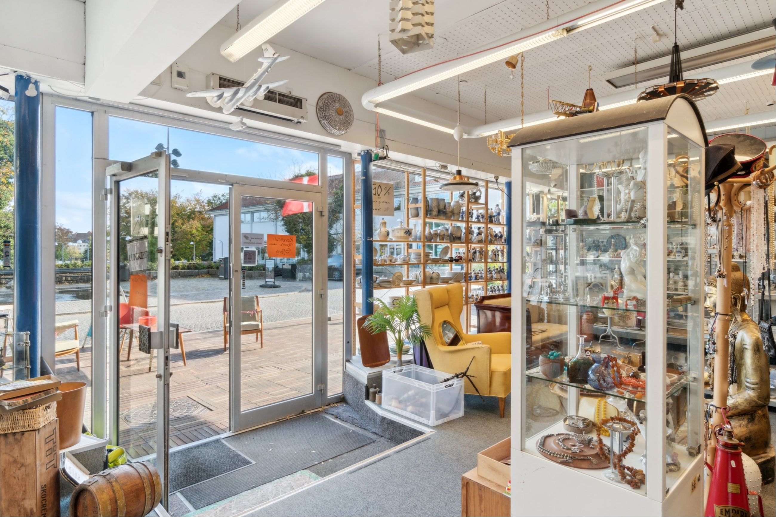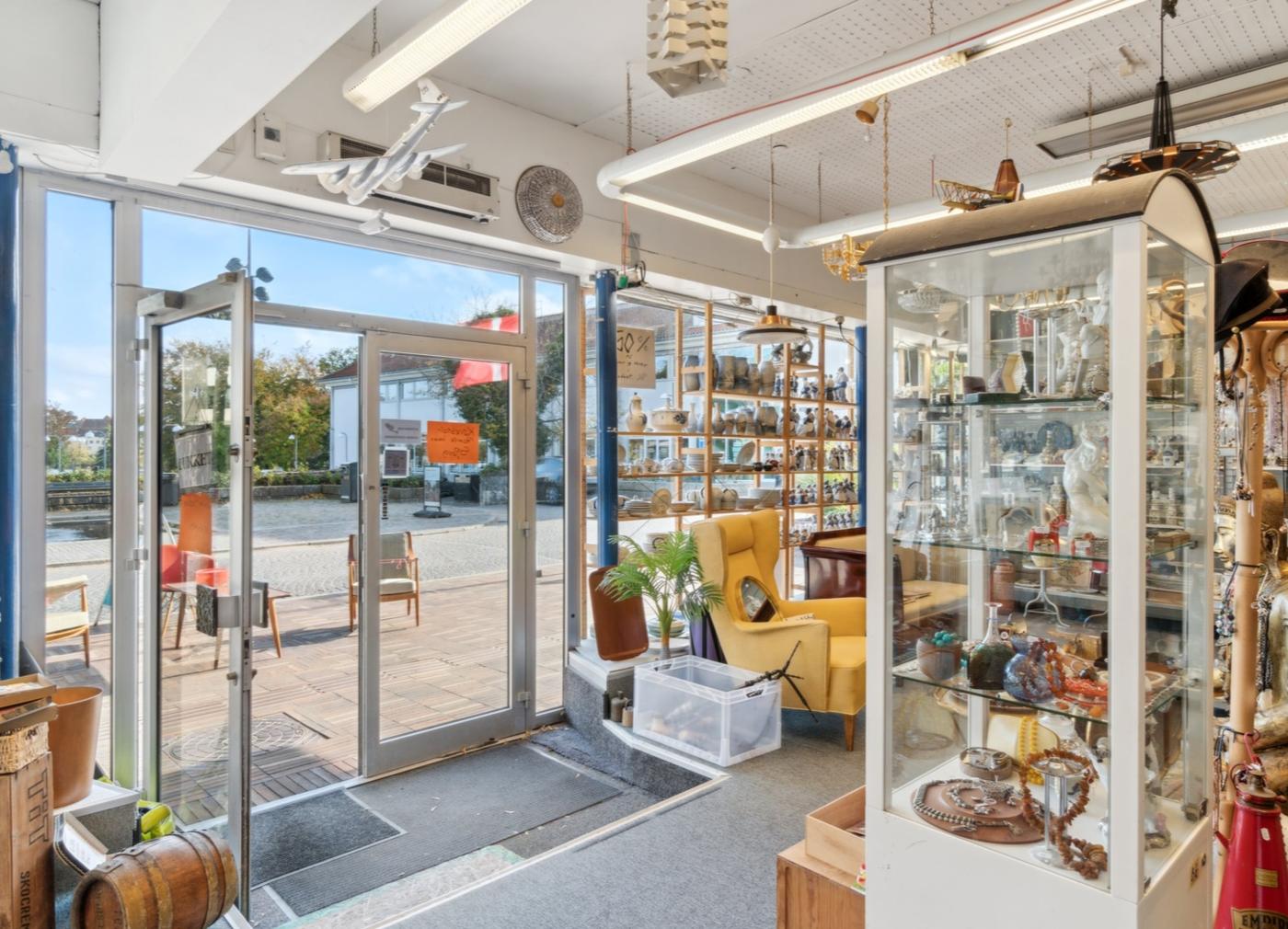 Inden døre møder I først og fremmest butikslokalerne, som for nuværende er indrettet til antikvariat. Det er bestemt også oplagt at tage indretningen i andre retninger og på den måde forme og skabe de rammer, I har brug for. Pladsen er under alle omstændigheder rigtig god.