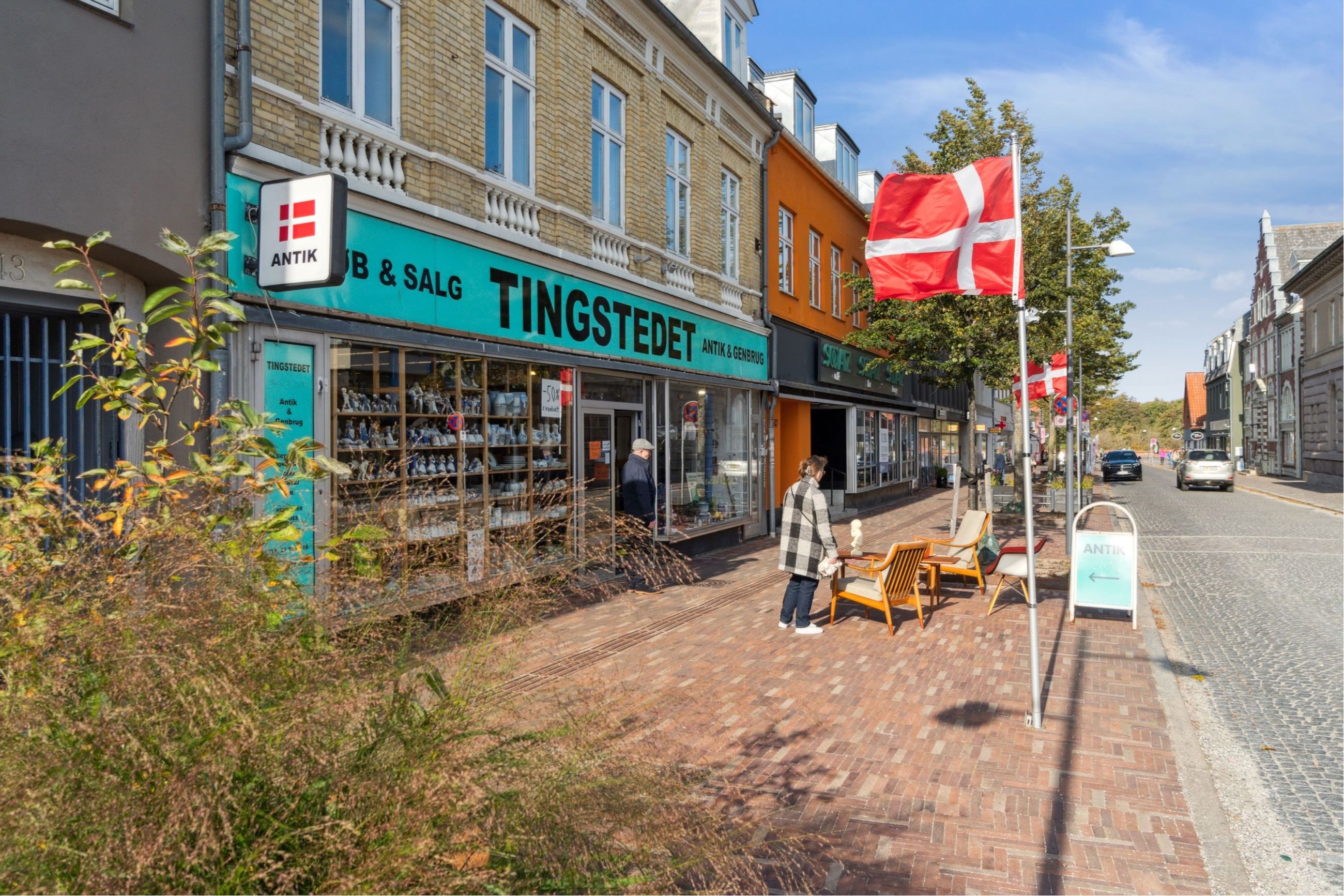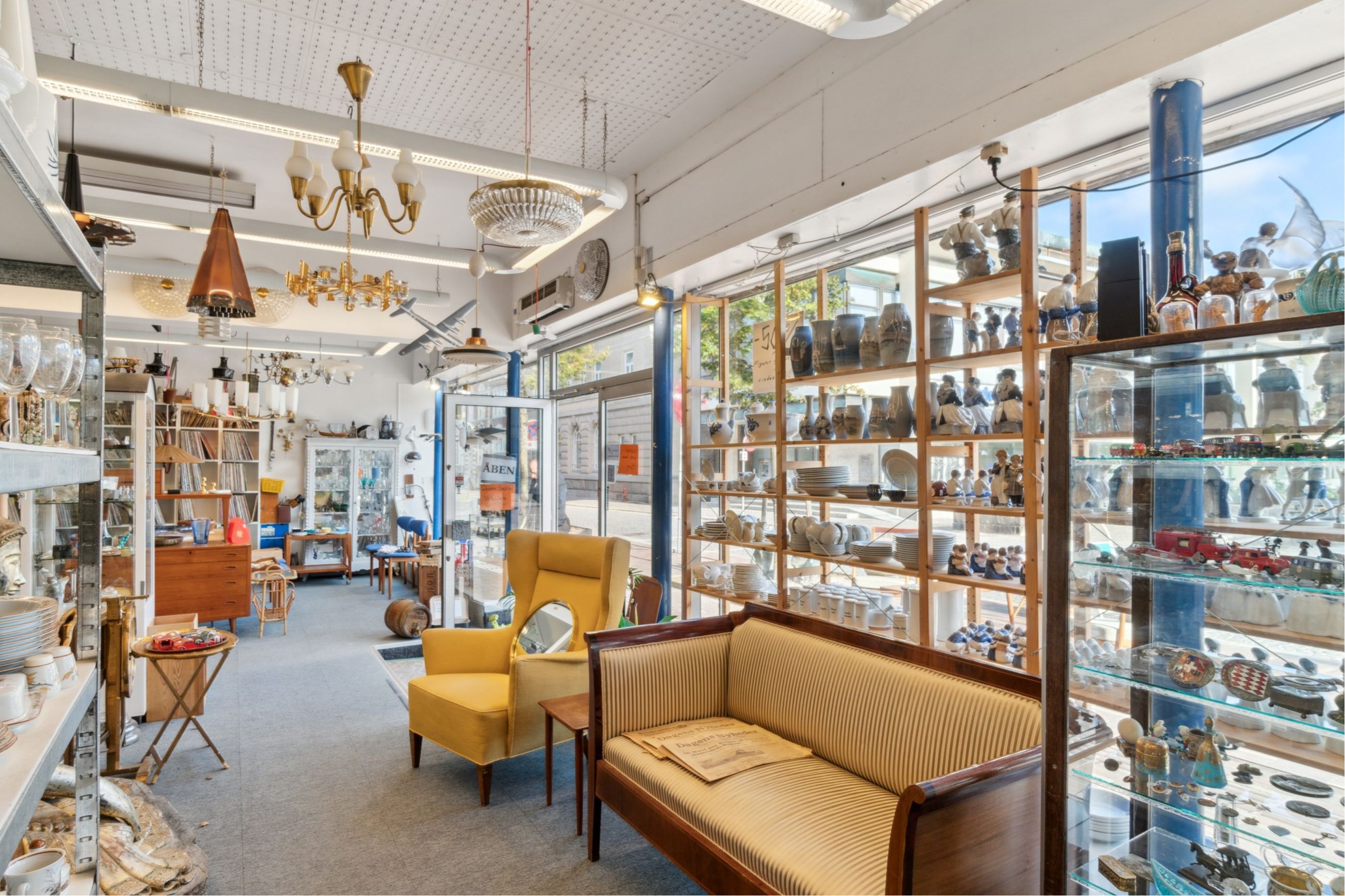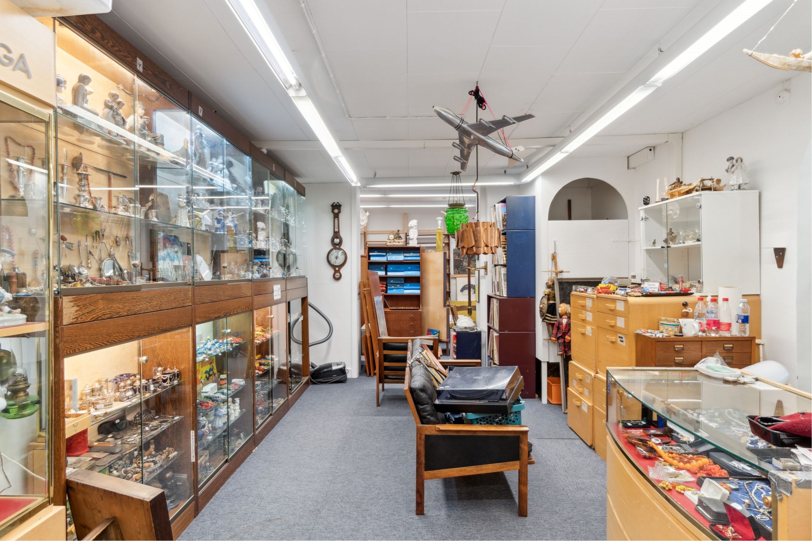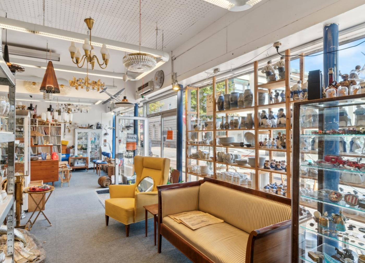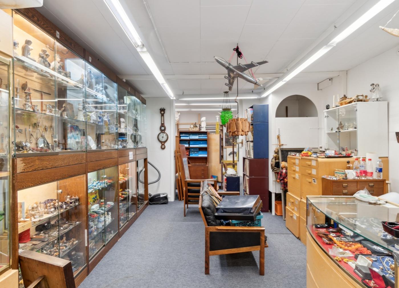 Inden døre møder I først og fremmest butikslokalerne, som for nuværende er indrettet til antikvariat. Det er bestemt også oplagt at tage indretningen i andre retninger og på den måde forme og skabe de rammer, I har brug for. Pladsen er under alle omstændigheder rigtig god.