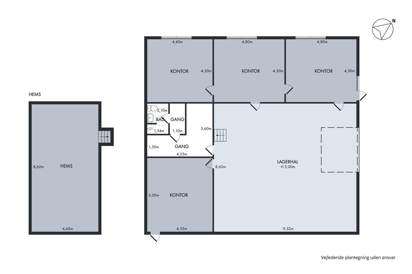 Vi udbyder nu en gedigen erhvervsejendom til udlejning, hvor du får praktiske og velholdte rammer om din virksomhed. Her er der både god kontorplads og et rummeligt lager, så mulighederne er nærmest uendelige. Det er ydermere en beliggenhed i topklasse, der vil danne grundlaget for arbejdslivet her. Med en central placering i et veludviklet industrikvarter i Allerød får du nemlig en god og tilgængelig beliggenhed midt i det attraktive Nordsjælland, og så ligger området i nem forbindelse til et veletableret lokalsamfund, som rummer et godt potentiale for både kunder og kvalificeret arbejdskraft. Fra lejemålet er der få minutters kørsel til motorvejen, hvorfra du hurtigt vil finde vej mod større byer. Bl.a. kan du nå Hillerød på ca. ti minutter i bil, mens både Helsingør og København ligger omtrent en halv time væk. Derudover er der gode offentlige transportforbindelser, bussen stopper i gåafstand lige nede på Frederiksborgvej, og ellers er der kun 2,5 kilometer til Allerøds S-togsstation, som forbinder dig til det meste af Nordsjælland og Hovedstadsområdet. Ejendommen fremstår pæn og velholdt, og der er prioriteret plads til en bred indkørsel ved porten samt flere parkeringspladser ude foran. Inde fordeler kvadratmeterne sig ud over en gennemtænkt planløsning, der rummer i alt fire kontorlokaler og et stort lager. Hertil kommer et gangareal med adgang til WC og bad. Hvis vi først dvæler ved lagerrummet, er det værd at lægge mærke til den gode loftshøjde, det slidstærke gulv, den elektriske port og ikke mindst den pladsoptimerende hems, hvor der også er en fin loftshøjde. De fire kontorer er alle indretningsvenlige med et godt lysindfald, og her kan du indrette kontorer, mere lagerplads, frokoststue eller deslige. Under alle omstændigheder er udgangspunktet godt.