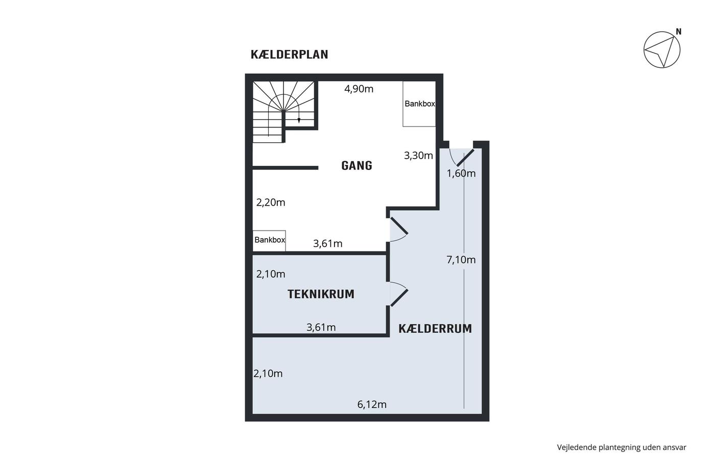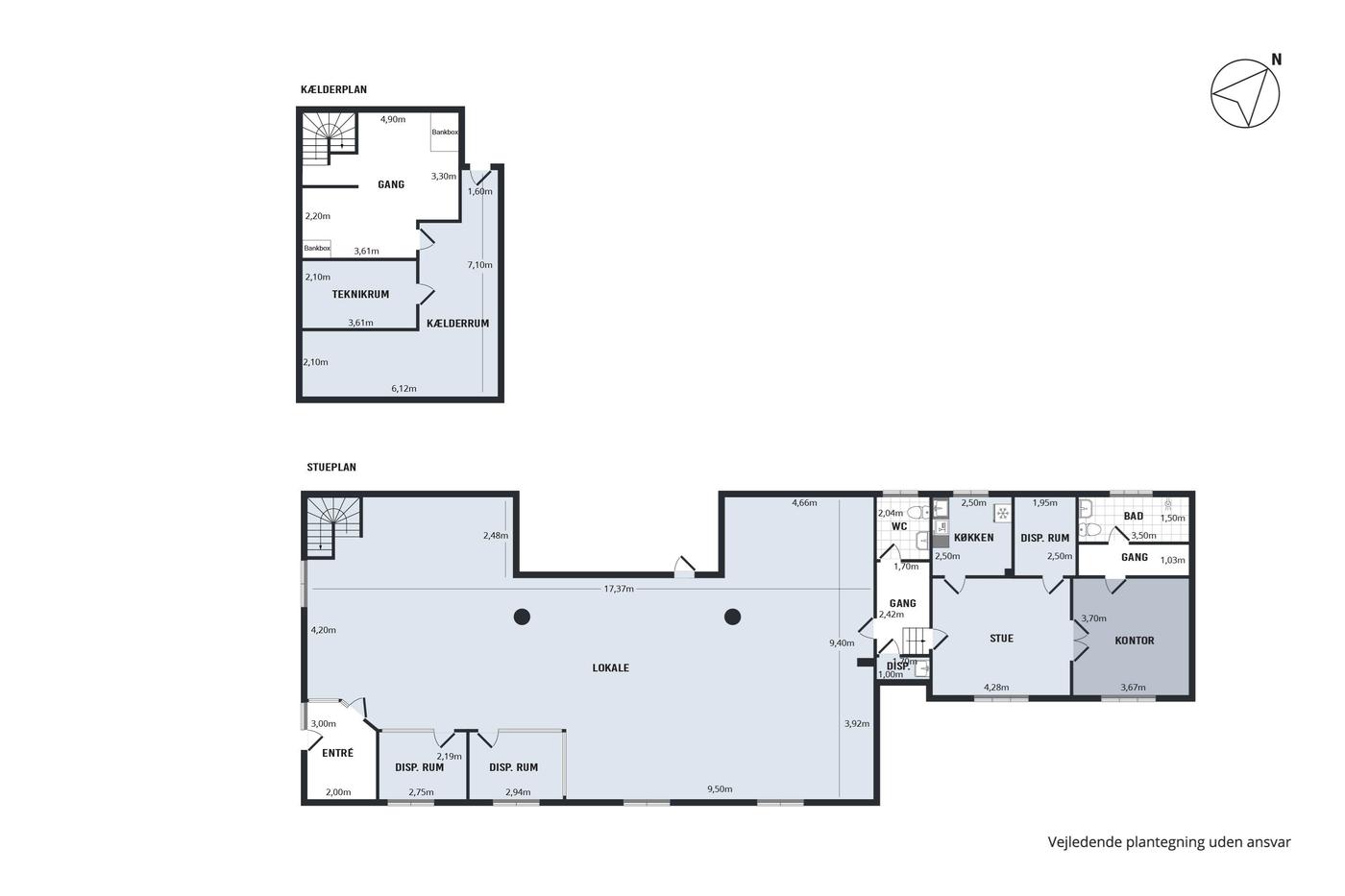 I den anden ende af bygningen forefindes et køkken i forbindelse til to stuer en suite, der giver medarbejderne mulighed for at nyde frokosten sammen. Her er også et toilet og et lyst badeværelse samt gode muligheder for at lave ekstra toiletter. I kælderen er der egen indgang og rigeligt med plads til opbevaring.