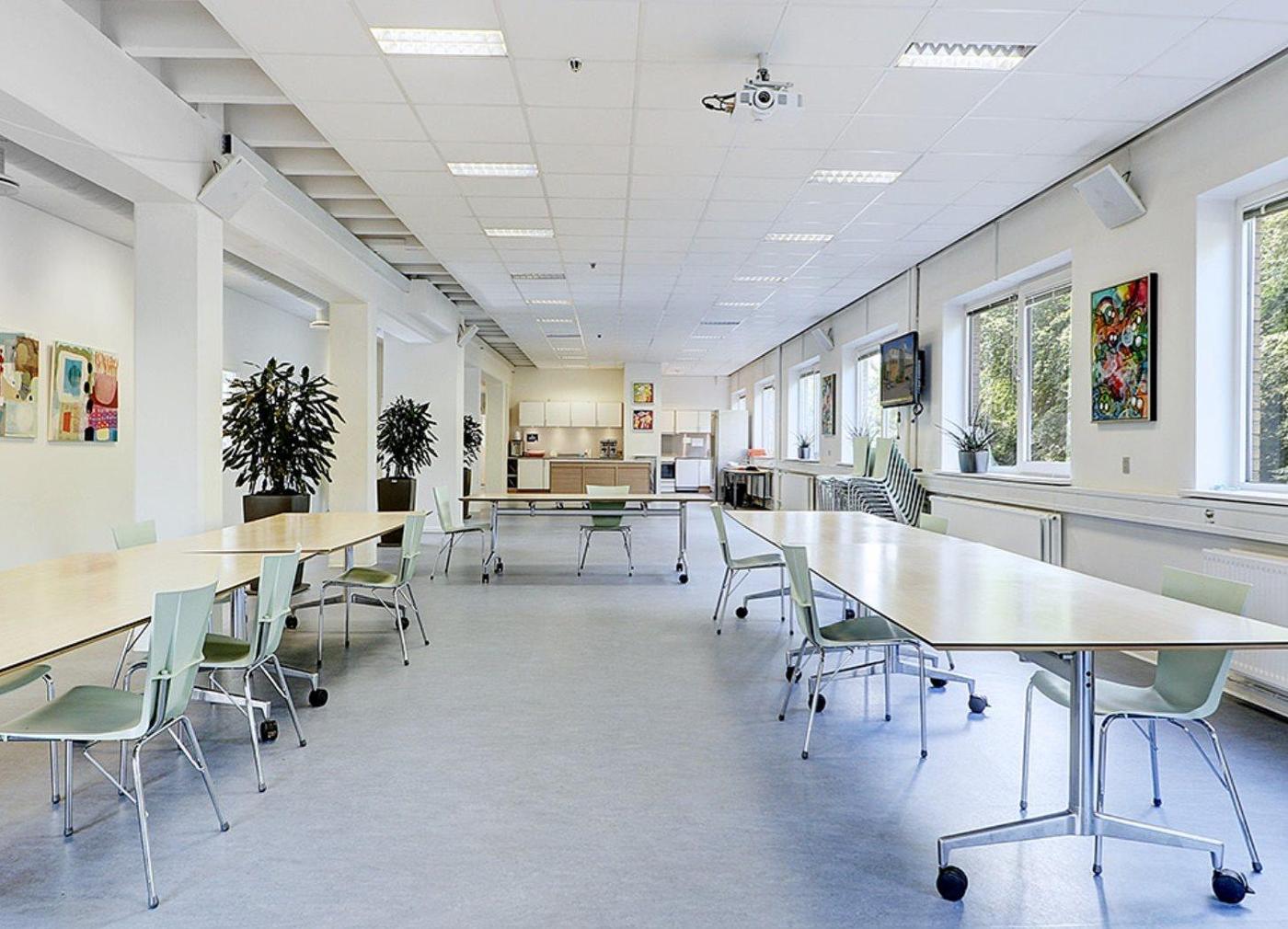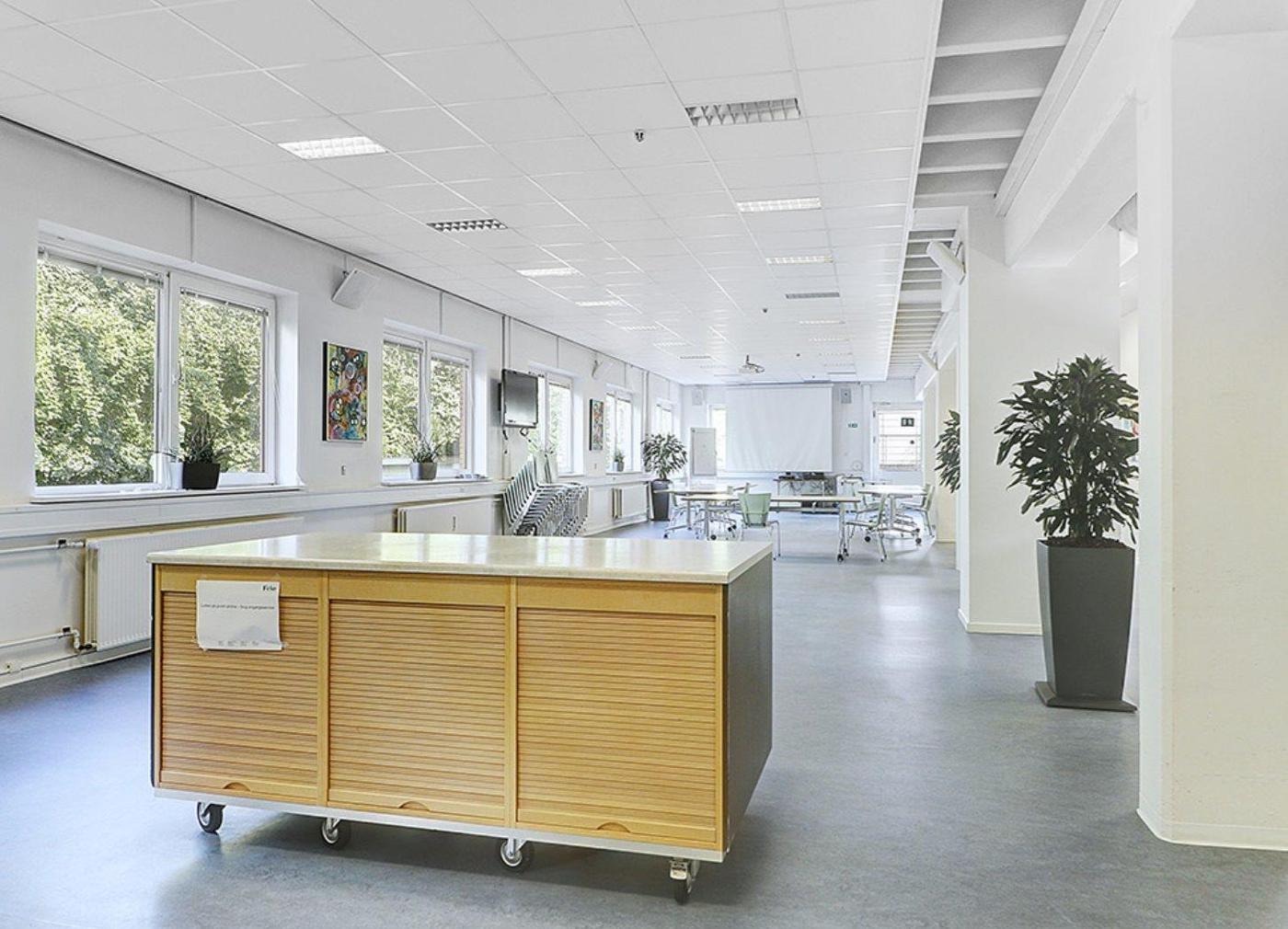 Bygningens stueetage fremstår pænt renoveret med lyse trægulve, samt nyere akustiklofter. I stueplan er tillige indrettet kantineområde med anretter-køkken.