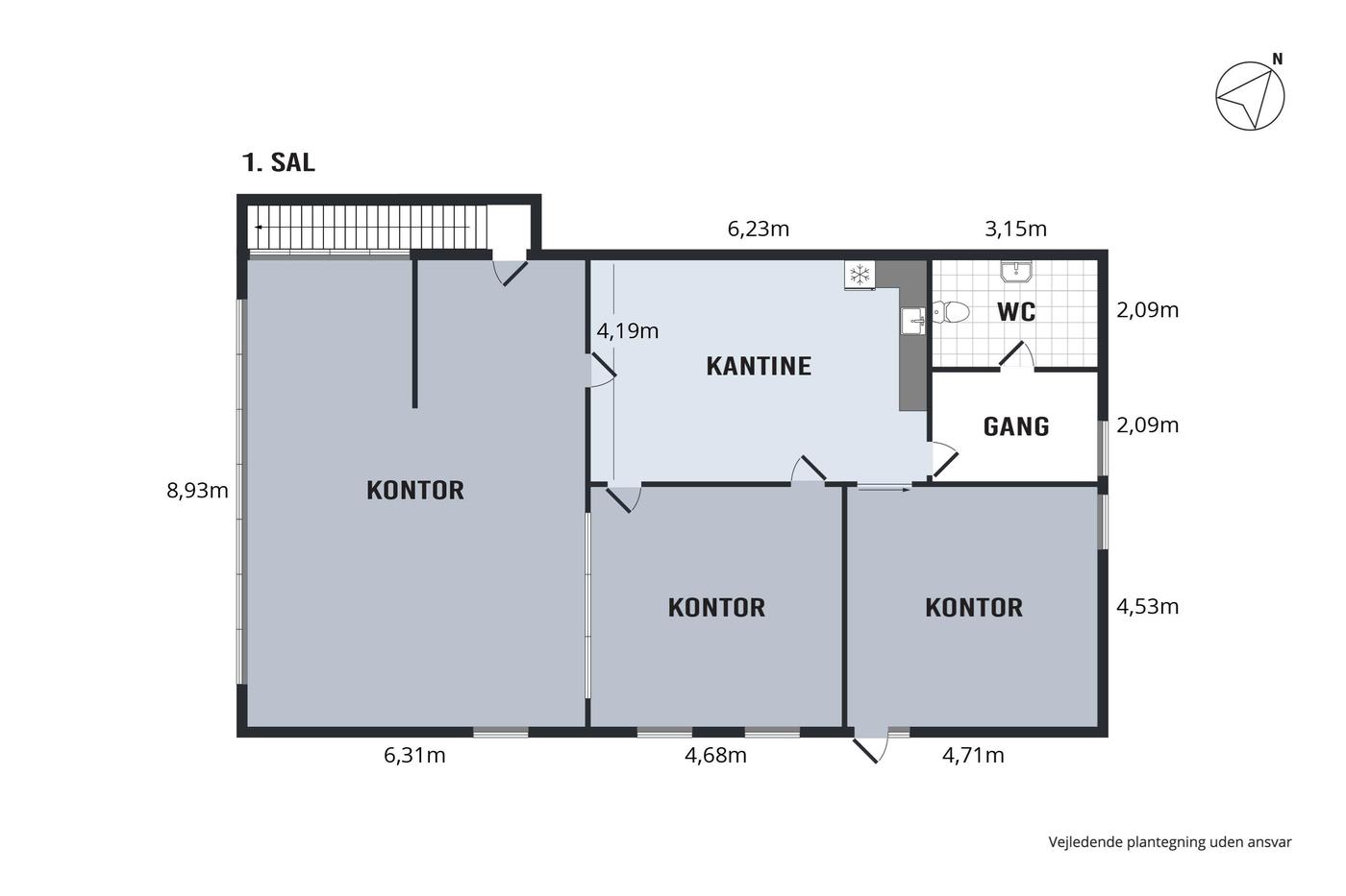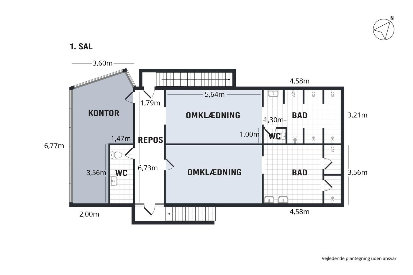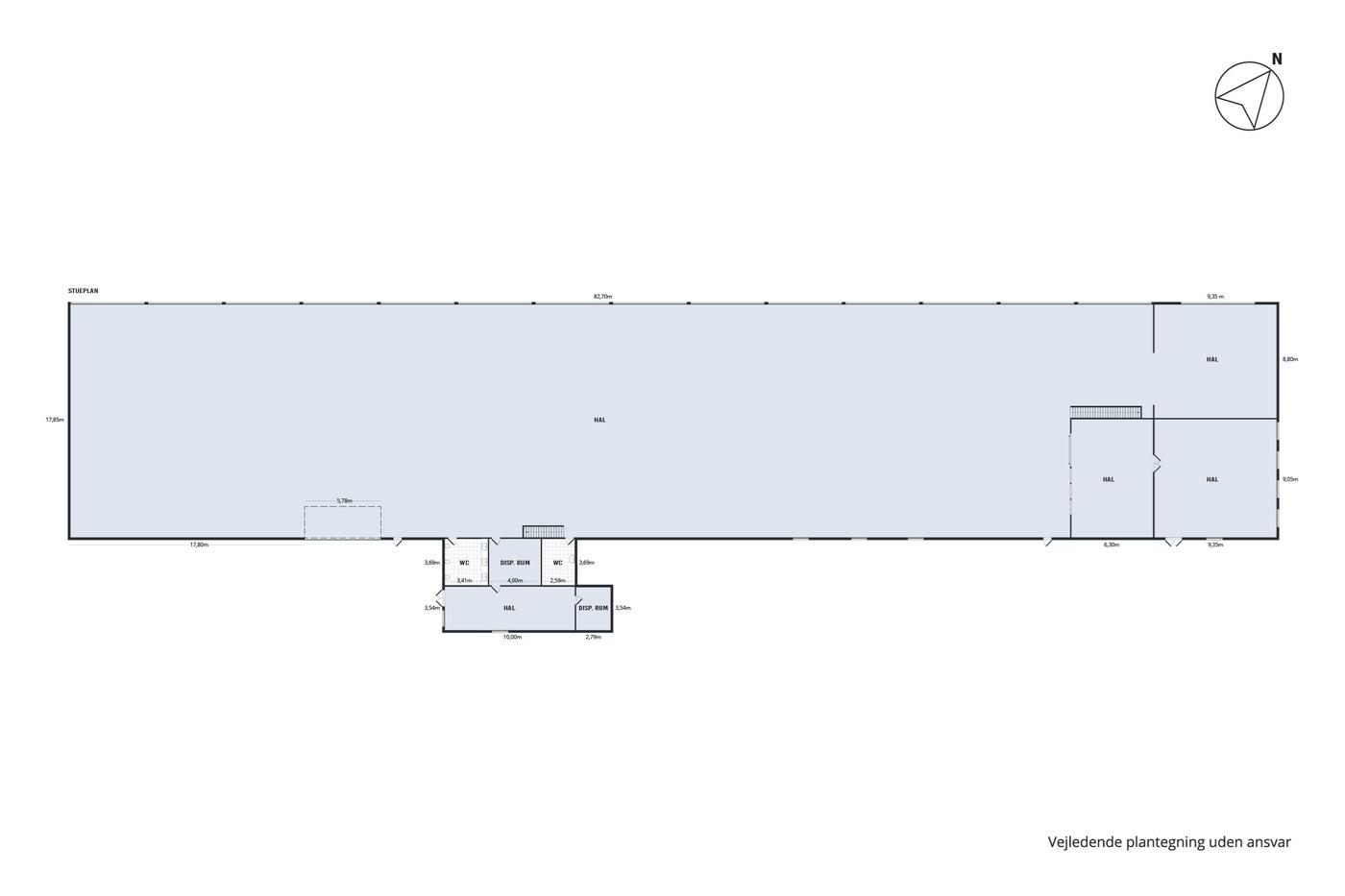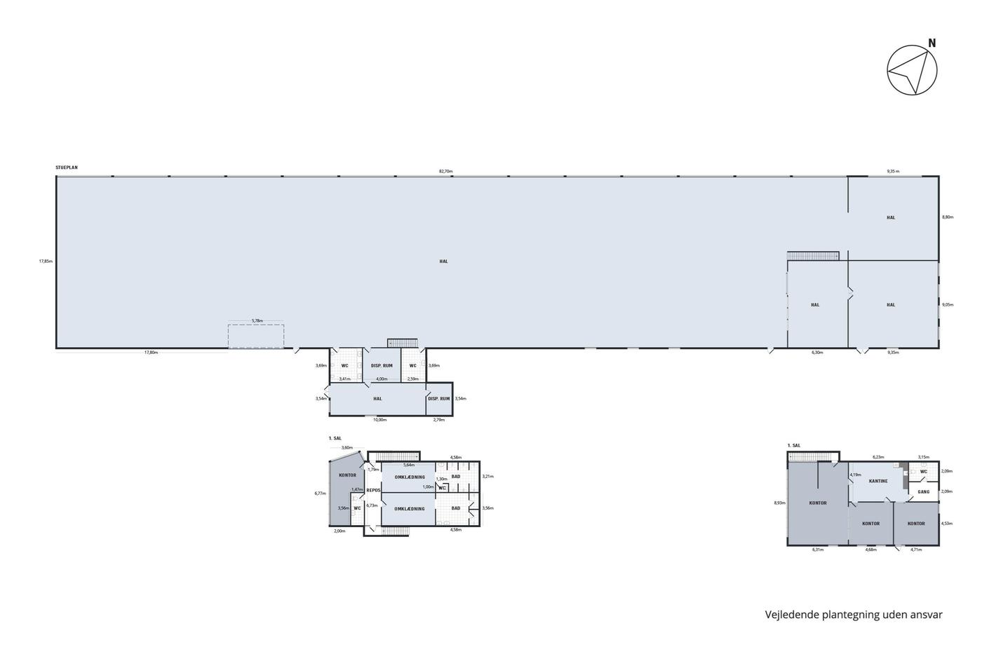 Ejendommen består først og fremmest af at stort og højloftet lagerrum, hvor der er enormt meget plads. På ejendommens 1. sal ligger to omklædningsrum med tilhørende baderum, og dette er ganske oplagt, hvis du har ansatte, der har brug for et sted, hvor de kan klæde om. På 1. salen ligger også et lækkert kontorafsnit indrettet med tre store kontorlokaler og et område med køkken. I forlængelse af køkkenet ligger også et WC.
