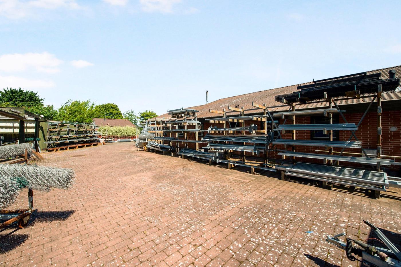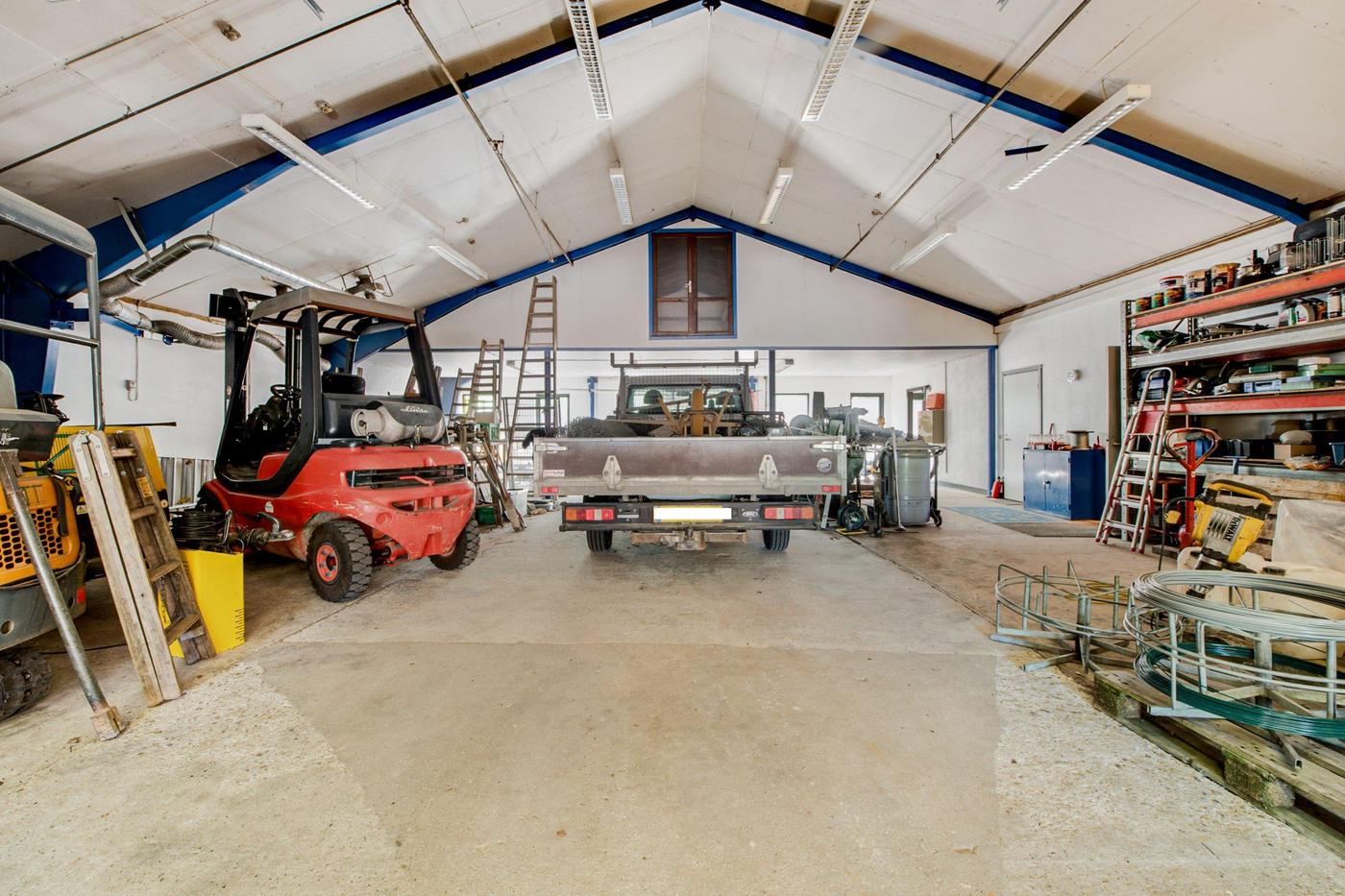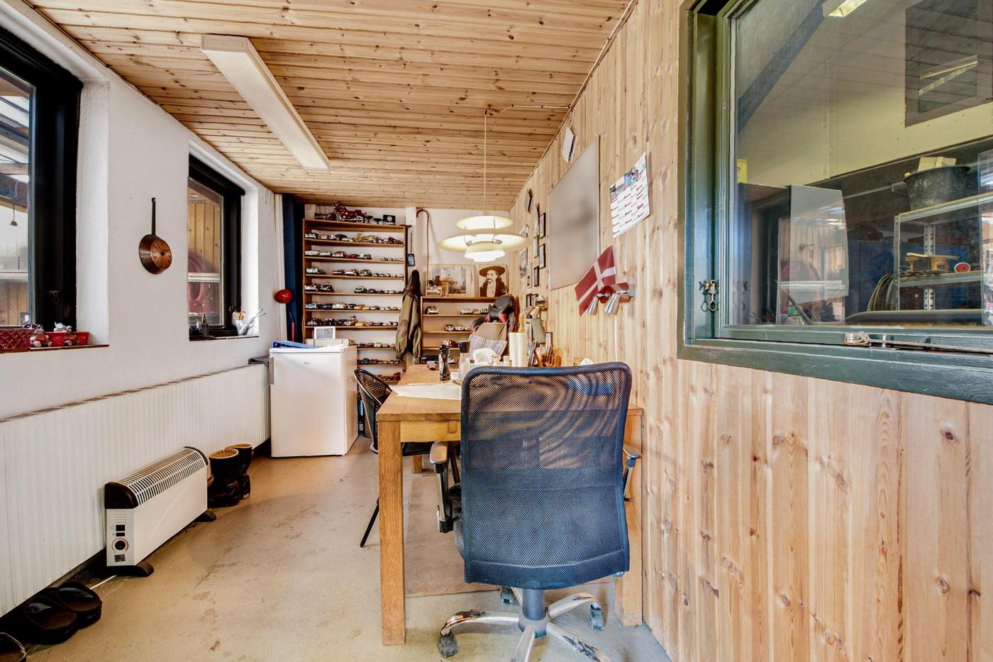 Fra vejen drejer man ind på den brede plads foran erhvervsbygningen, så der for potentielle kunder er nem adgang til de ydelser, der tilbydes. Først ligger garagen og dernæst værkstedet, der breder sig ud i to dele: det første med kontor og port mod indkørslen og det andet med endnu en port ind til et større areal samt tilstødende tekøkken, badeværelse, kontor og fyrrum. Her er plads ikke en mangelvare, for de højloftede lokaler giver også mulighed for at udnytte vertikalt med reoler, hemse og lignende.