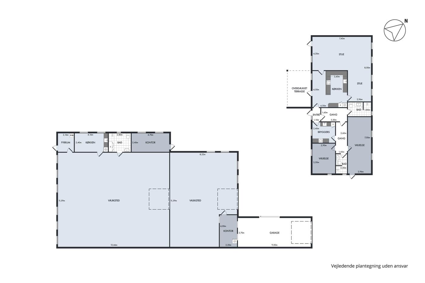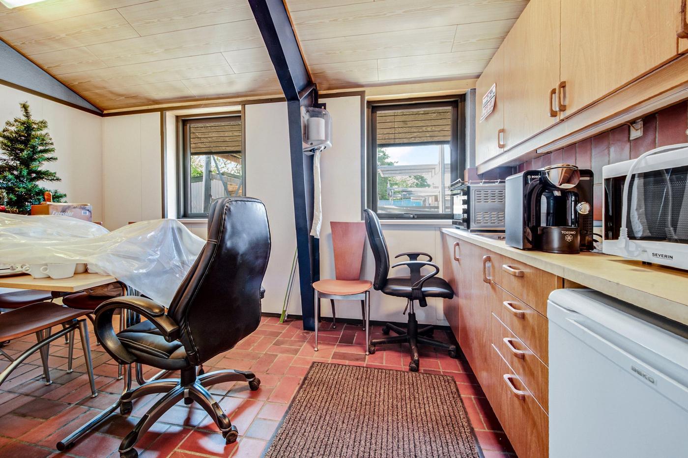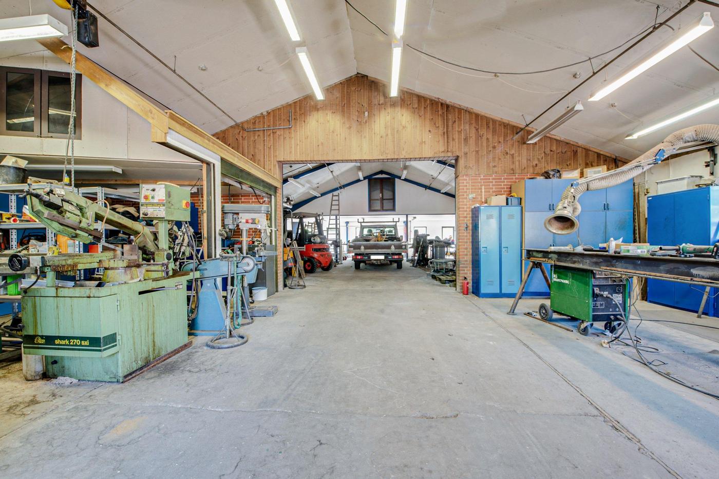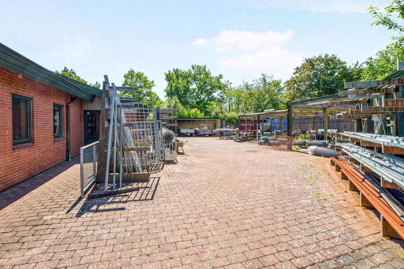 Fra vejen drejer man ind på den brede plads foran erhvervsbygningen, så der for potentielle kunder er nem adgang til de ydelser, der tilbydes. Først ligger garagen og dernæst værkstedet, der breder sig ud i to dele: det første med kontor og port mod indkørslen og det andet med endnu en port ind til et større areal samt tilstødende tekøkken, badeværelse, kontor og fyrrum. Her er plads ikke en mangelvare, for de højloftede lokaler giver også mulighed for at udnytte vertikalt med reoler, hemse og lignende.
