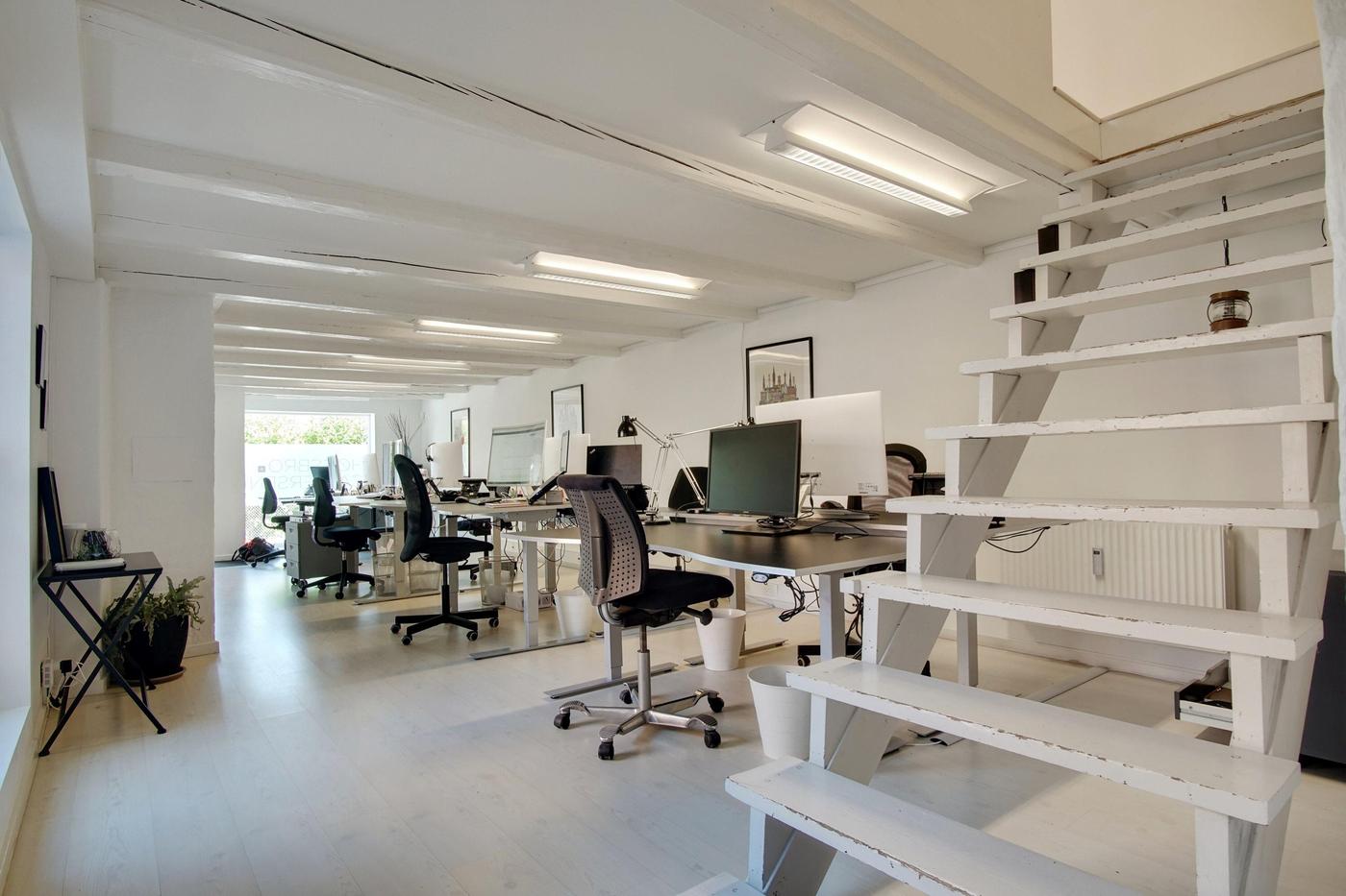 Åbent storrumskontor med trappe til 1. sal - perfekt til kreativ indretning.