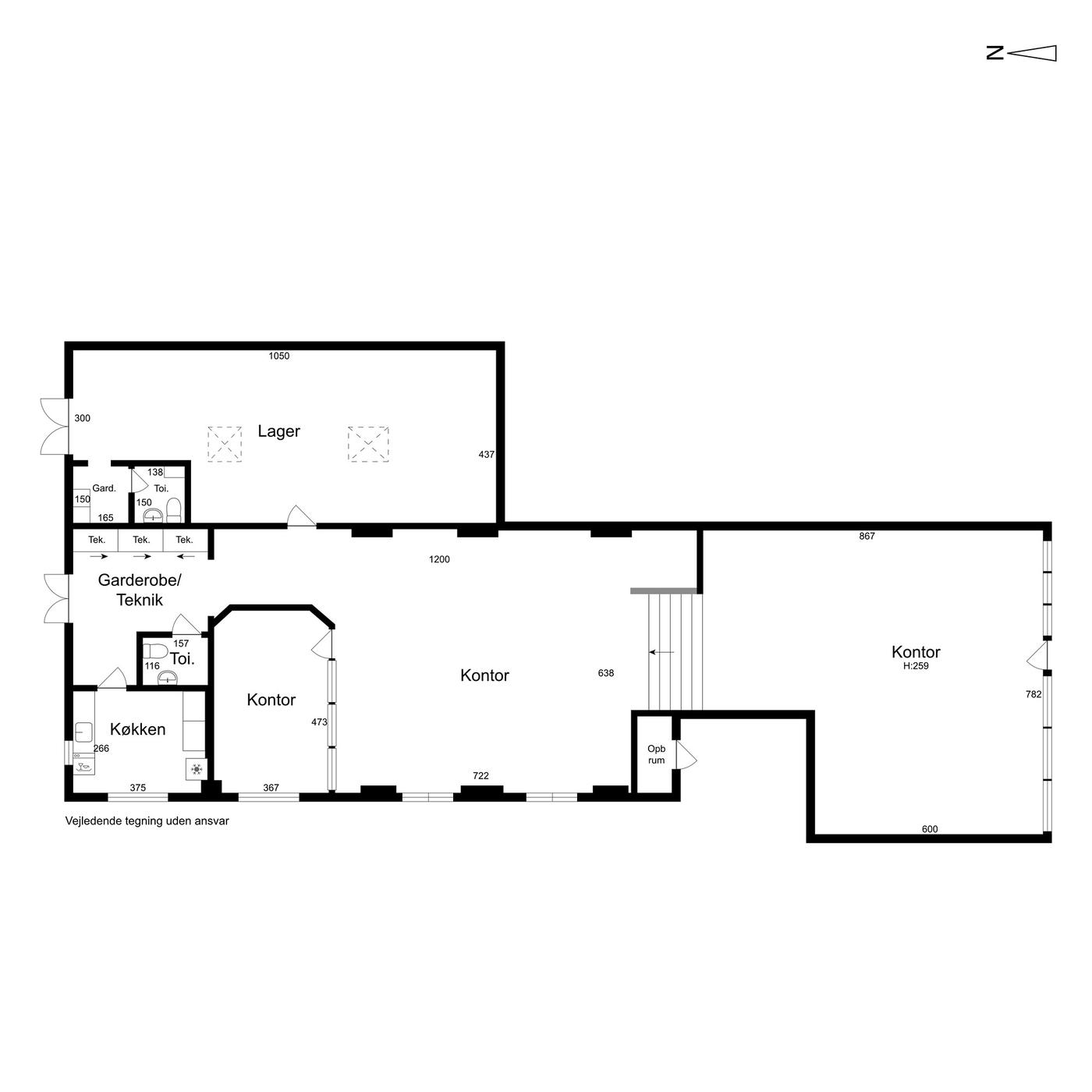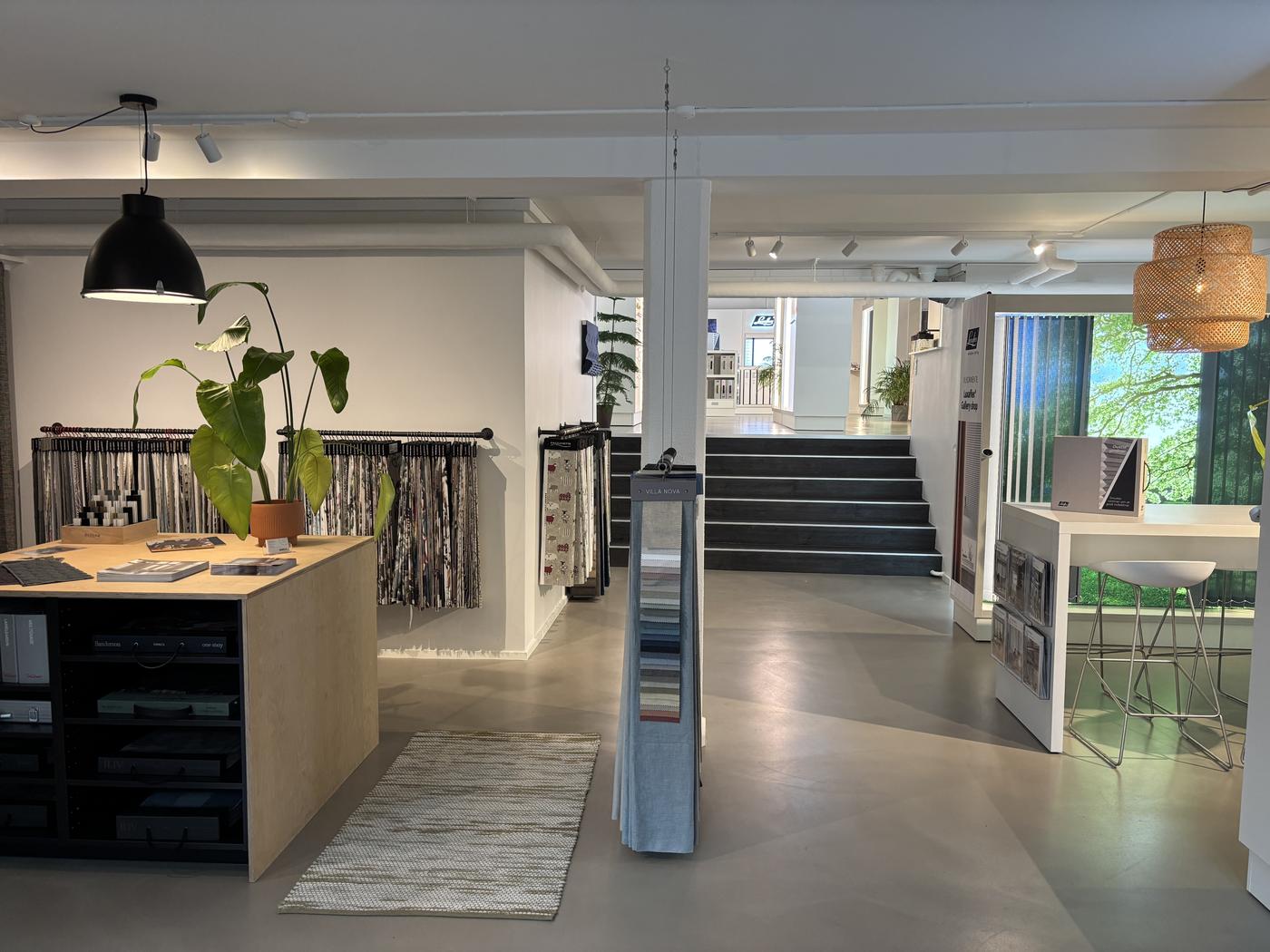 Fra gaden kommer du ind i lejemålet til en flot butik/udstilling. Grundet lejemålets placering overfor et sydliggende grønt område med store træer, er der masser af lysindfald fra de store lydisolerede facadevinduer året rundt. Fra lejemålets forreste del bliver du ledt op ad nogle trapper til næste niveau, der ligeledes bruges til butik/udstilling, igen med godt lysindfald fra de store vinduer samt med yderligere store staldvinduer mod vest. Herefter kommer du til et godt møderum/kontor, garderobe/bagindgang/toilet og køkken. Fra det store åbne kontormiljø kan du komme ind i et tilstødende åbent lokale, der i dag bruges til lager.