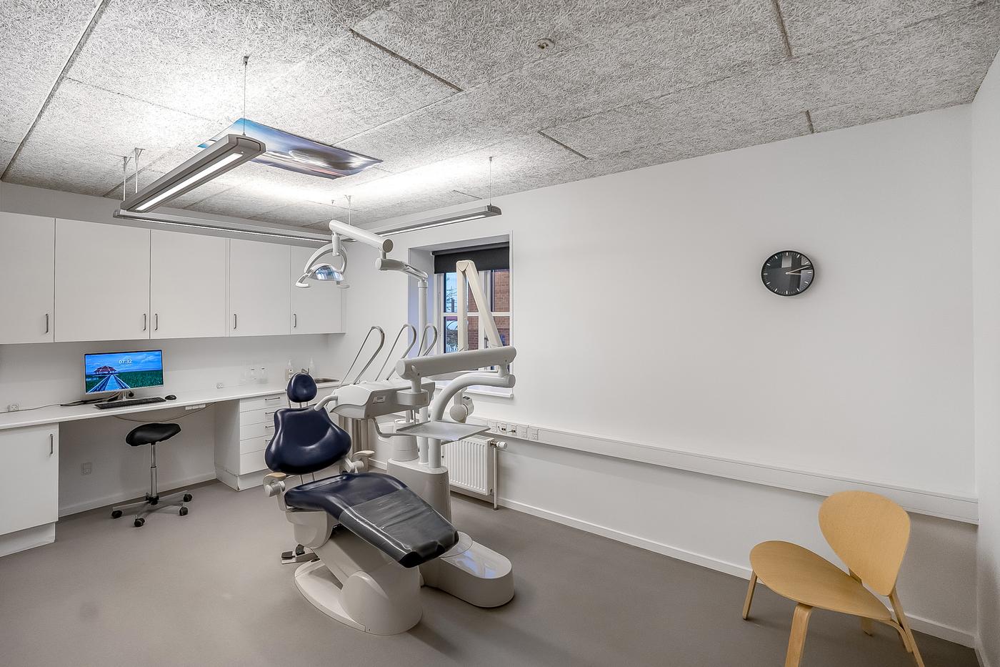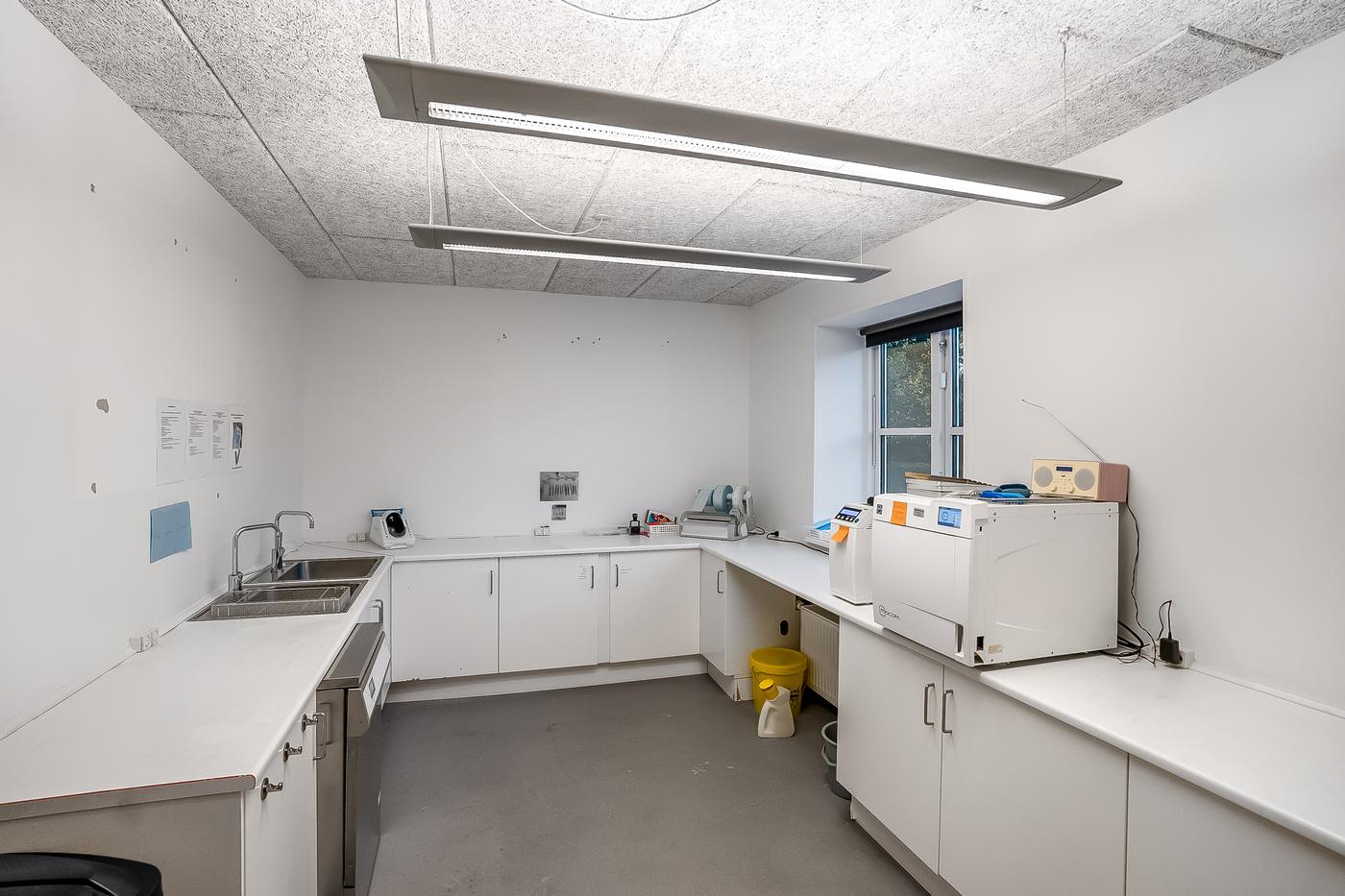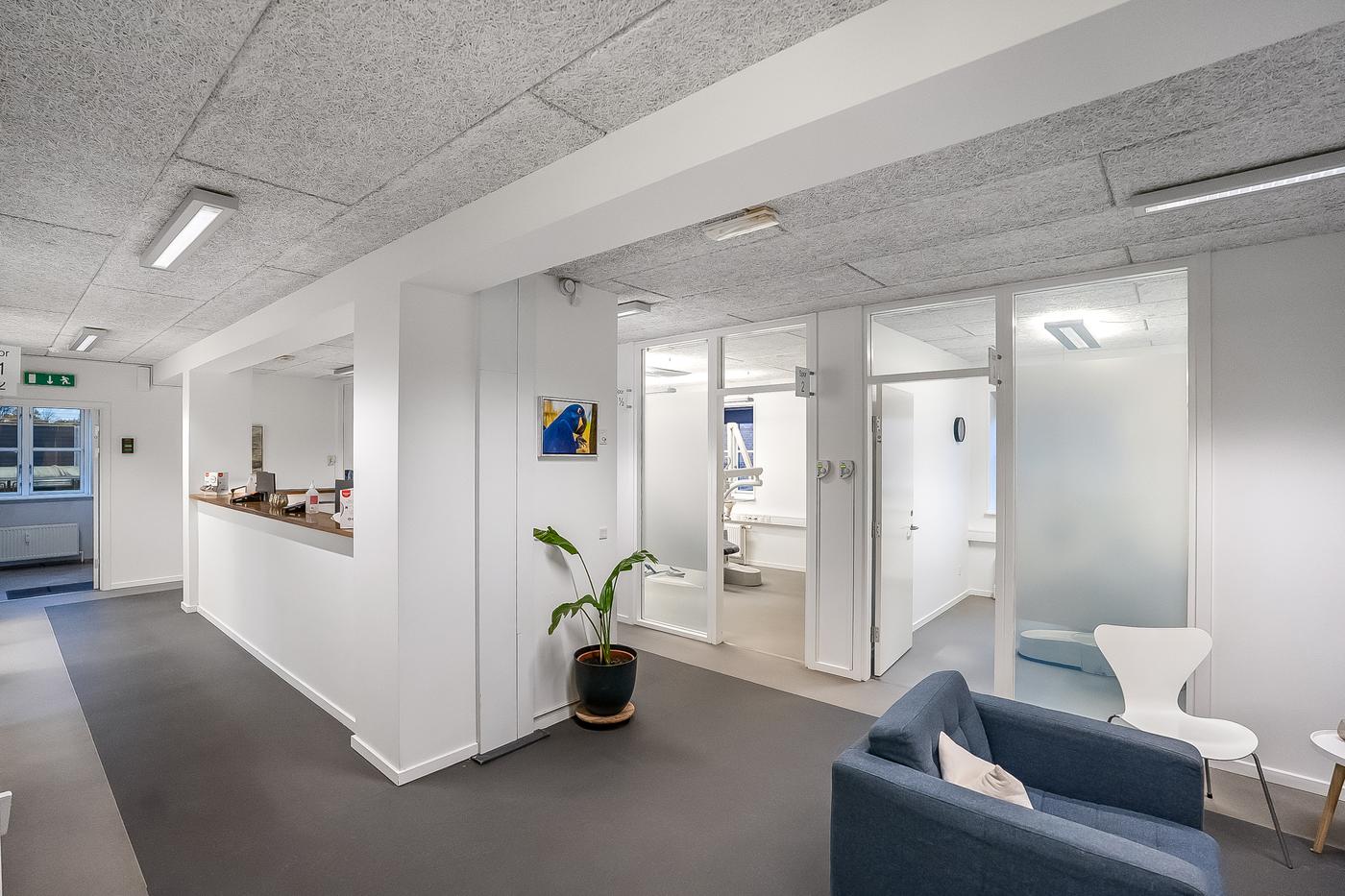 Ejendommen er opdelt i to lejemål. Det ene lejemål som er beliggende i stueplan, er udlejet til en tandlæge, der har været i ejendommen siden 2011. Lejemålet er istandsat og indrettet til lejer. Ved indgangen bliver man mødt af reception og gangareal, der giver adgang til de enkelte klinikker. Herudover er der venteareal, mødelokale, opbevaring og sterilrum i. Lejer har adgang til omklædning, kantineforhold samt vaskerum i kælderplan.
