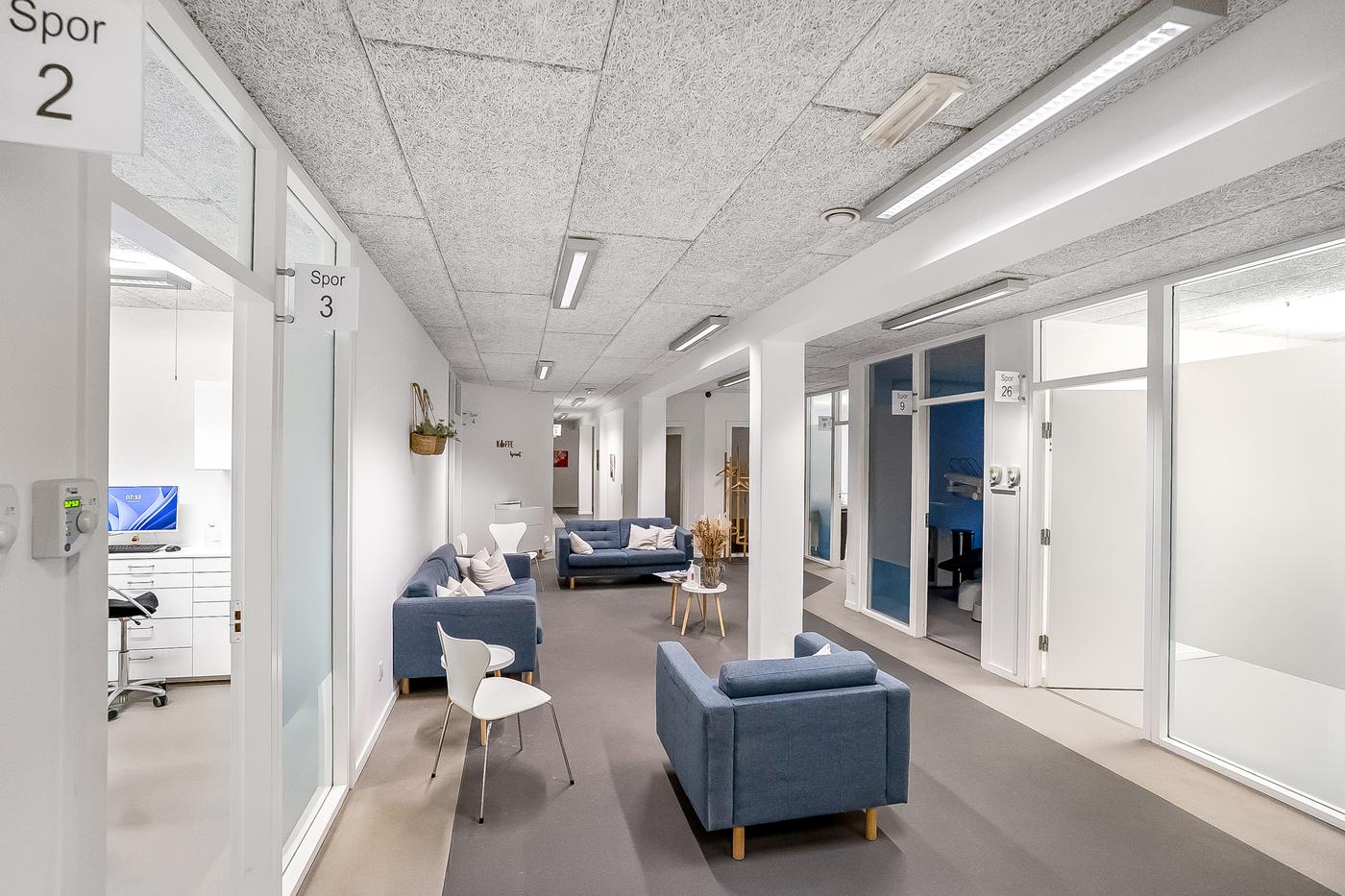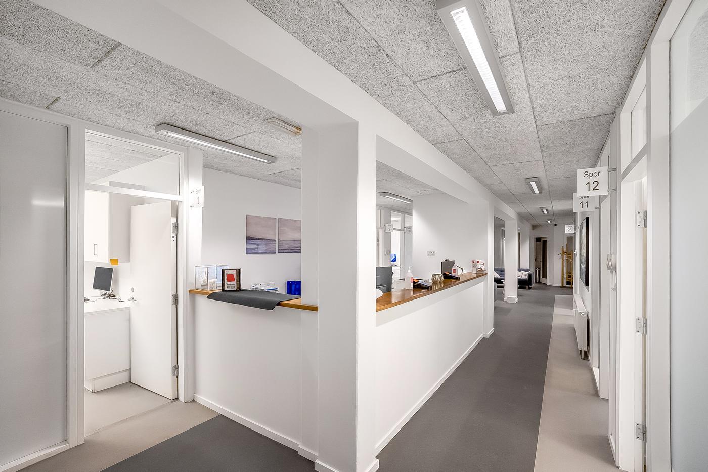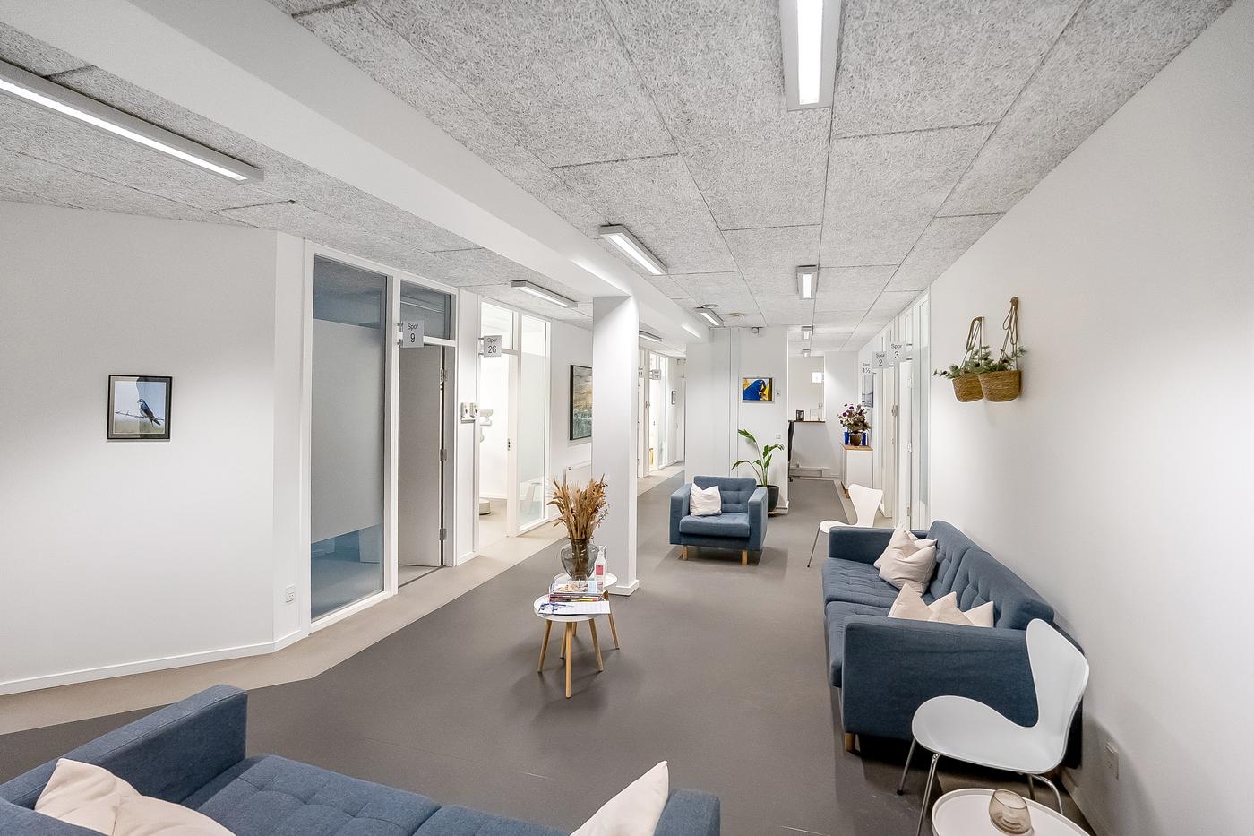 Ejendommen er opdelt i to lejemål. Det ene lejemål som er beliggende i stueplan, er udlejet til en tandlæge, der har været i ejendommen siden 2011. Lejemålet er istandsat og indrettet til lejer. Ved indgangen bliver man mødt af reception og gangareal, der giver adgang til de enkelte klinikker. Herudover er der venteareal, mødelokale, opbevaring og sterilrum i. Lejer har adgang til omklædning, kantineforhold samt vaskerum i kælderplan.