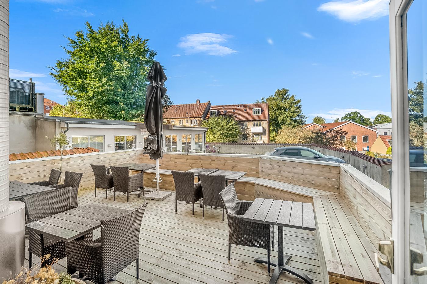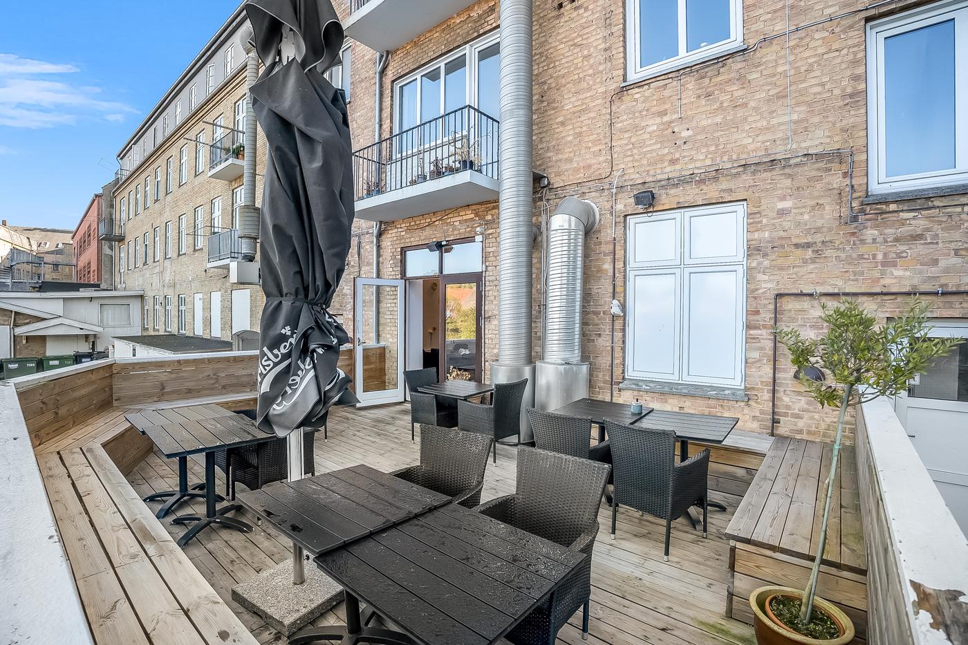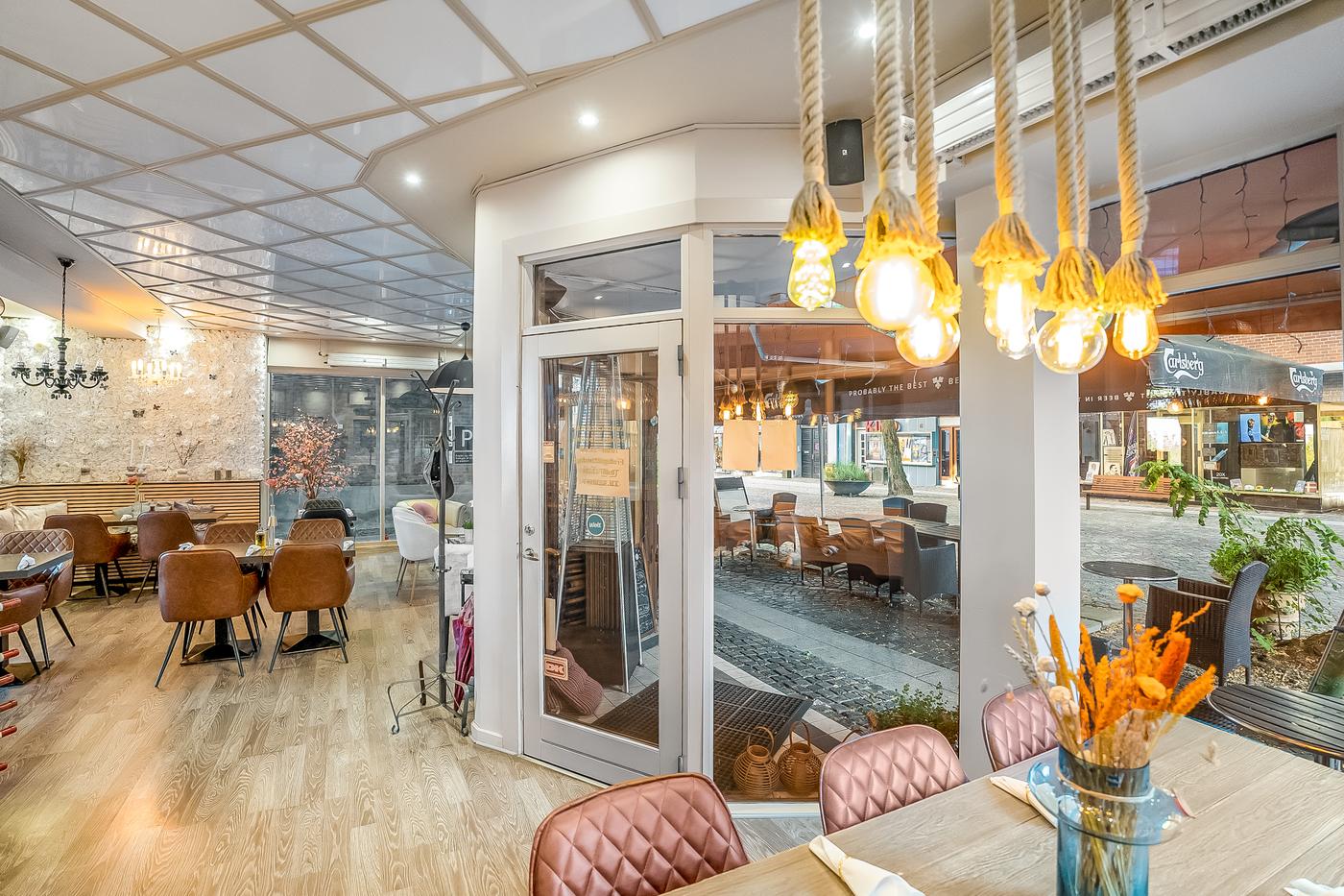 Caféen fremstår flot og indbydende med en hyggelig atmosfære, og der er nyligt etableret en tagterrasse, som giver perfekte rammer for udeservering i sommerhalvåret. Indendørs findes et stort og funktionelt storkøkken med alt nødvendigt inventar - inkl. opvaskestation - til at drive en professionel café eller restaurant.
