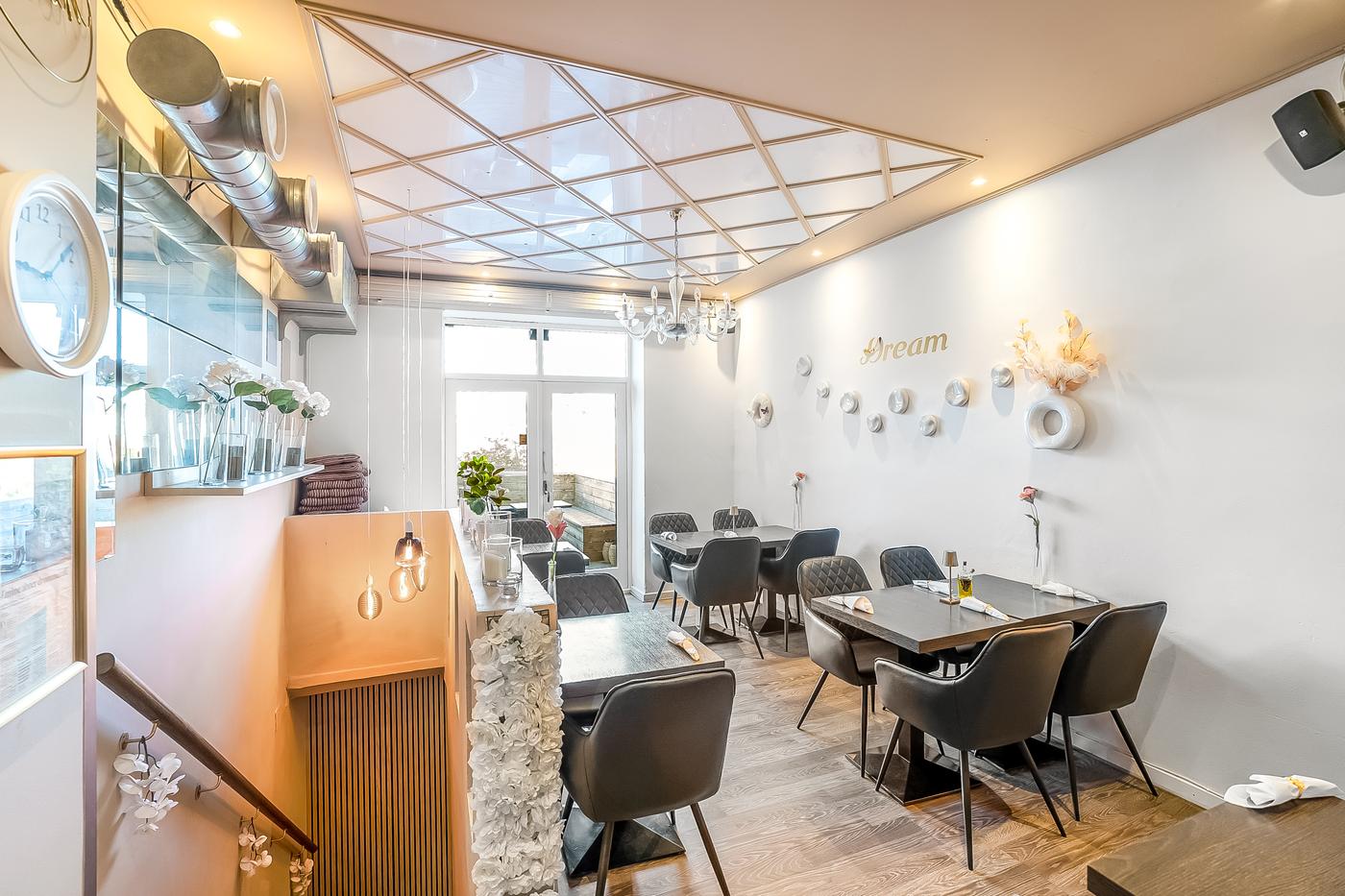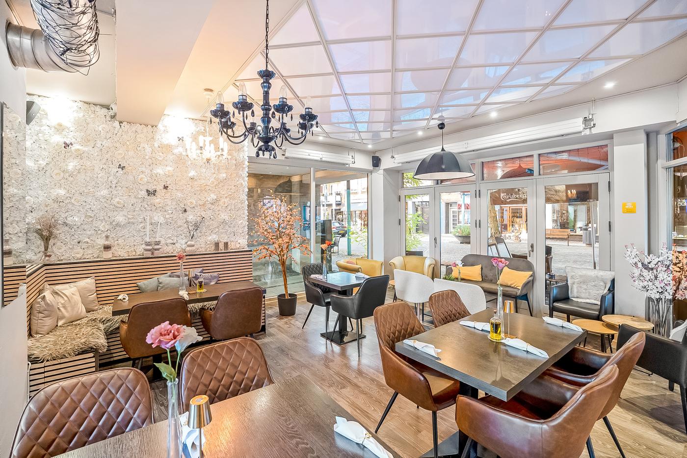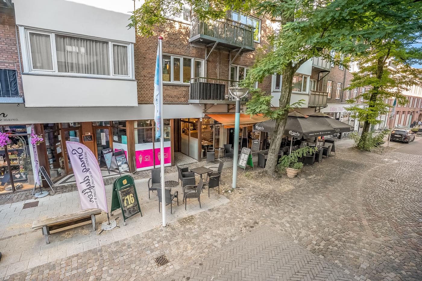 Caféen fremstår flot og indbydende med en hyggelig atmosfære, og der er nyligt etableret en tagterrasse, som giver perfekte rammer for udeservering i sommerhalvåret. Indendørs findes et stort og funktionelt storkøkken med alt nødvendigt inventar - inkl. opvaskestation - til at drive en professionel café eller restaurant.