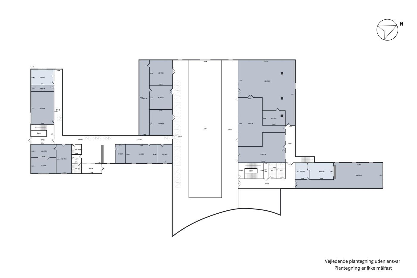Ejendommen er med indgang fra stor asfalteret parkeringsplads indrettet med et administrationsafsnit på ca. 340 m² indeholdende fordelingsgang og receptionsafsnit, diverse kontorer og mødelokale, direktionskontor, toiletafsnit samt mindre køkken.