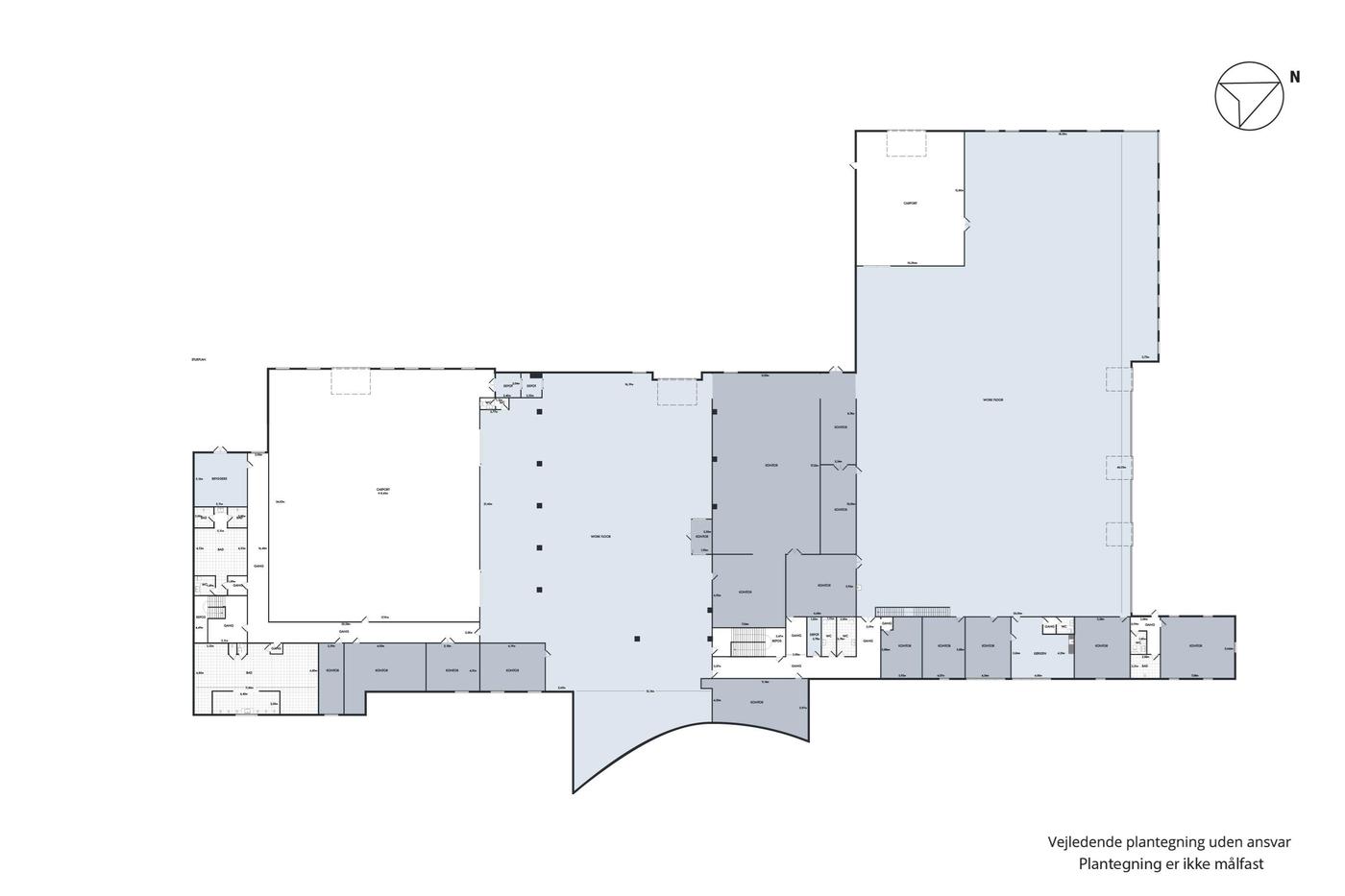 Produktionsafsnittet er opdelt i flere afsnit med forskellige loftshøjder på hhv. 6,6 m., 3,5 m. og 7,9 m. Afsnittet med trykkerimaskinen har 18,5 m. til loft og gennembryder etagedæk i en del af afsnittet og her forefindes en kraftig loftskran for udnyttelse af de øvre dæk. Der er adgang til alle afsnit via porte hvoraf en enkelt med læsserampe. Produktionsareal 3.962 m².