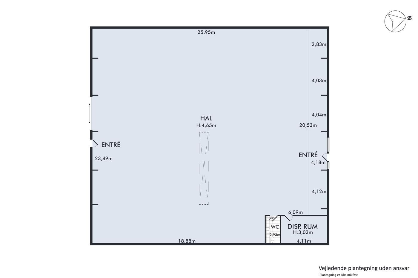 Det samlede etageareal andrager 1.200 m² og er delt i midten således der er to haller á 600m², hvilket er med til at sikre mulighed for en fleksibel indretning tilpasset forskellige behov, evt med mulighed for udlejning af dele af ejendommen og derved supplerende lejeindtægter.