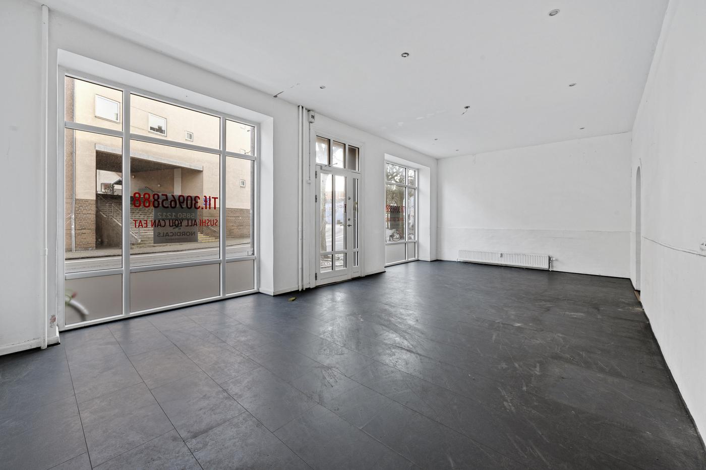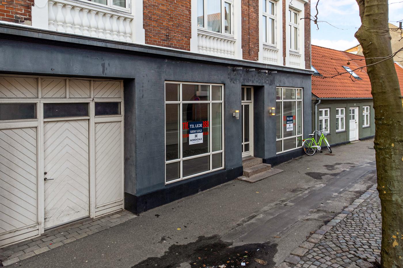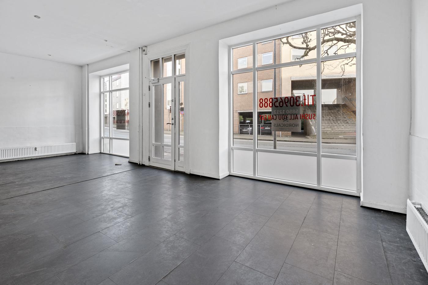 Lokalet er indrettet med store udstillingsvinduer og indgangsparti mod Smedegade, hvilket giver god synlighed.
