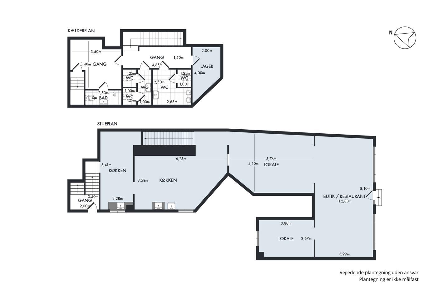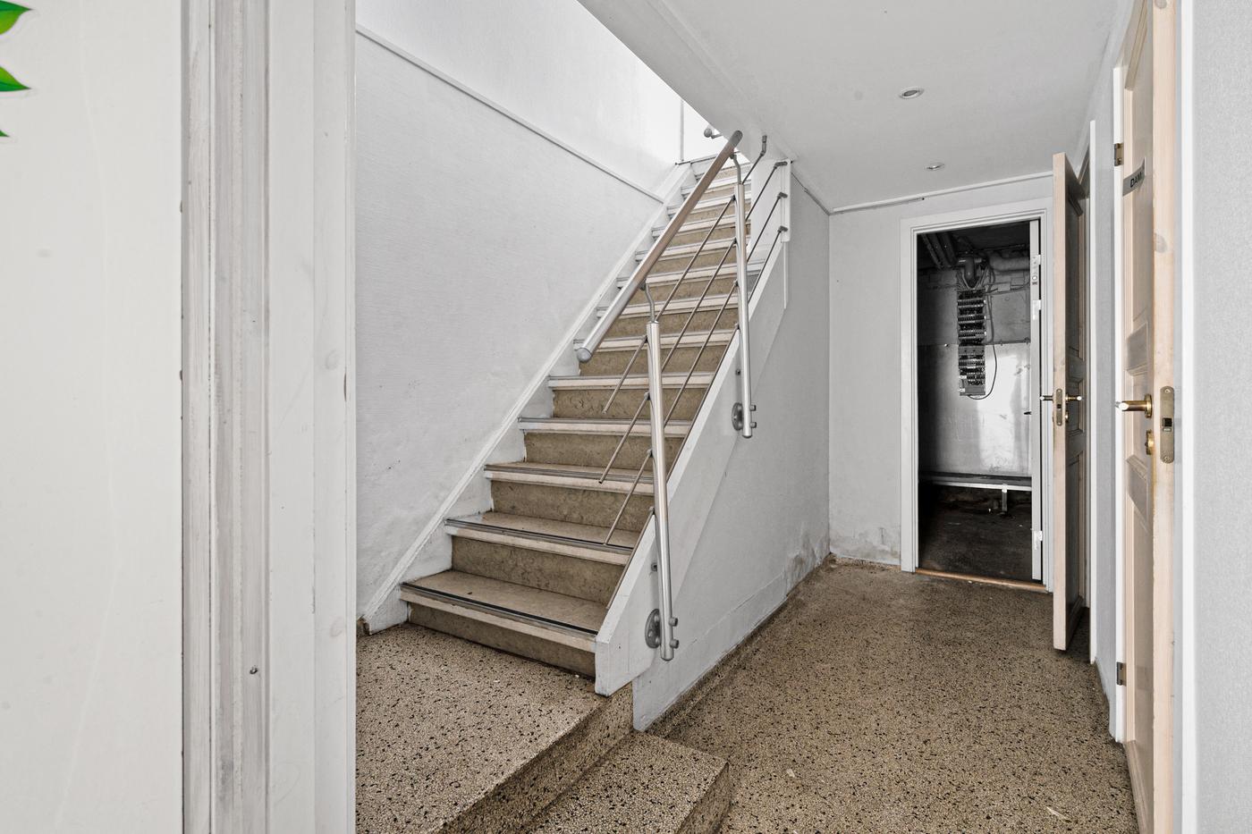Toiletter og lager findes i kælderen.