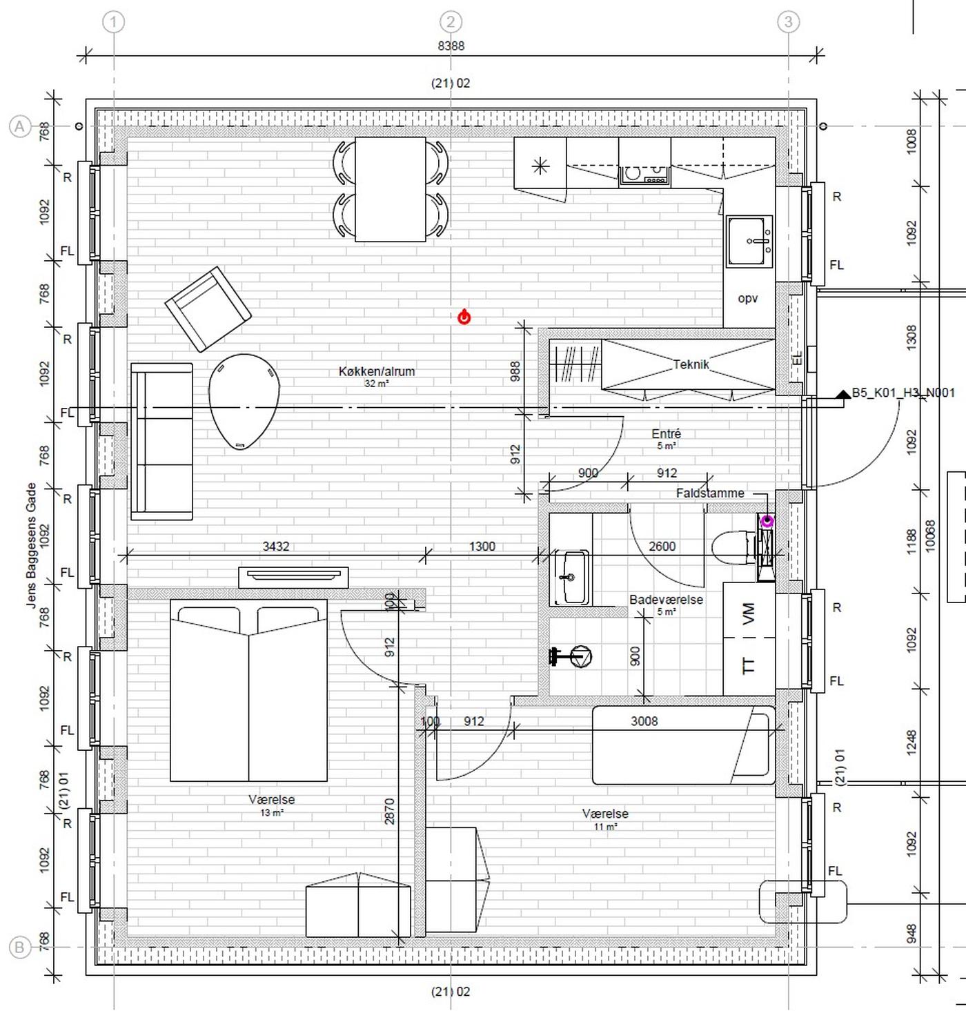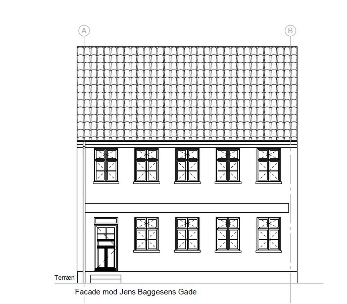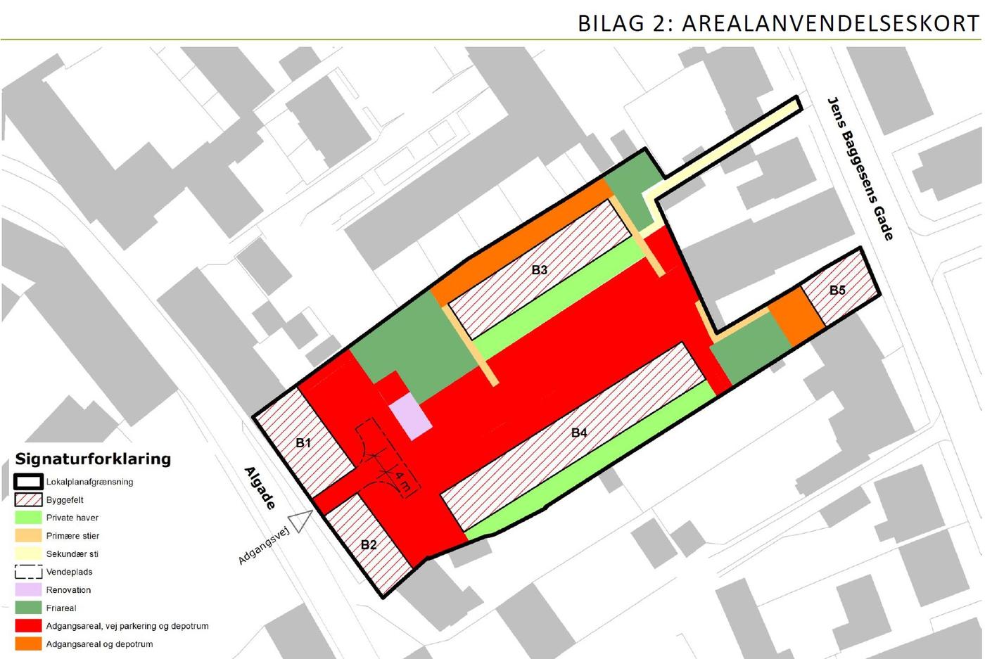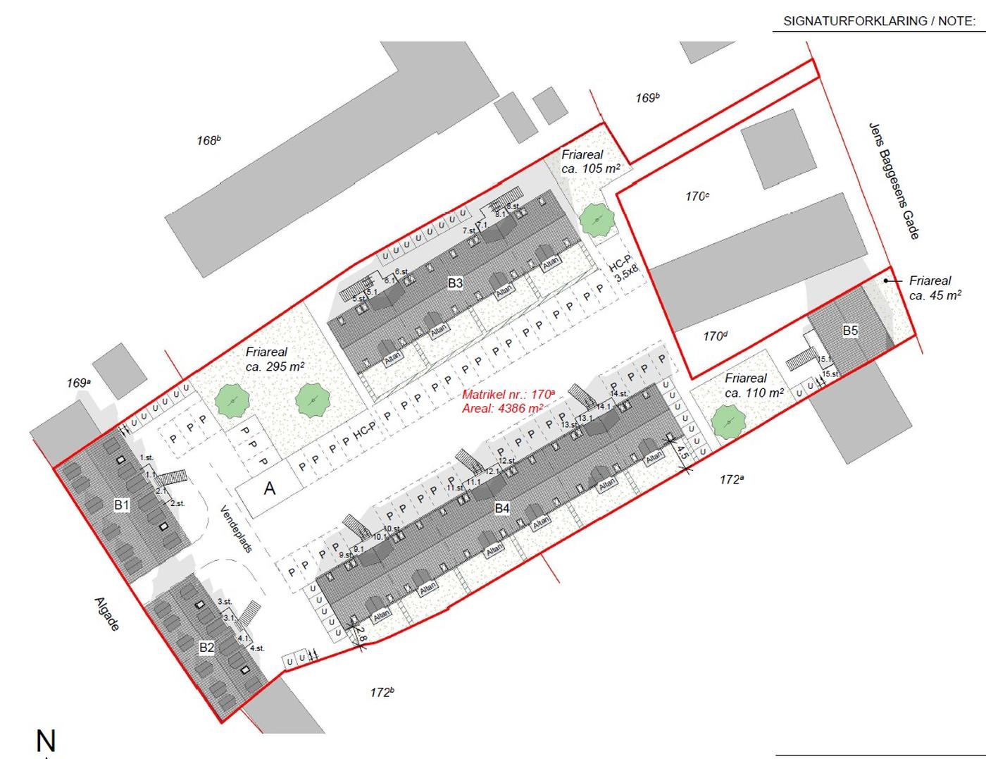 Bebyggelsen er planlagt med to forhuse mod Algade i halvandet plan, hver med fire boliger, samt et forhus mod Jens Baggesens Gade i to etager med to boliger. I det grønne gårdrum opføres yderligere to bygninger i halvandet plan med i alt 20 boliger. Alle boliger får egen have eller sydvendt altan, og gårdrummet indrettes med friarealer, parkeringspladser, depotrum og plads til renovation.