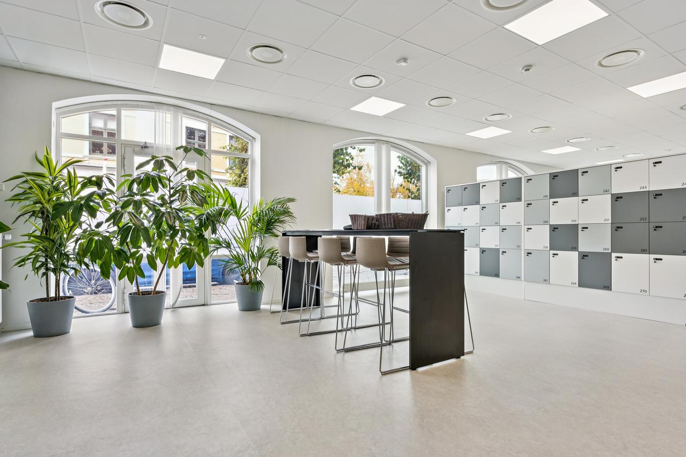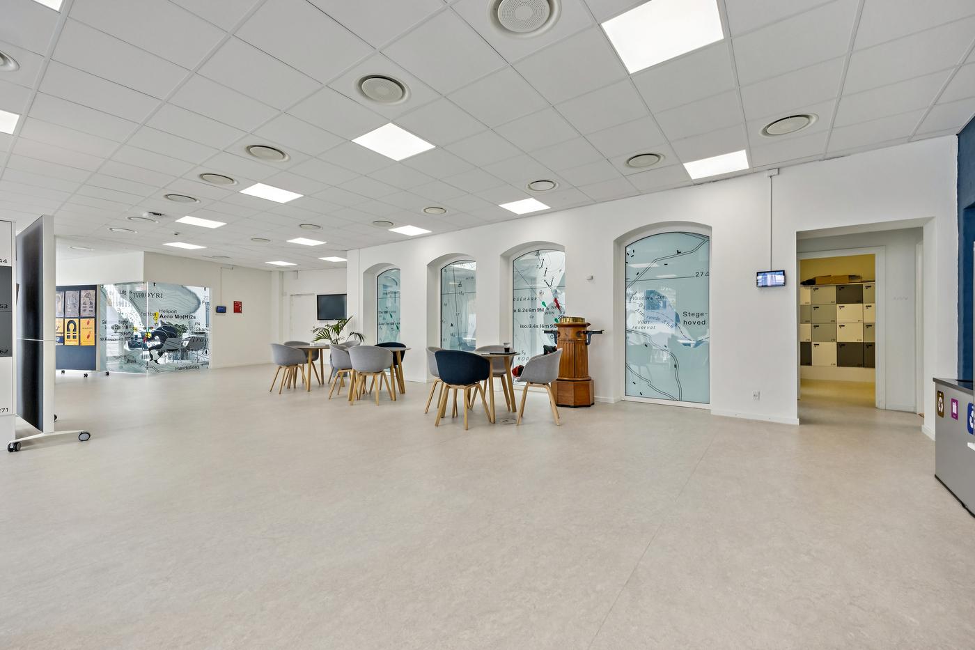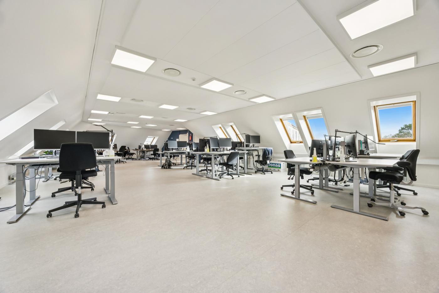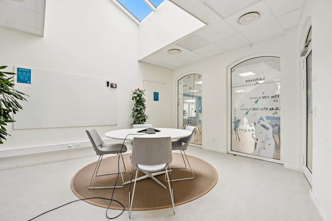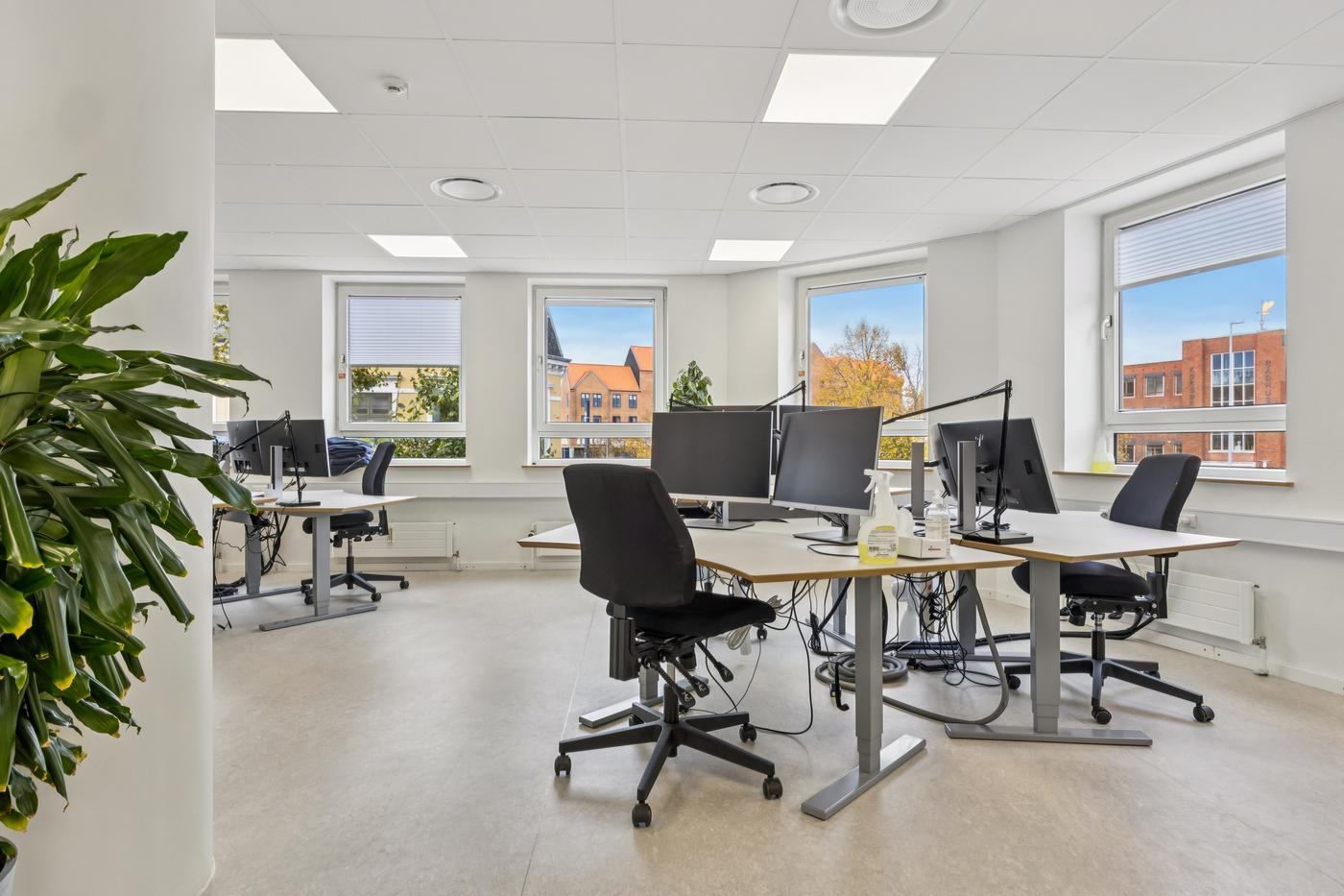 Dette attraktive kontorlejemål byder på lyse og indbydende rammer med store vinduespartier, der sikrer et naturligt lysindfald hele dagen.